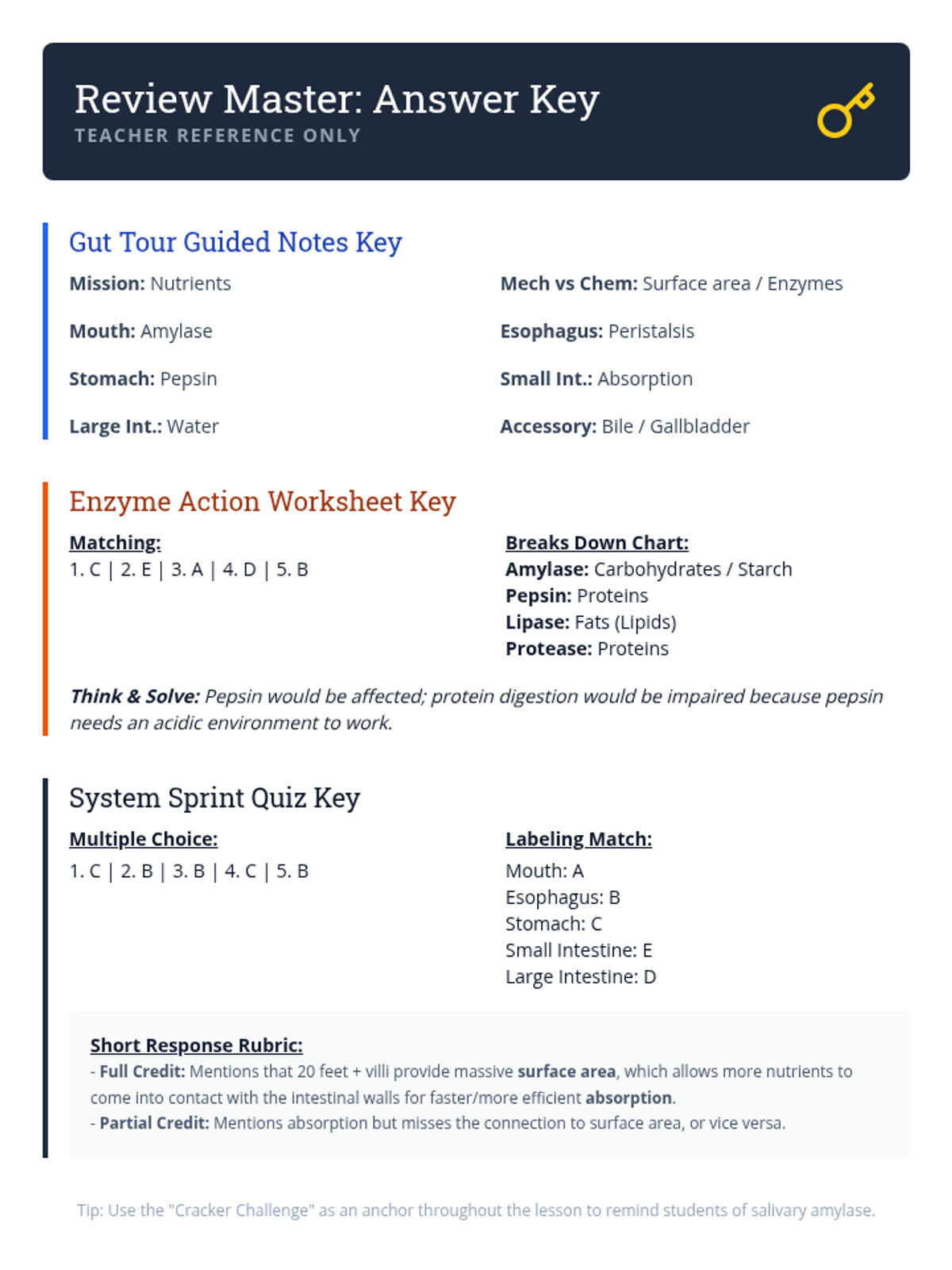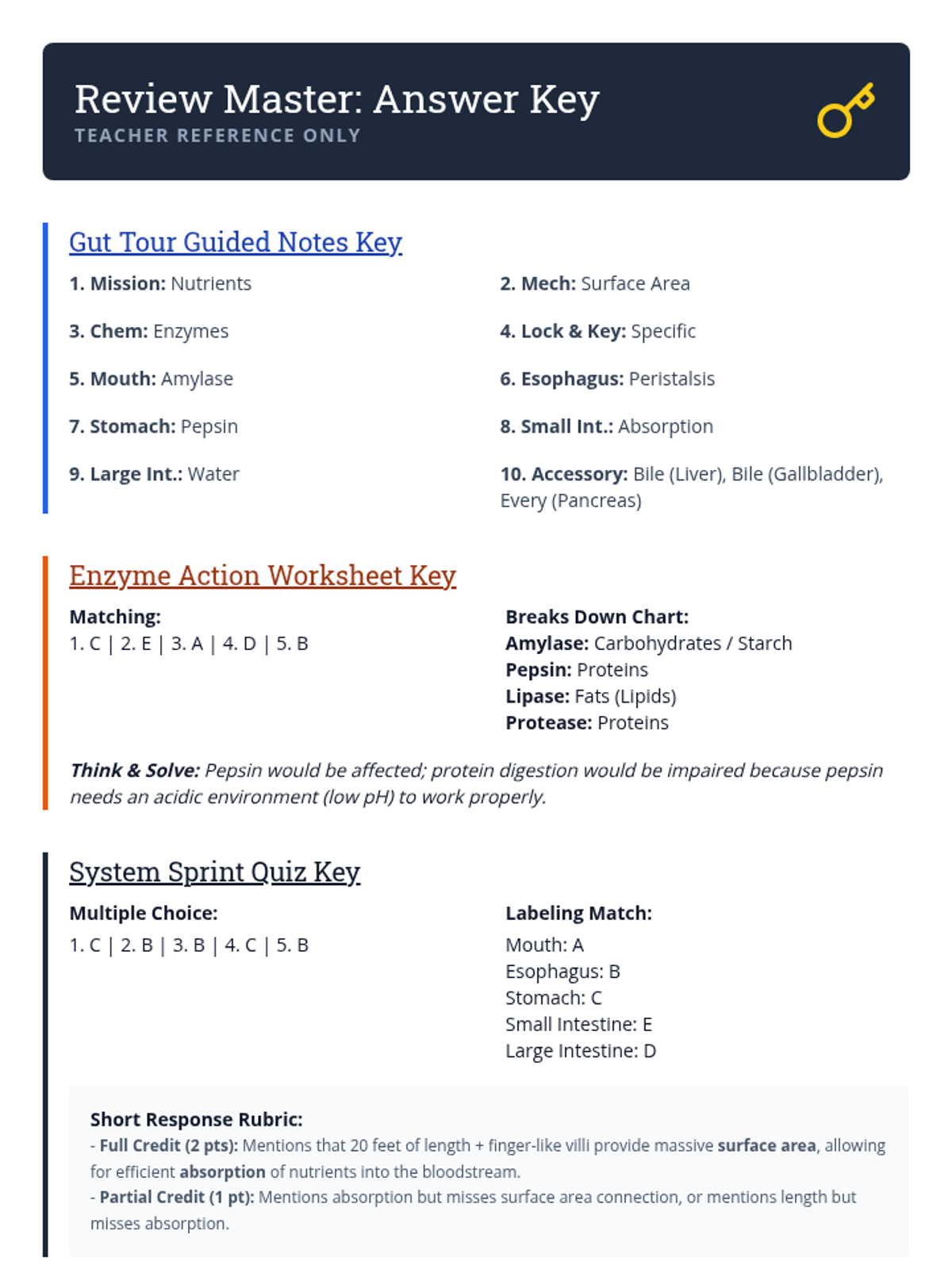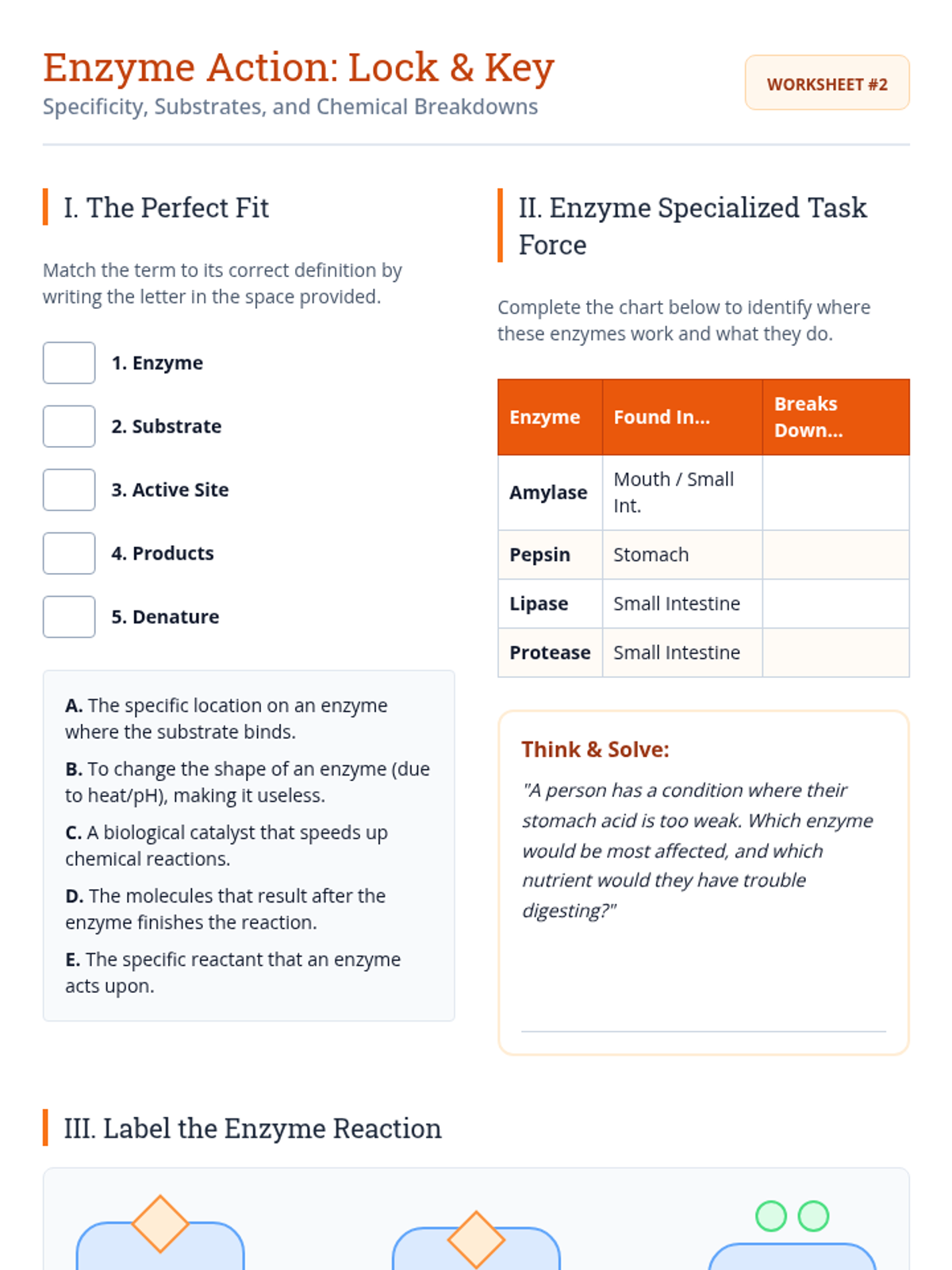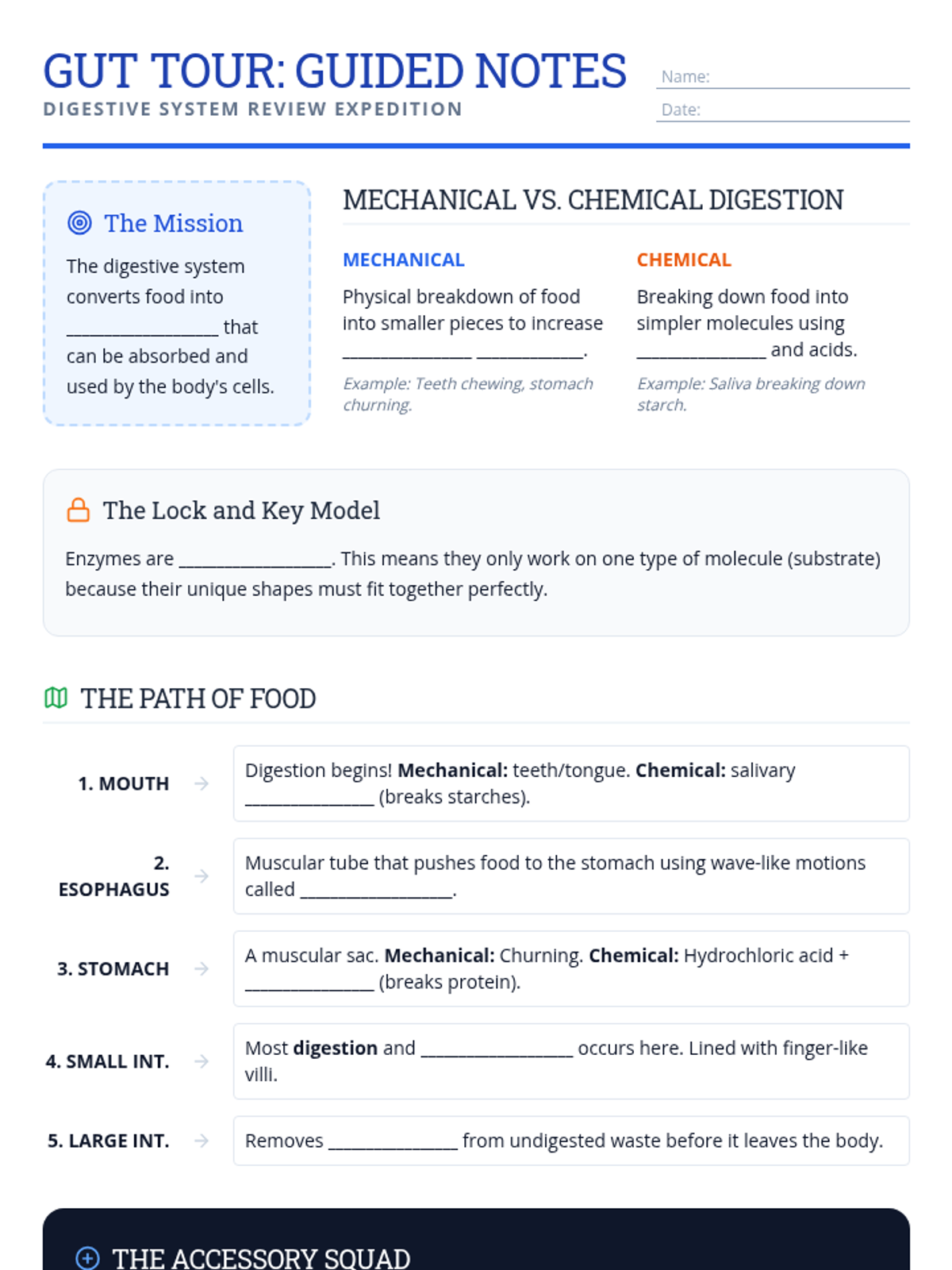 A comprehensive review lesson on the digestive system and enzyme function, focusing on the path of food, mechanical vs. chemical digestion, and enzyme specificity through interactive activities and guided notes.