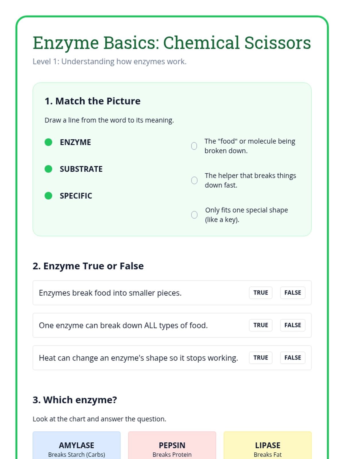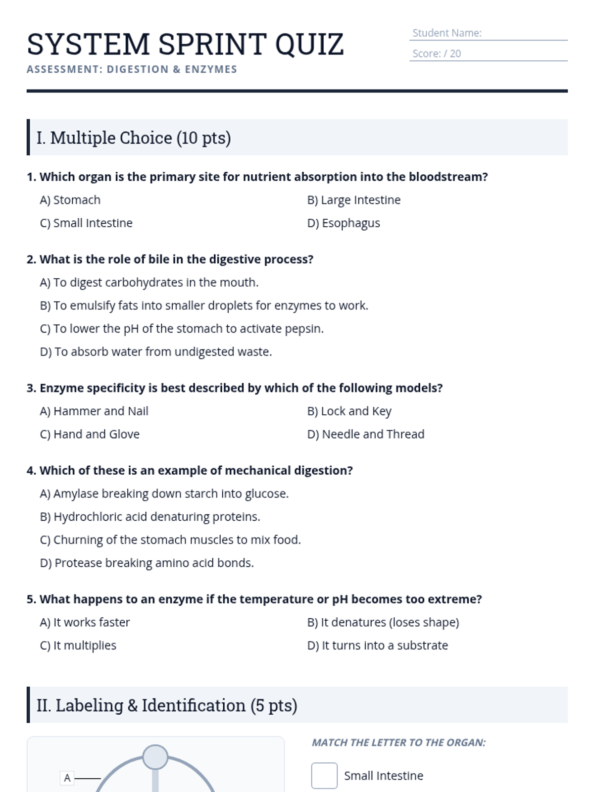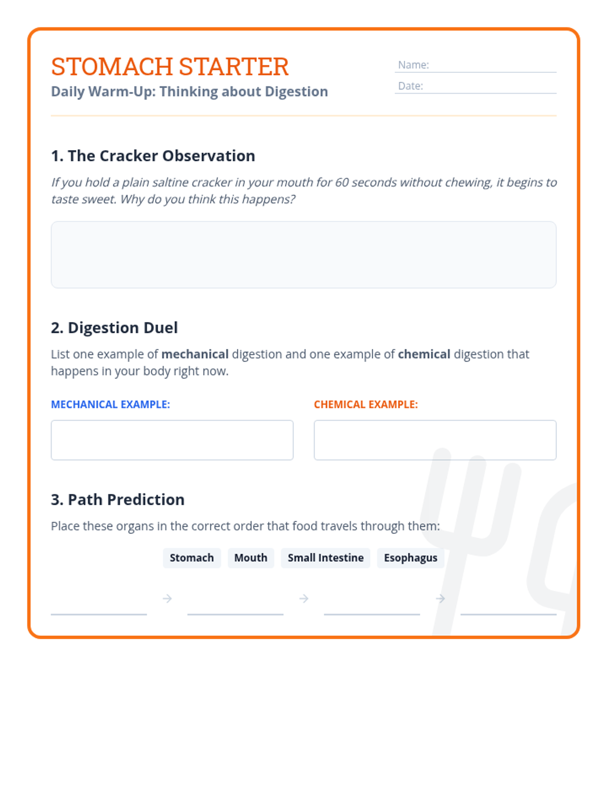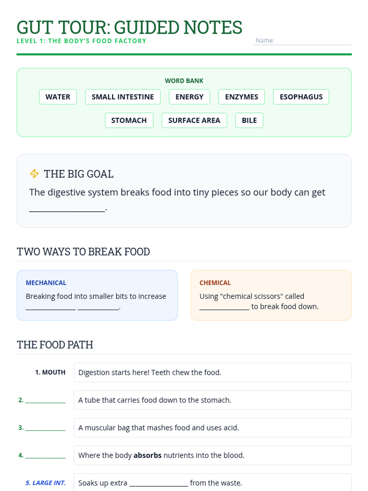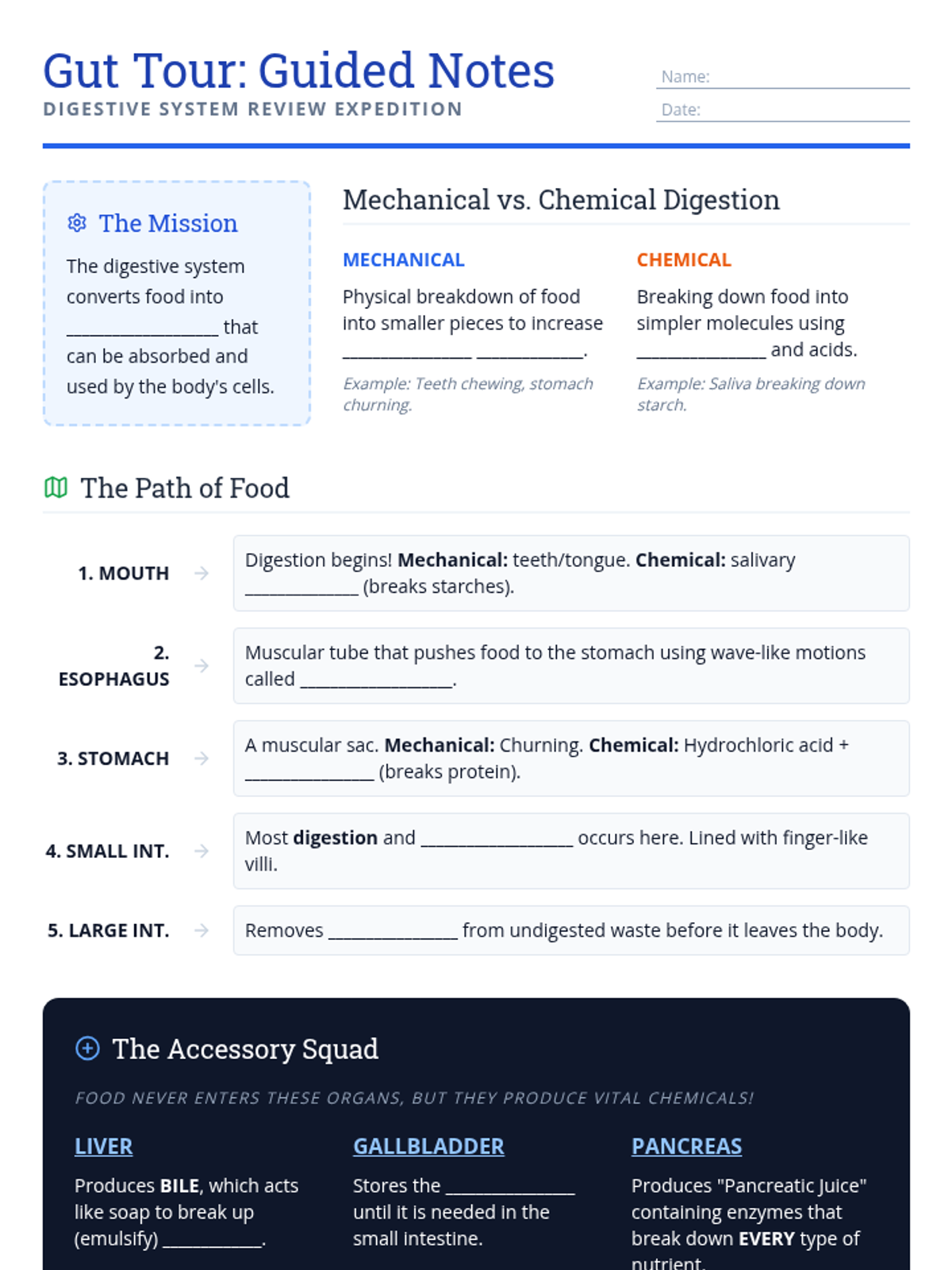 A comprehensive review lesson on the digestive system and enzyme function, focusing on the path of food, mechanical vs. chemical digestion, and enzyme specificity through interactive activities and guided notes.