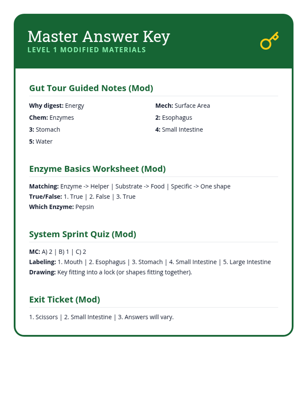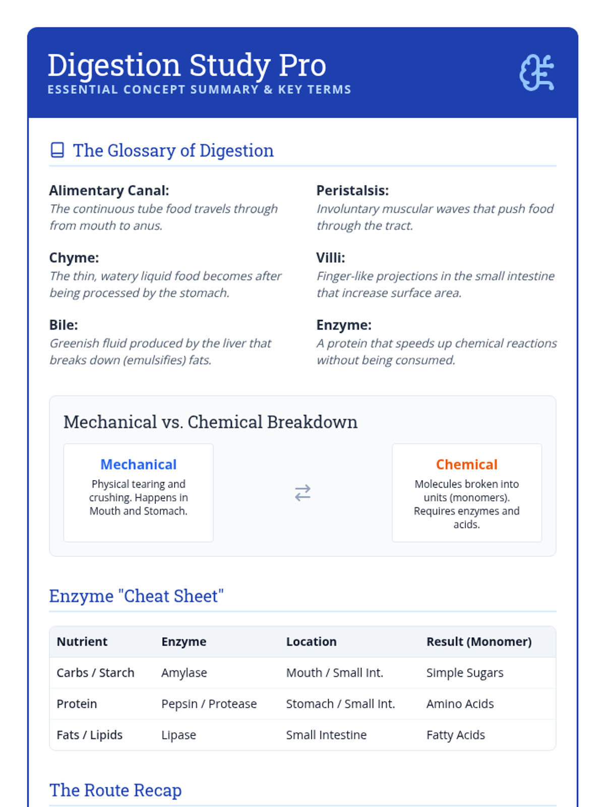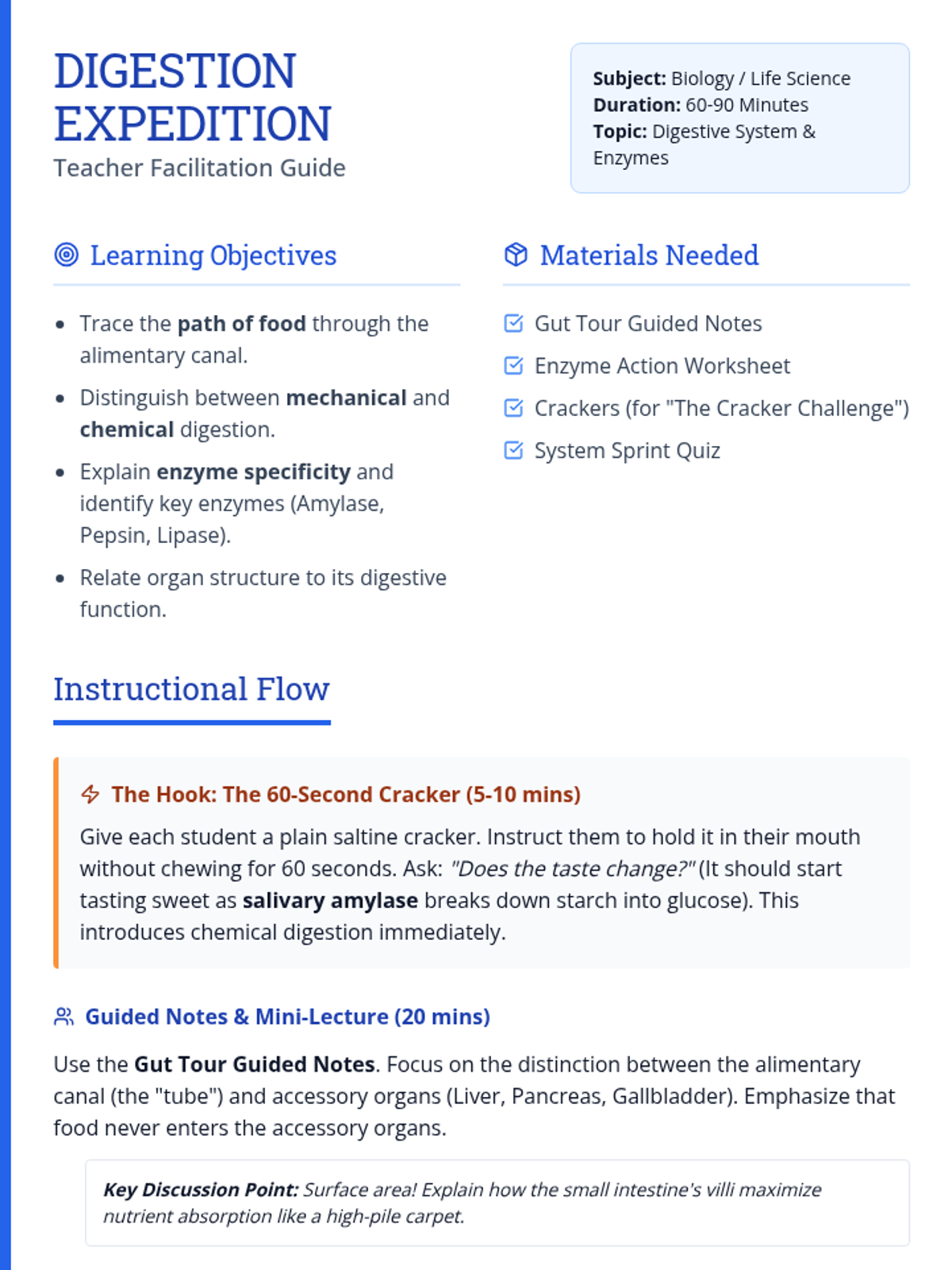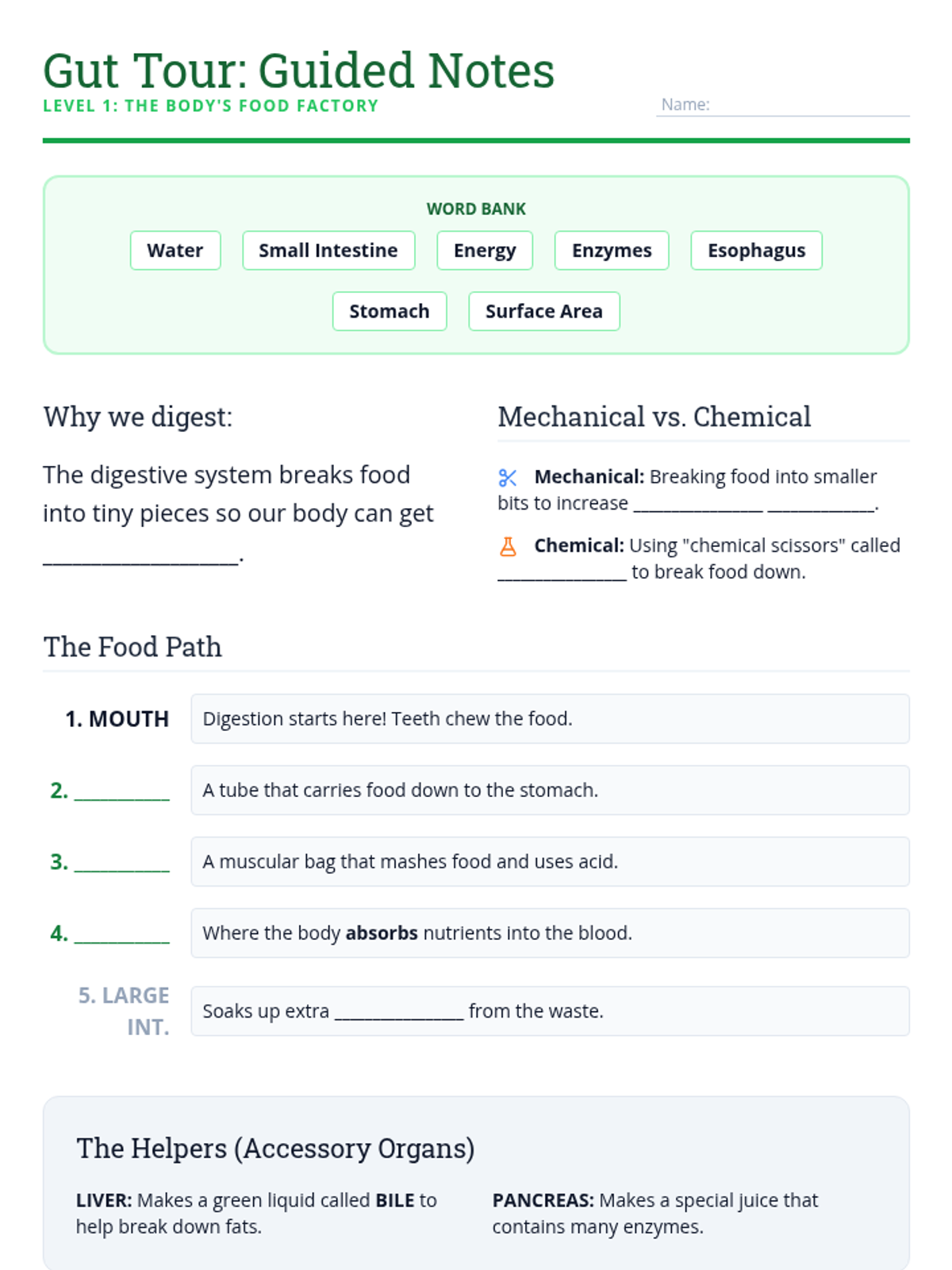 A comprehensive review lesson on the digestive system and enzyme function, focusing on the path of food, mechanical vs. chemical digestion, and enzyme specificity through interactive activities and guided notes.