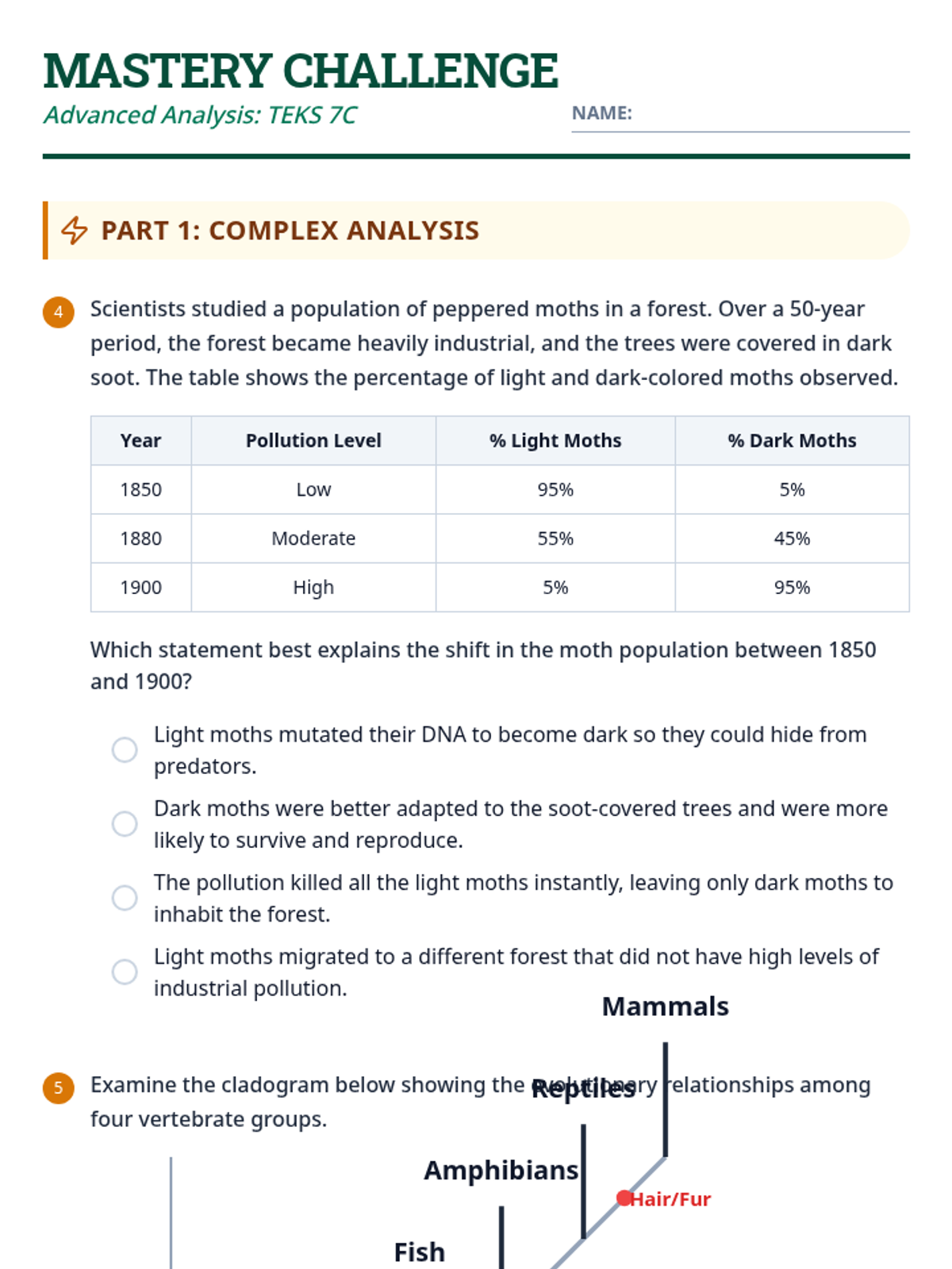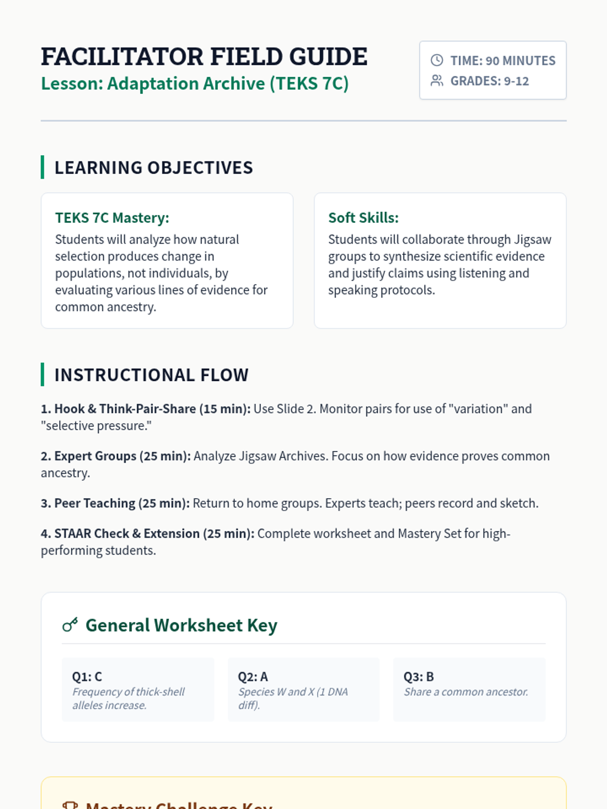 This lesson explores how natural selection drives population changes and evaluates the evidence for common ancestry. It features a hands-on jigsaw activity and STAAR-aligned practice questions to master TEKS 7C.
