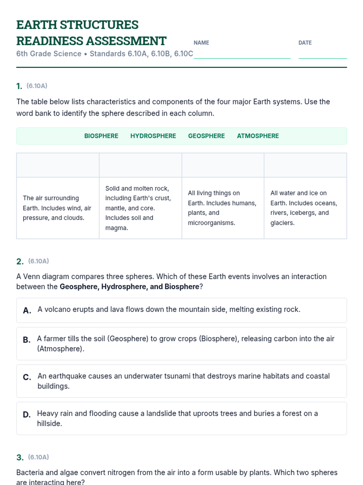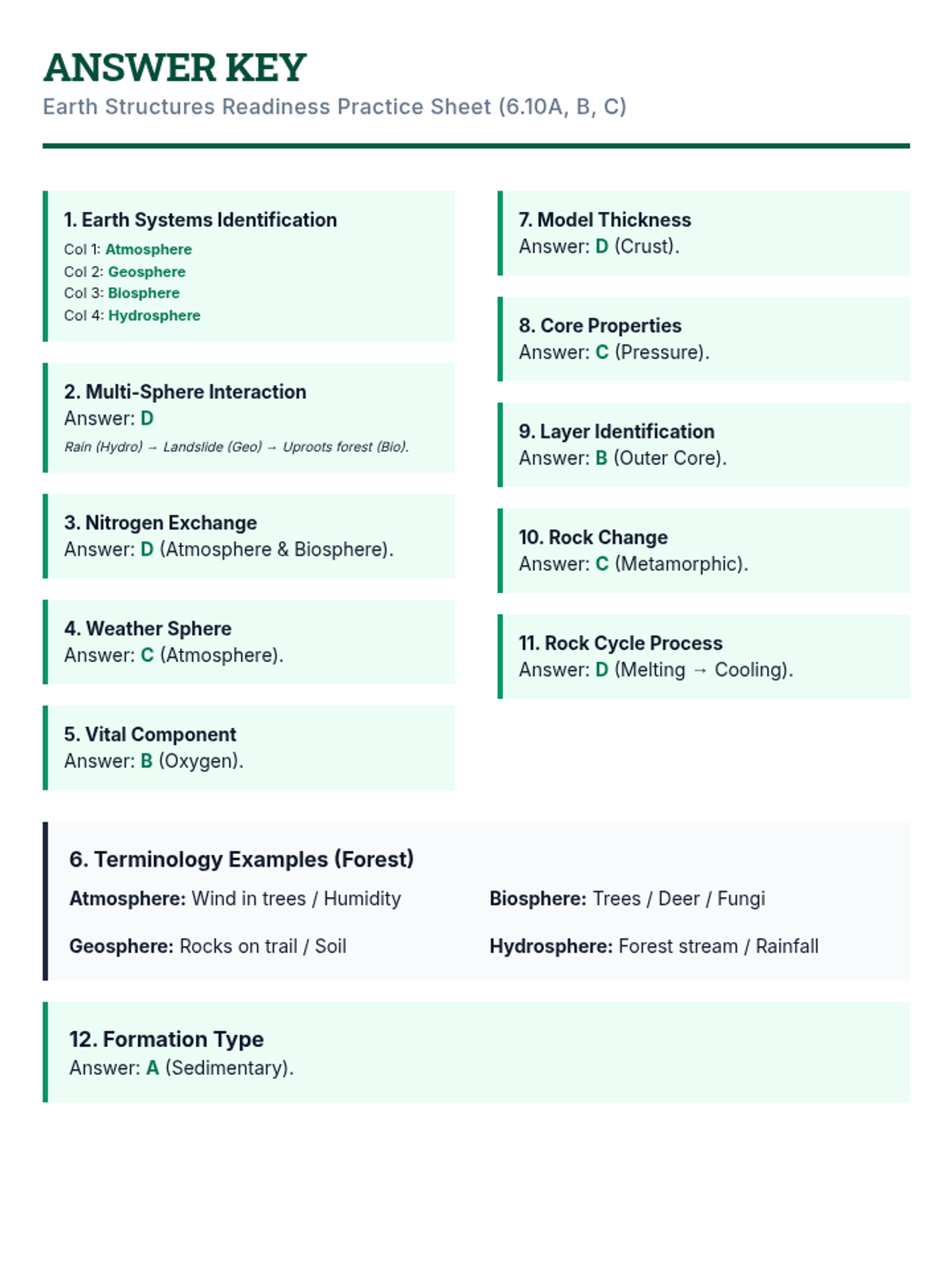 A movement-based scavenger hunt where students solve 'planetary mysteries' covering Earth's spheres, internal layers, and the rock cycle. This lesson includes task cards and a structured recording sheet for 6th grade science review.