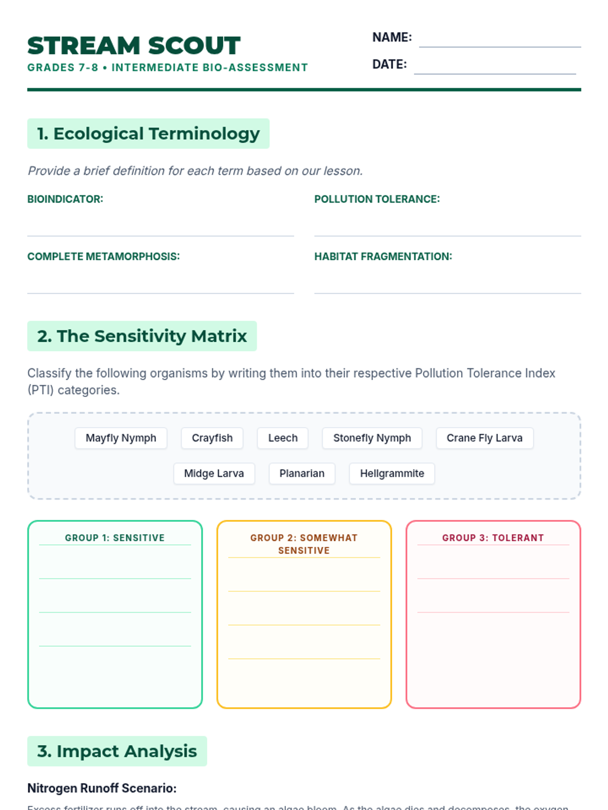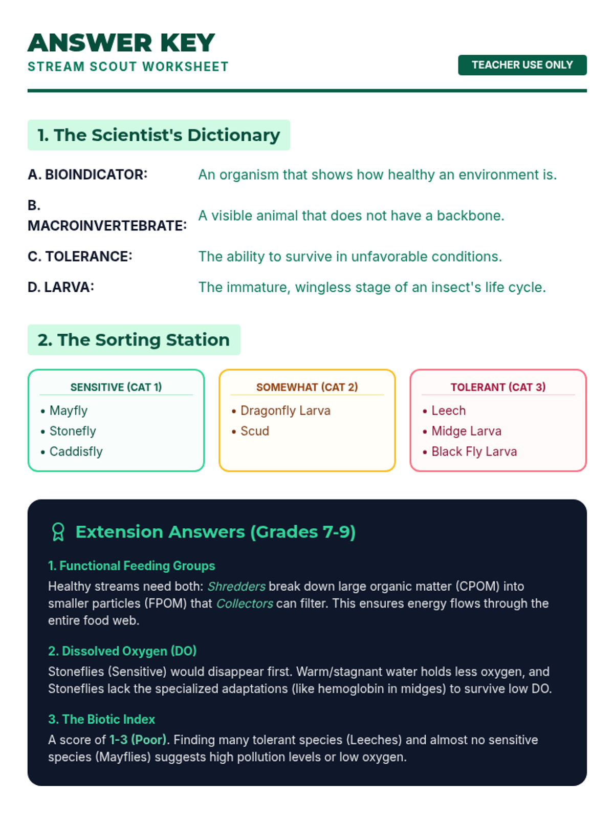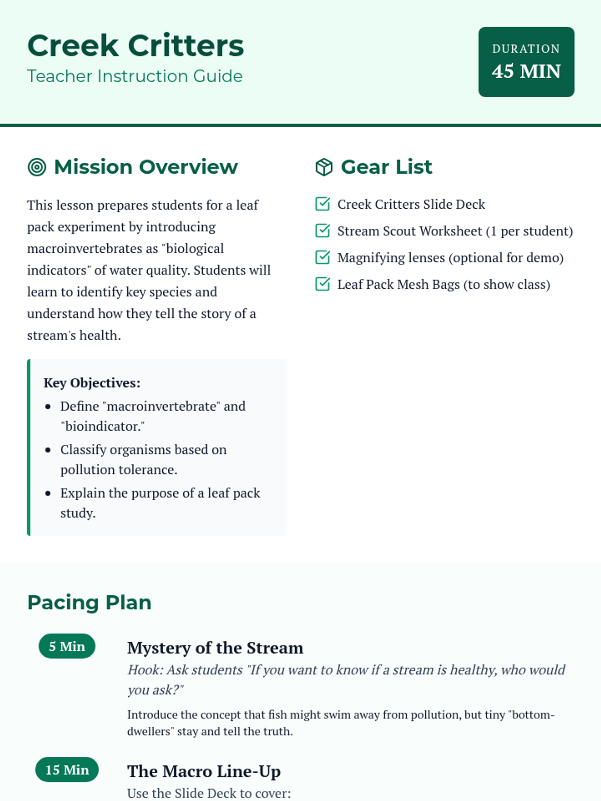 A 45-minute introductory lesson on macroinvertebrates and their role as bioindicators, preparing students for a leaf pack study. Students will learn key ecosystem vocabulary and identification techniques across grades 5-9.