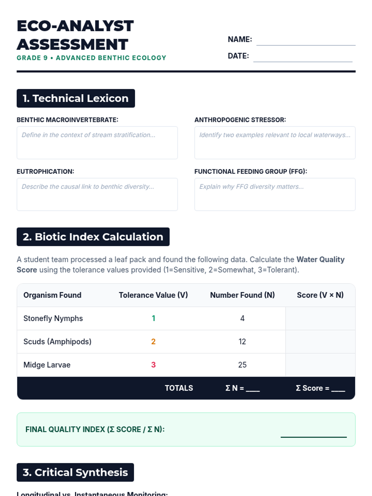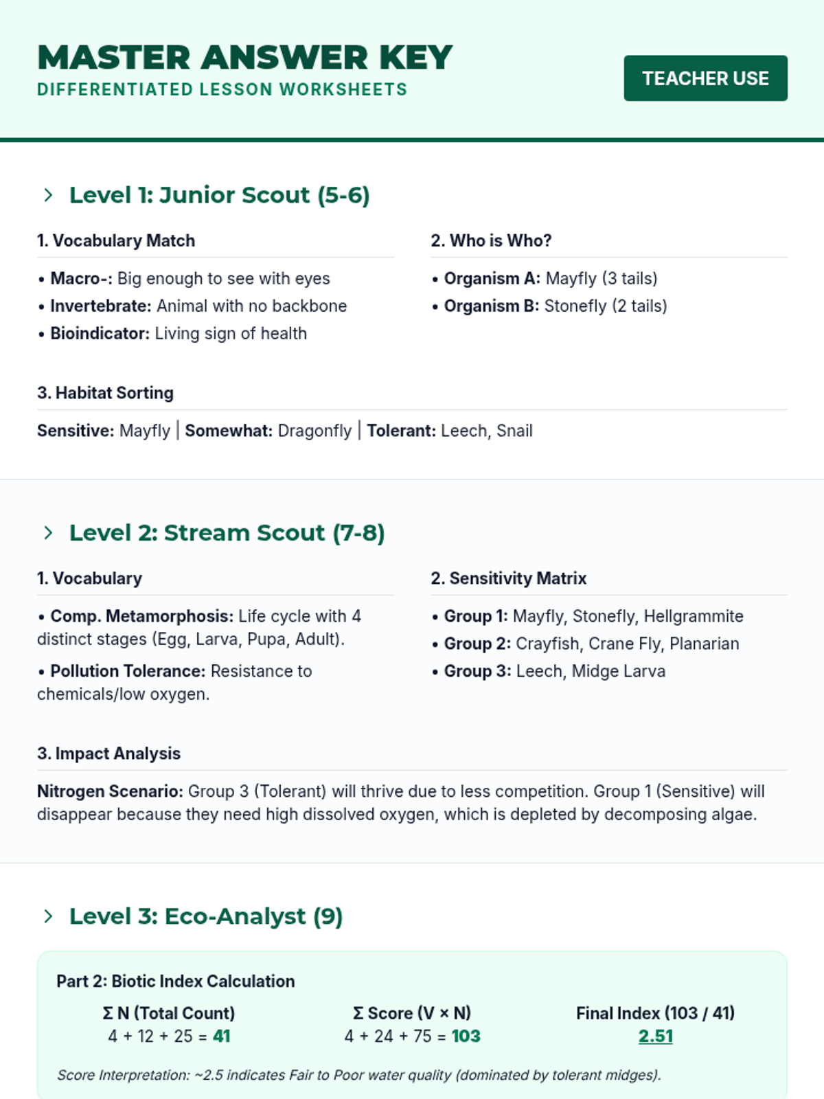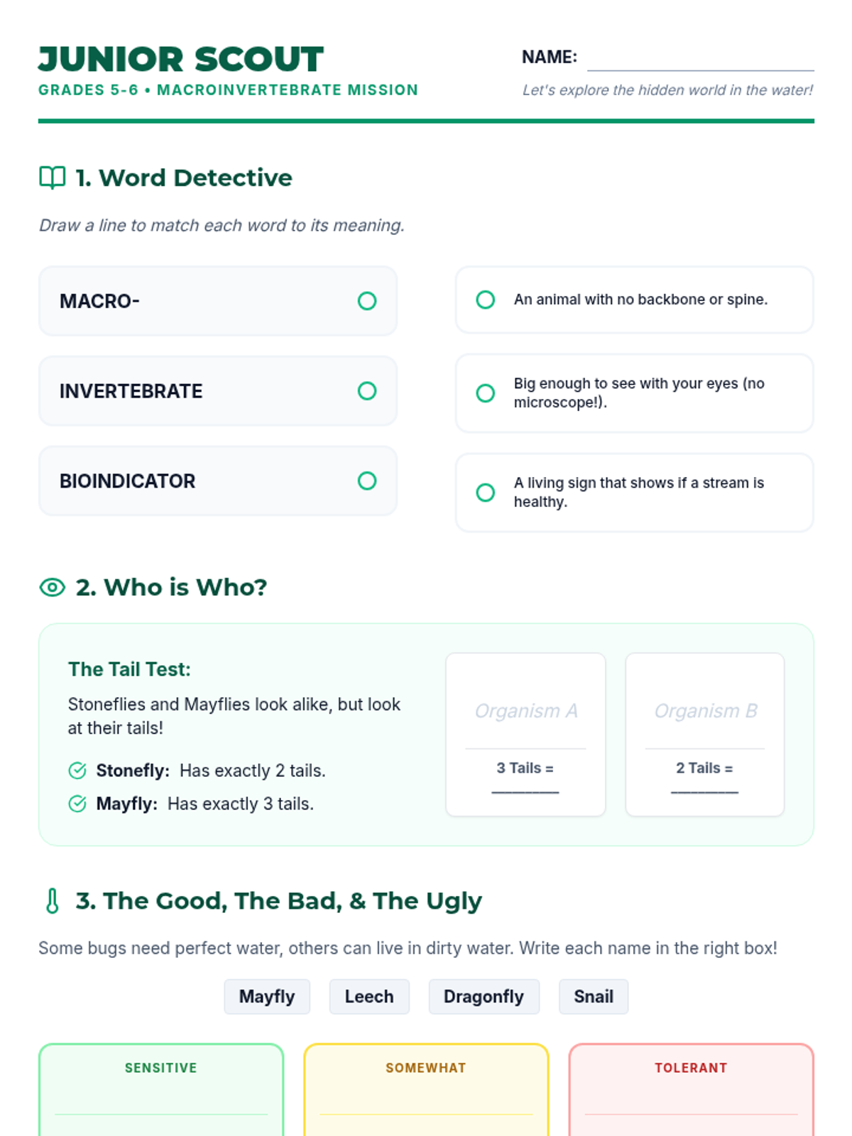 A 45-minute introductory lesson on macroinvertebrates and their role as bioindicators, preparing students for a leaf pack study. Students will learn key ecosystem vocabulary and identification techniques across grades 5-9.