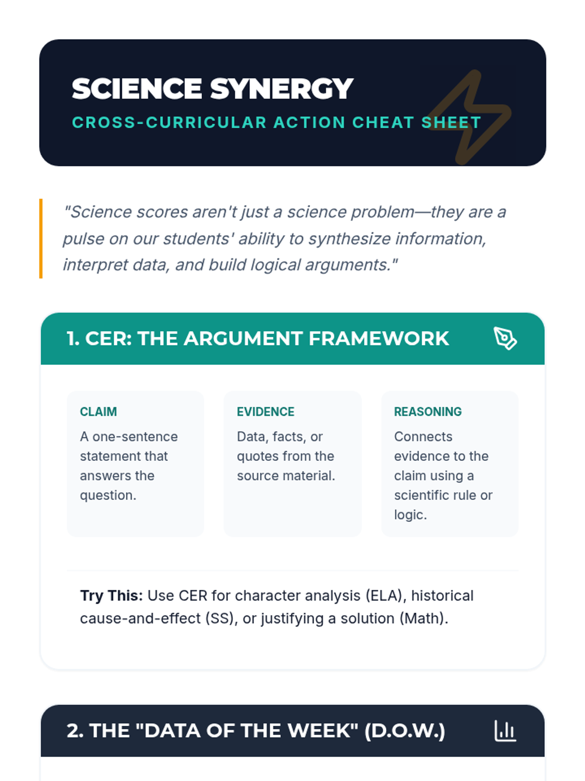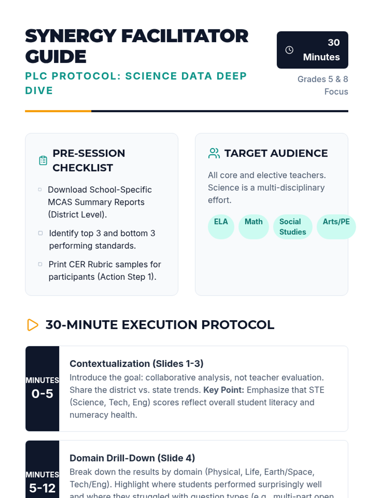 A 30-minute PLC session designed to analyze Grade 5 and 8 MCAS Science results, identifying cross-curricular opportunities for improvement through data-driven discussion and actionable teaching strategies.