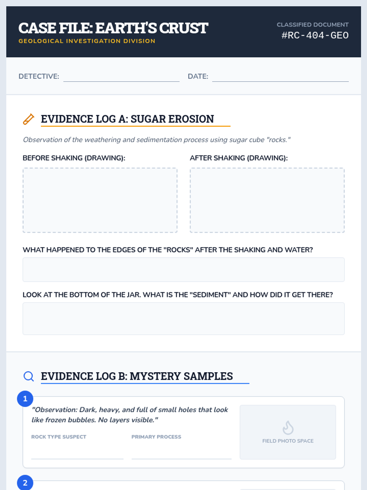 Students become geological detectives to investigate how rocks change over time through heat, pressure, and erosion, culminating in a mystery-solving identification challenge.