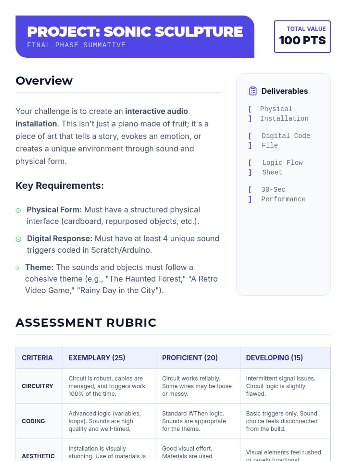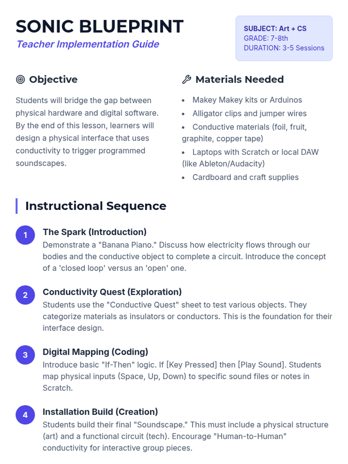 Students explore the intersection of physical electronics and digital audio by building interactive sound installations. They will learn about conductivity, circuit logic, and basic programming to transform everyday objects into musical instruments.