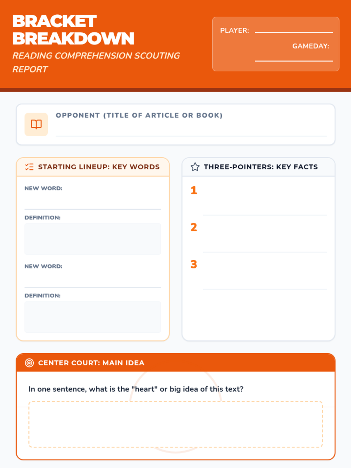 A reading comprehension lesson centered around March Madness, featuring a versatile worksheet that can be used with any basketball-related text.
