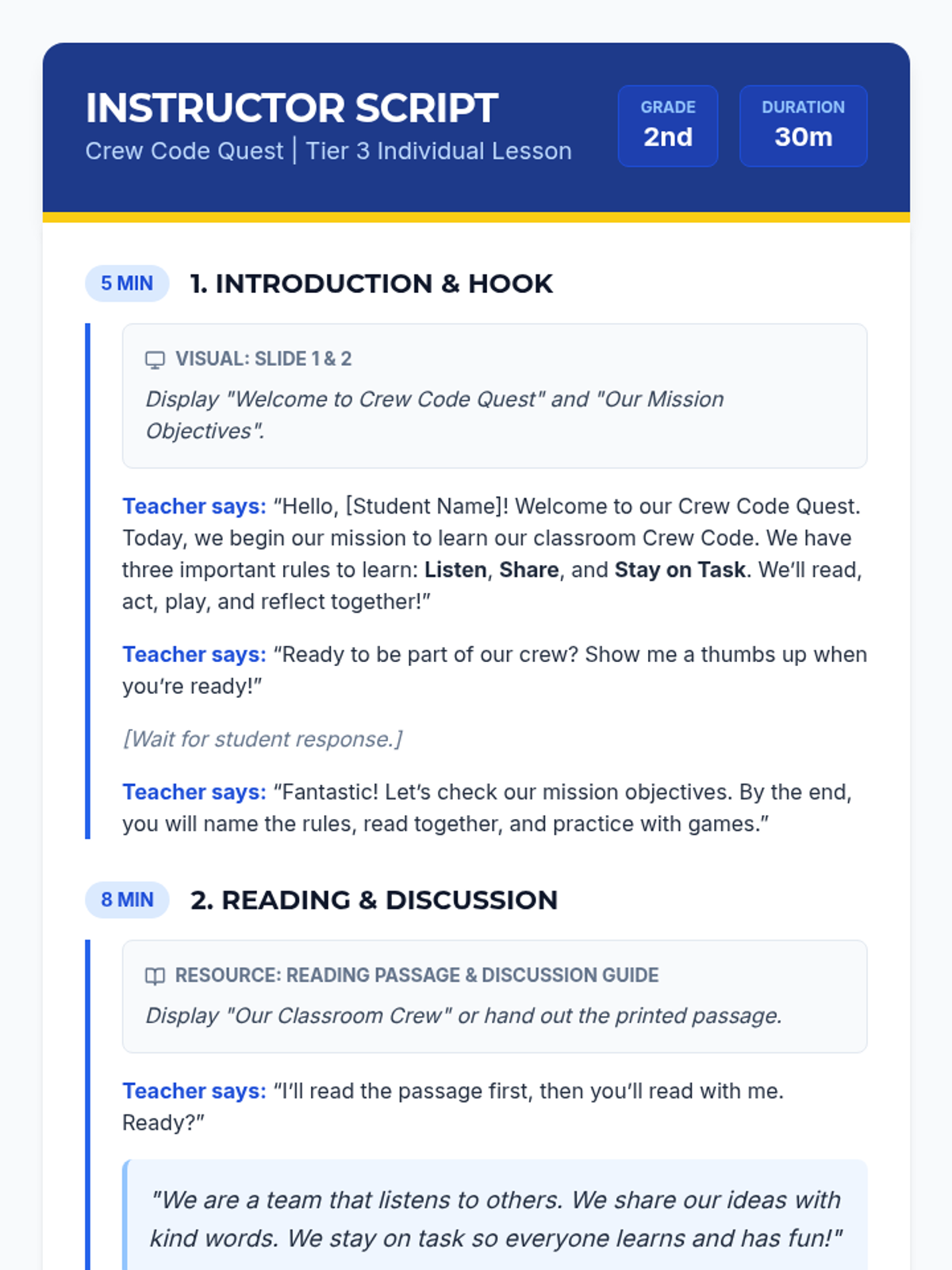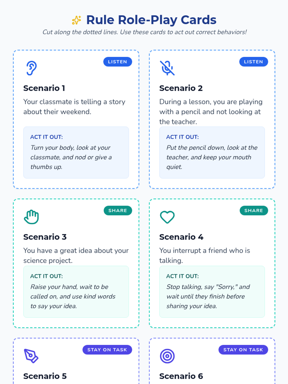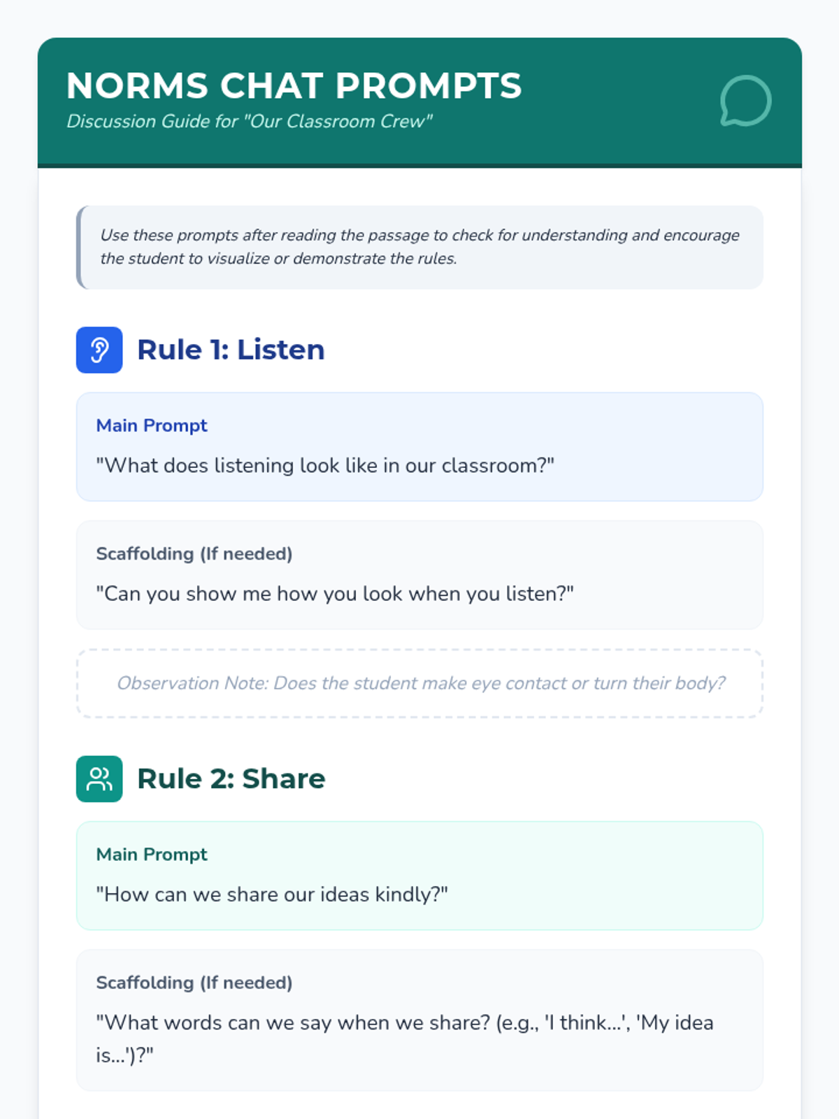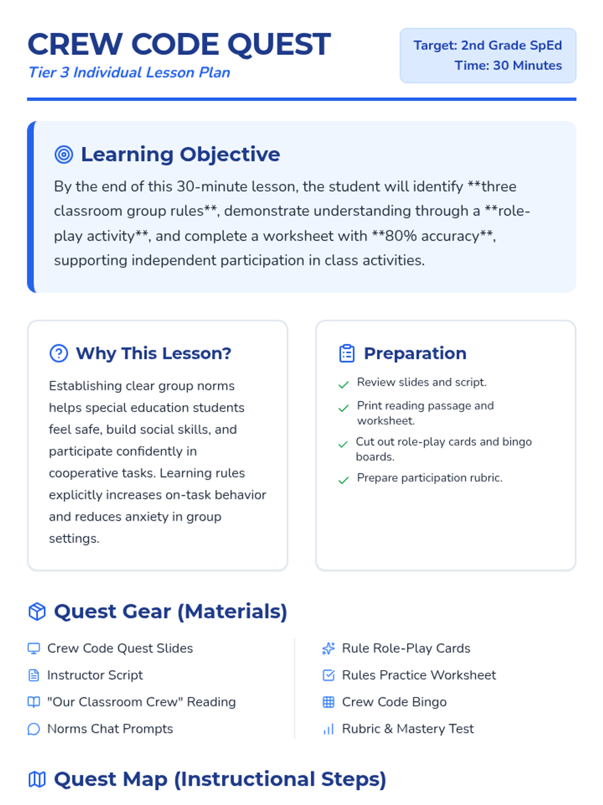 In this 30-minute Tier 3 individual lesson, a 2nd grade special education student will learn essential group rules and norms (Listen, Share, Stay on Task) through reading, role-play, and engaging activities. This lesson builds social skills and confidence for group participation.