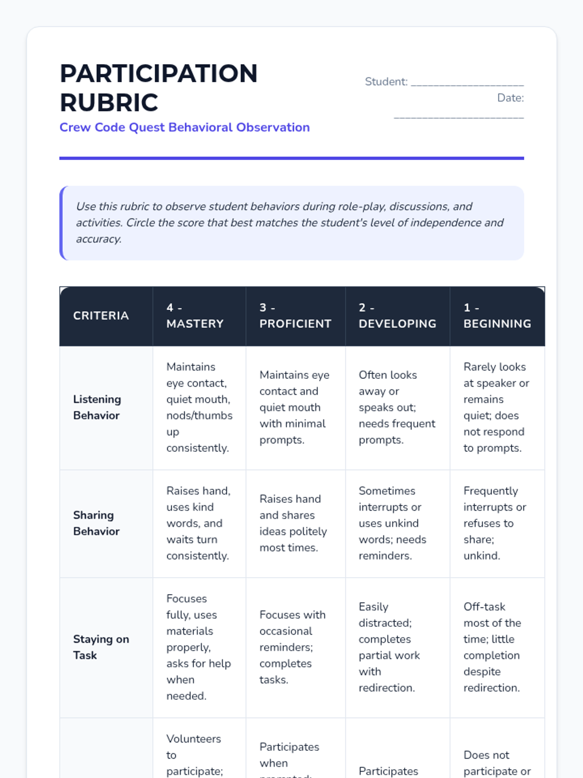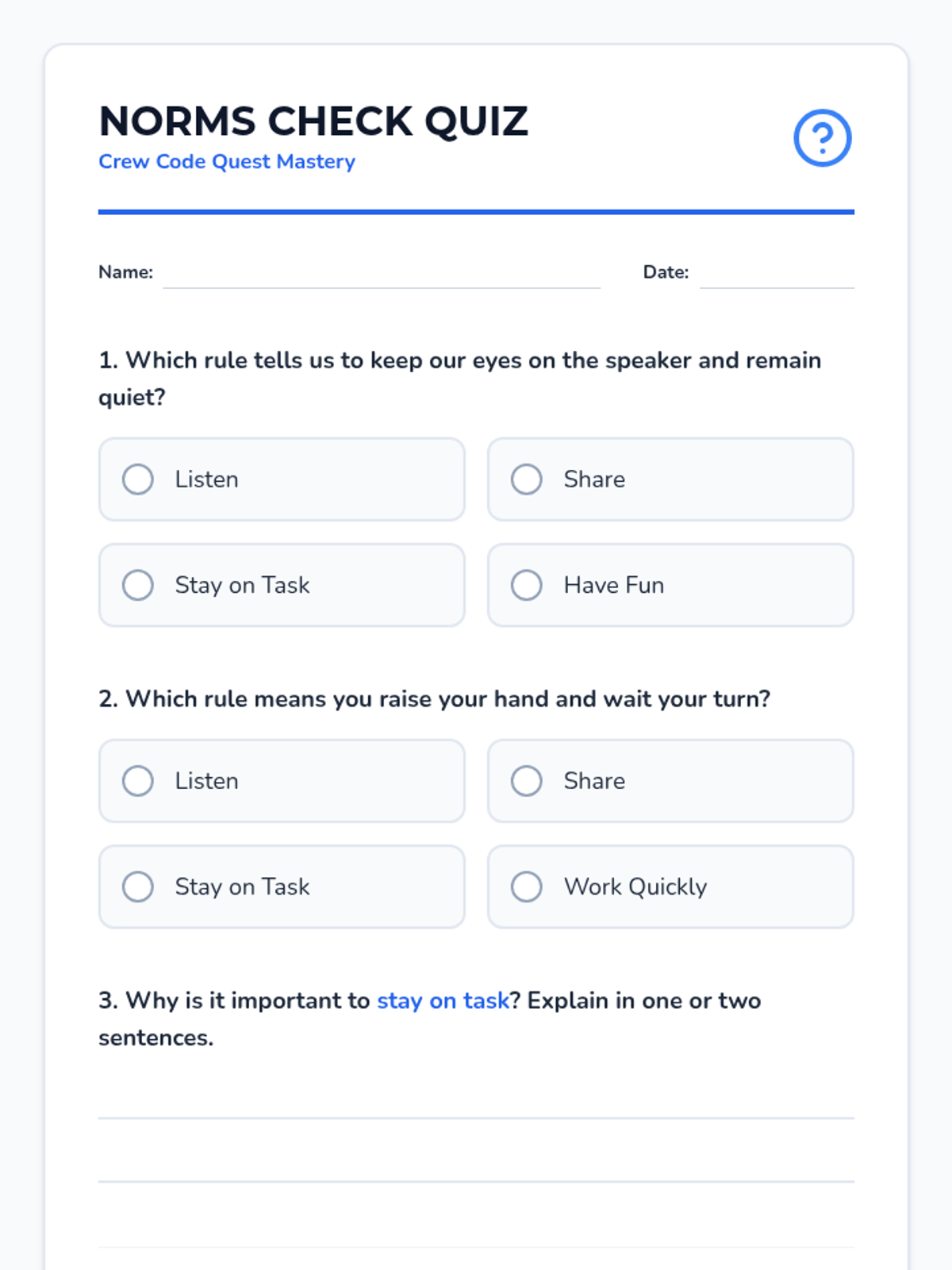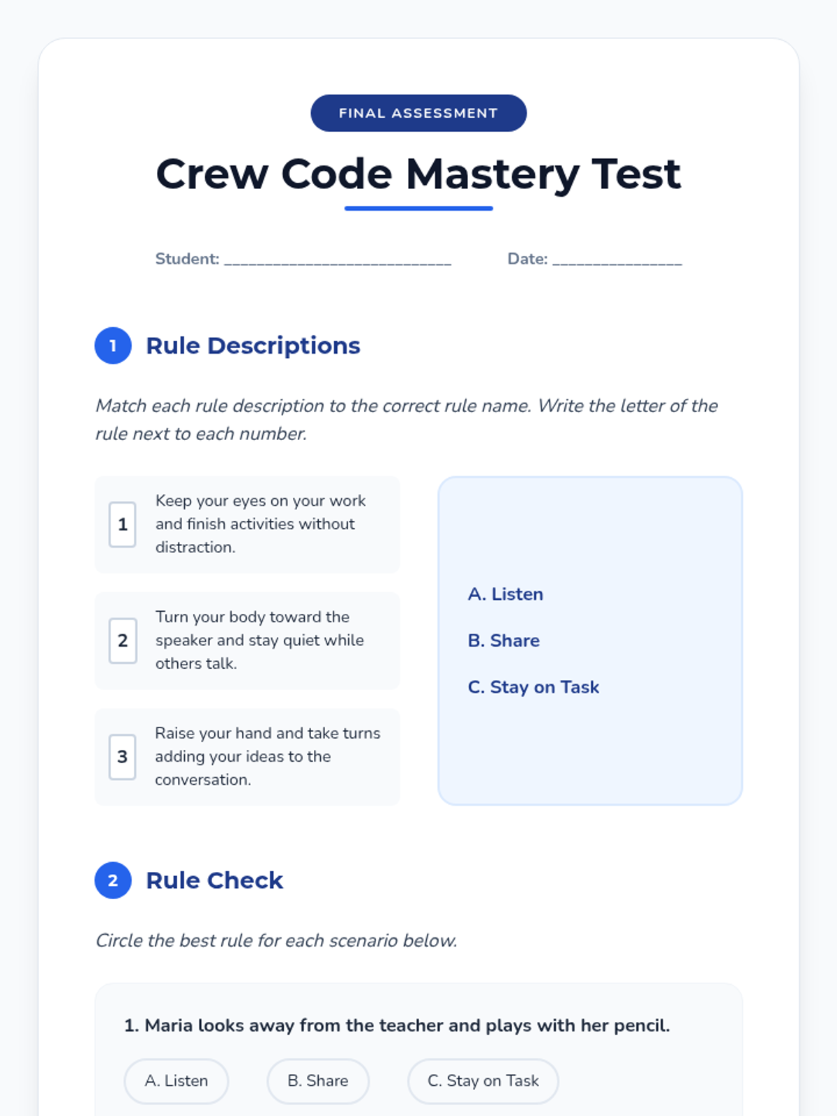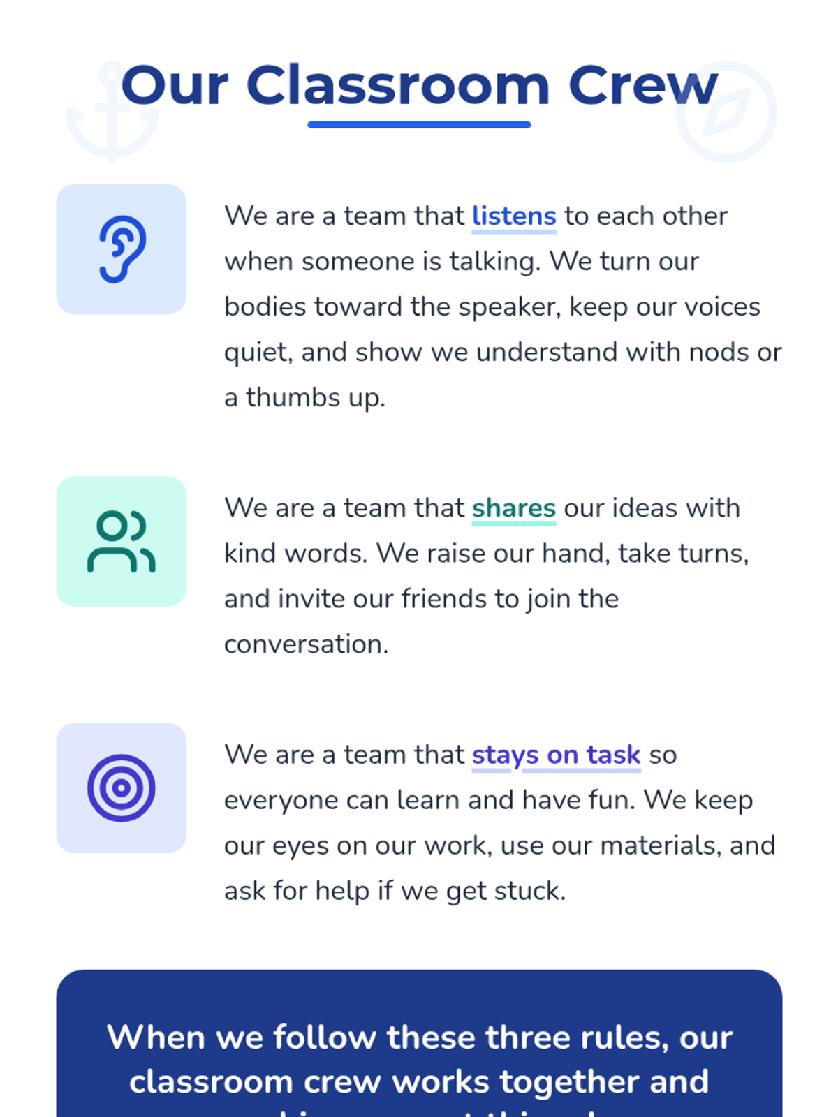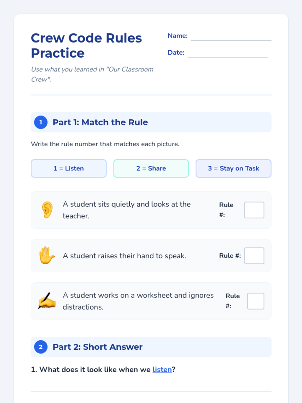 In this 30-minute Tier 3 individual lesson, a 2nd grade special education student will learn essential group rules and norms (Listen, Share, Stay on Task) through reading, role-play, and engaging activities. This lesson builds social skills and confidence for group participation.