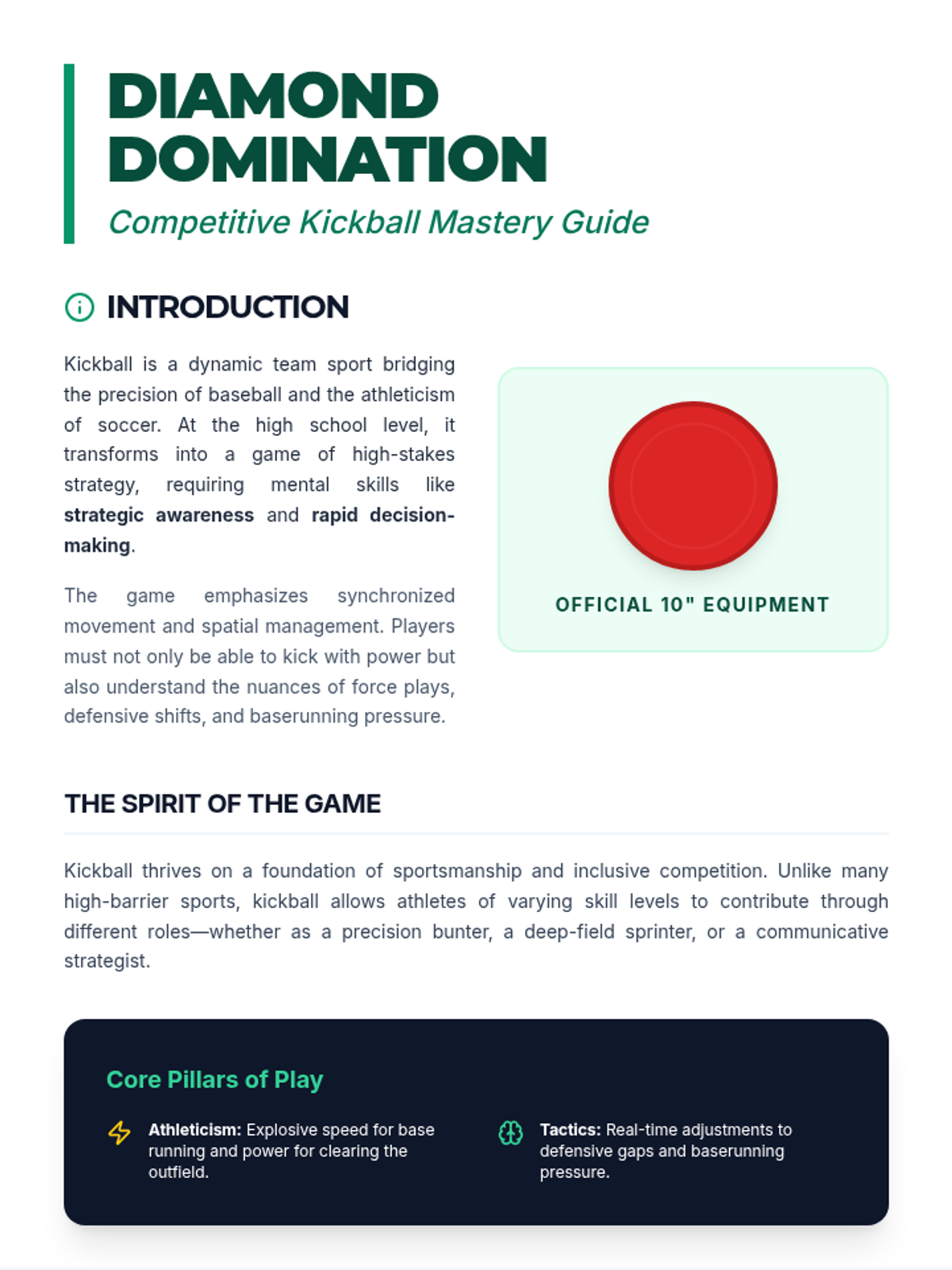 A comprehensive 10-page guide and activity set for high school students covering kickball history, rules, strategies, and vocabulary. Includes a 20-question review and a themed crossword puzzle.