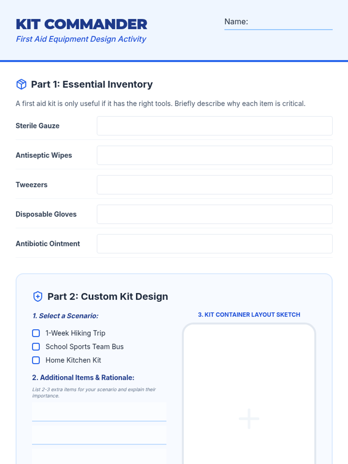 An independent student-led module covering essential first aid skills including CPR, choking response, and wound care. Designed for a 2-hour substitute block.