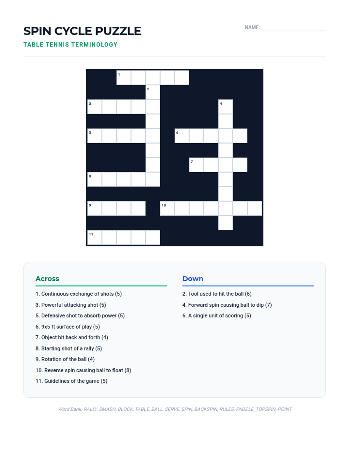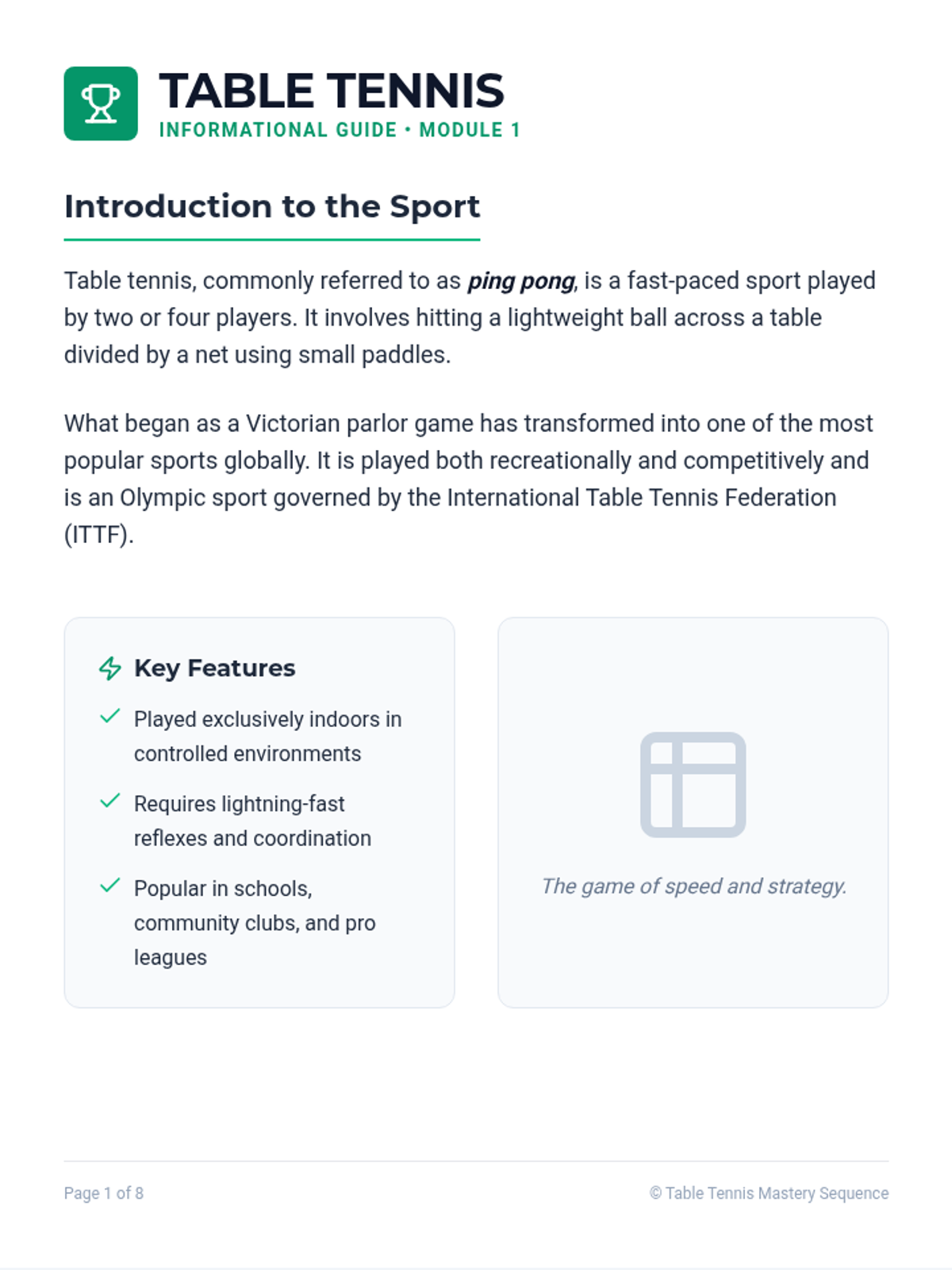A deep dive into the sport of table tennis, covering its origins, technical equipment, competitive rules, and advanced strategies through a detailed packet and assessments.
