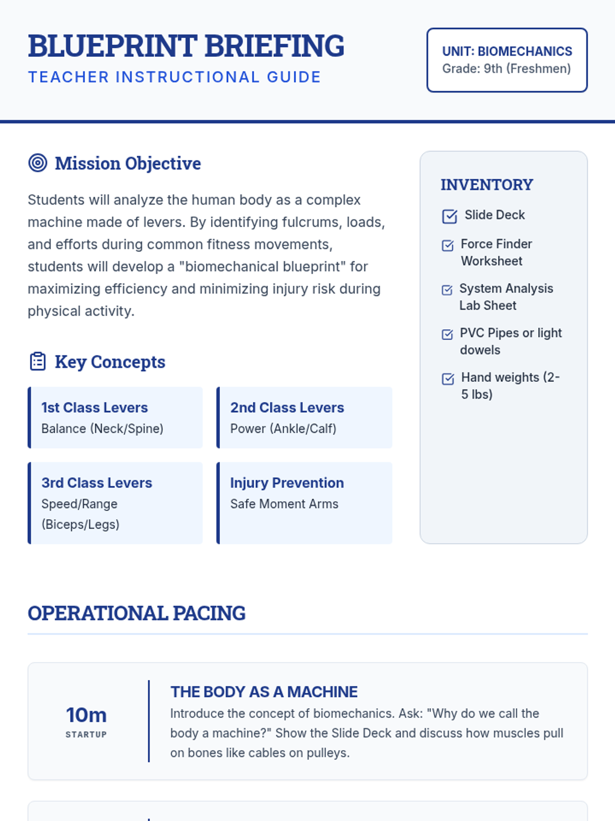 Students investigate the body as a system of levers to optimize movement efficiency and safety. This lesson guides freshmen through mechanical principles during common fitness tasks to prevent injury.