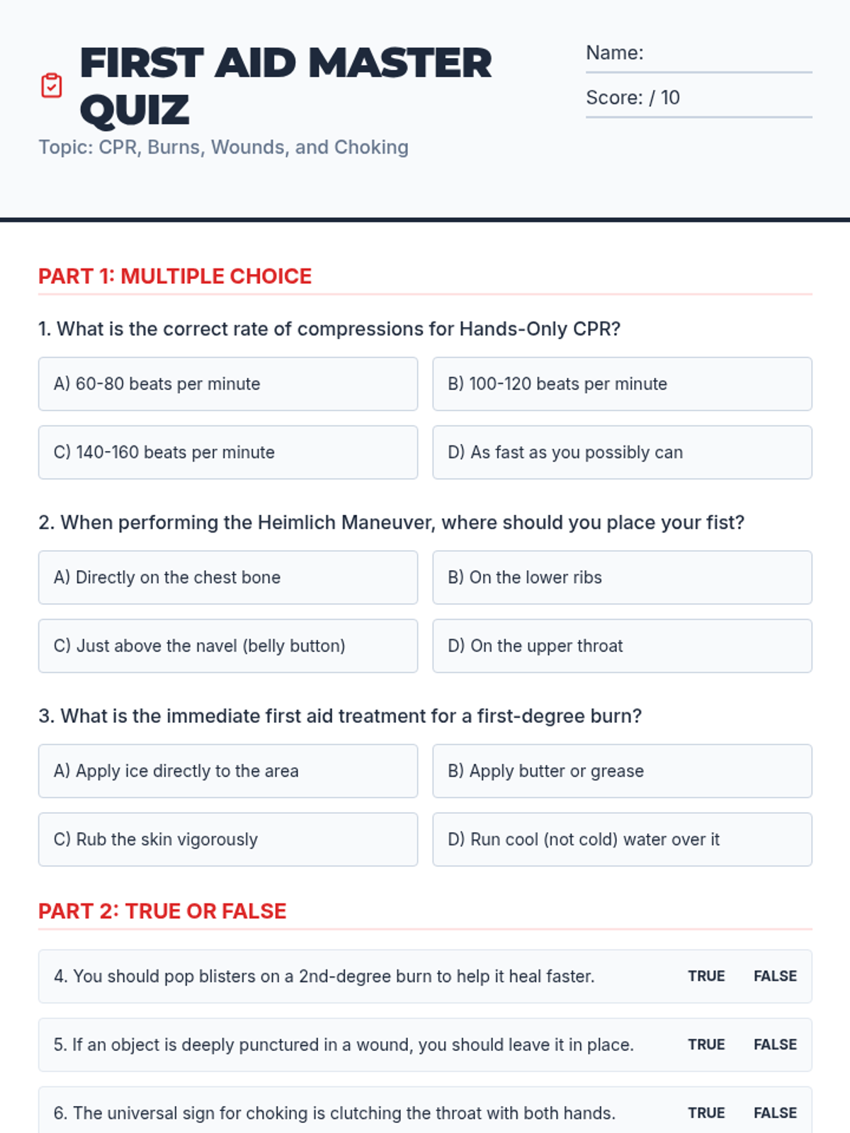 A comprehensive introduction to first aid for 9th graders, covering emergency protocols, wound care, life-saving procedures, and environmental emergencies. This lesson is designed for independent or sub-led instruction.