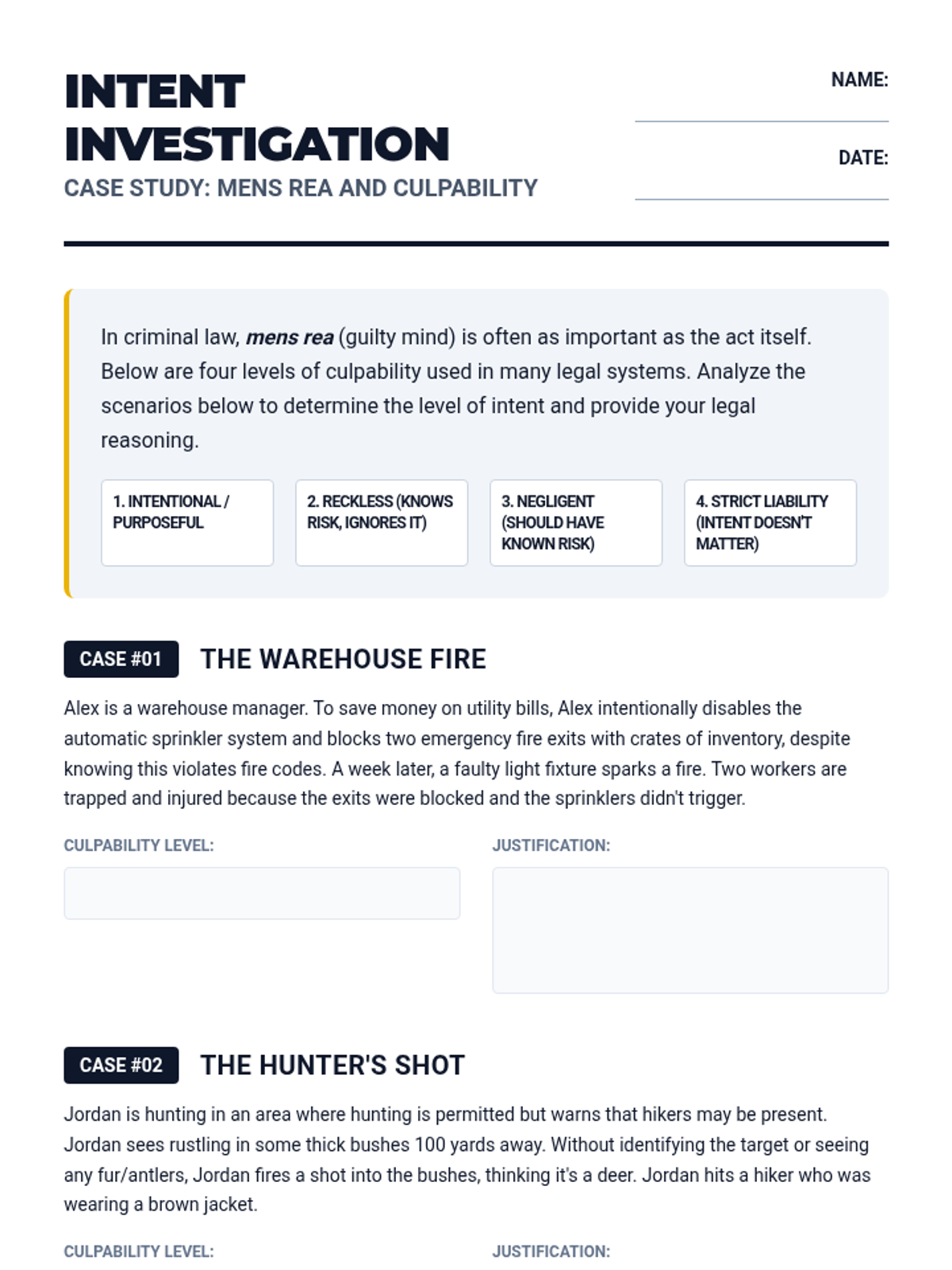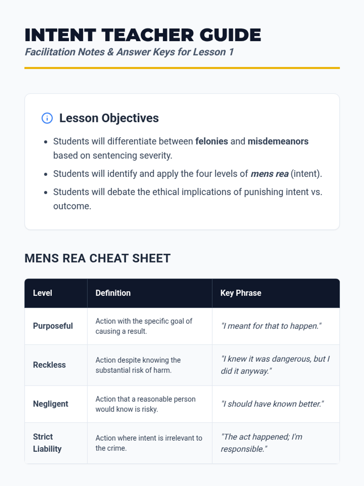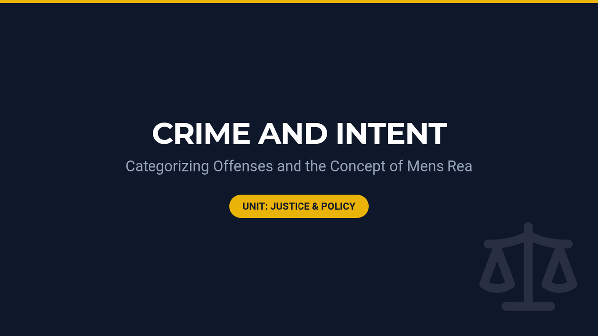 Students differentiate between felonies and misdemeanors and explore the concept of mens rea (criminal intent) by analyzing legal scenarios involving negligence, recklessness, and intent.