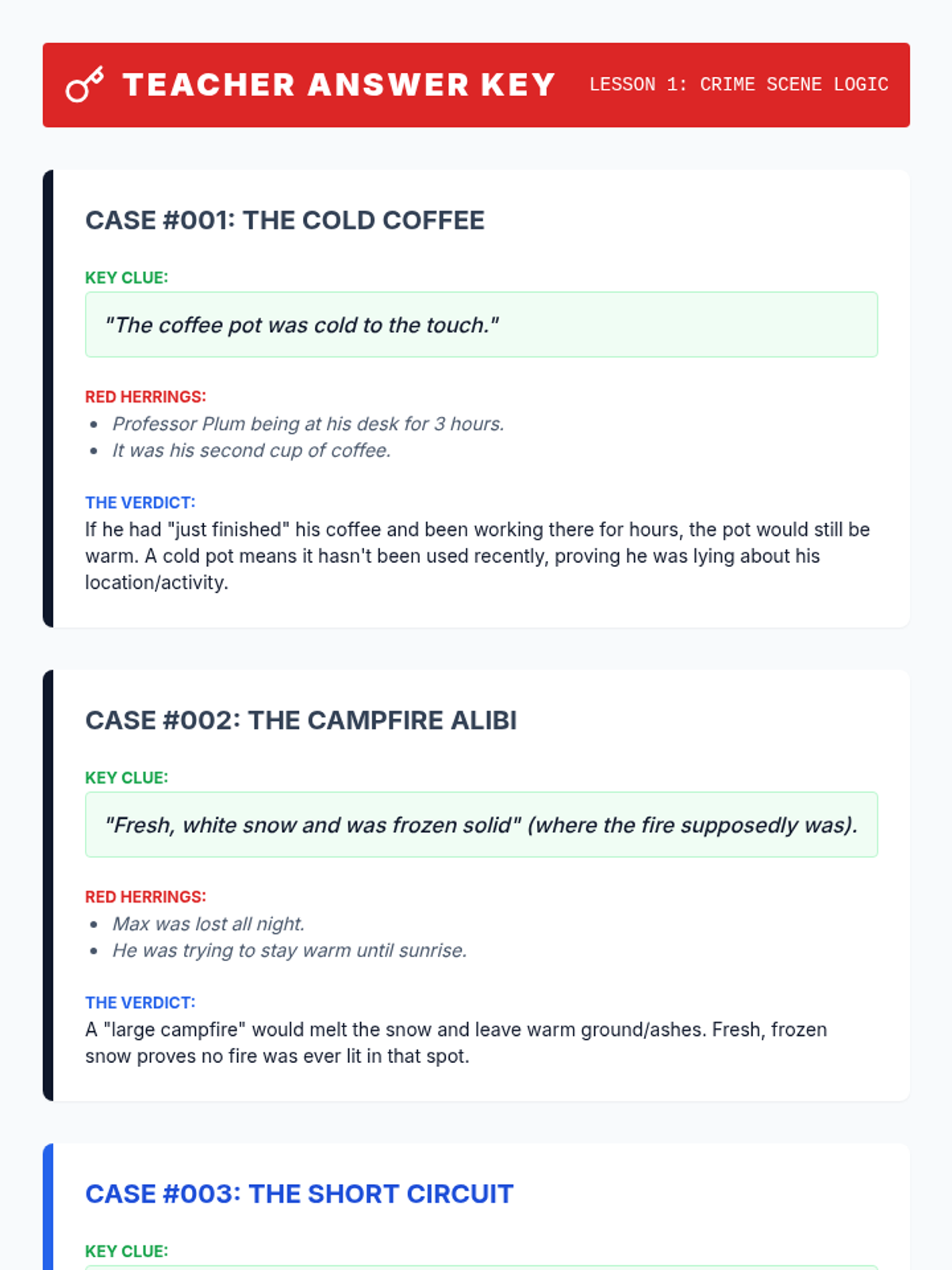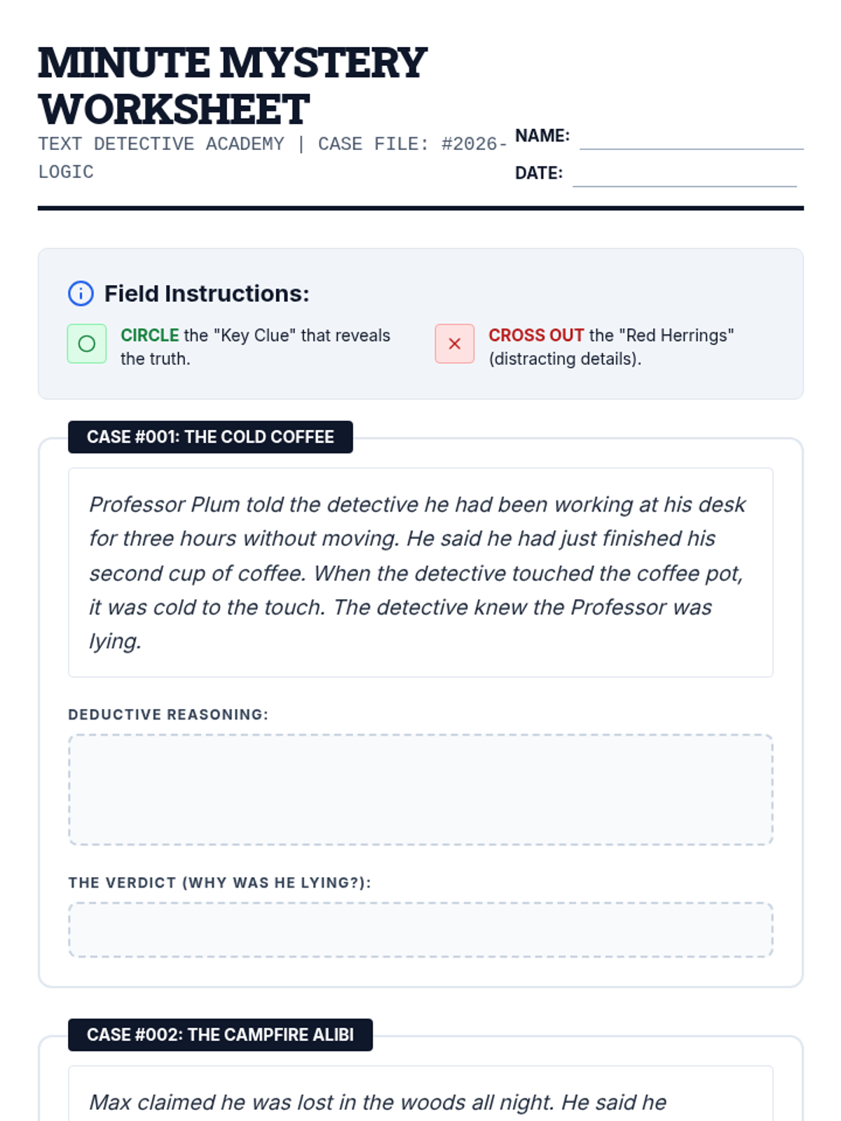 Students are introduced to deductive reasoning through minute mysteries and classroom 'crime scenes.' They learn to identify key details and filter out irrelevant information.