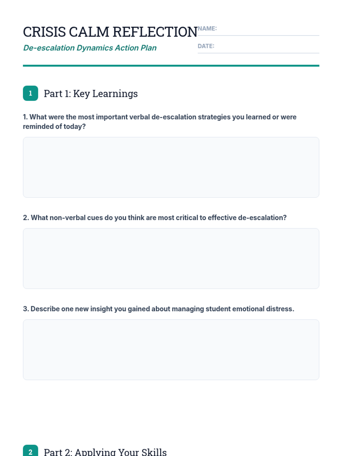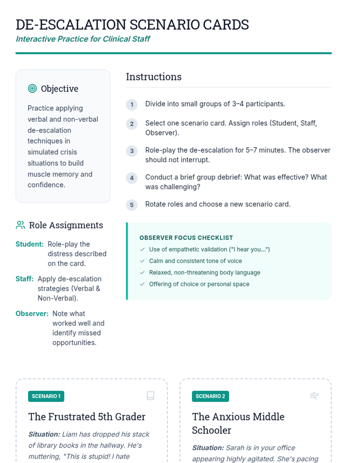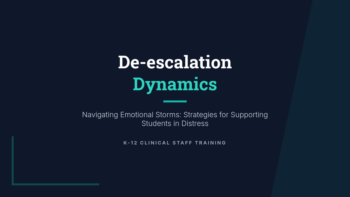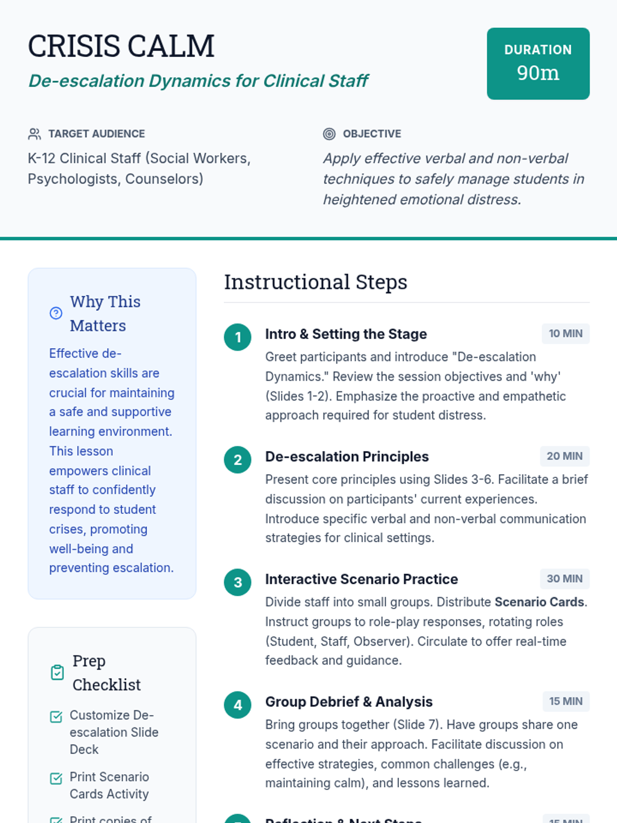 This lesson equips K-12 clinical staff with verbal and non-verbal de-escalation techniques to manage student crises. It features interactive role-playing, scenario analysis, and guided practice to build confidence in crisis response.