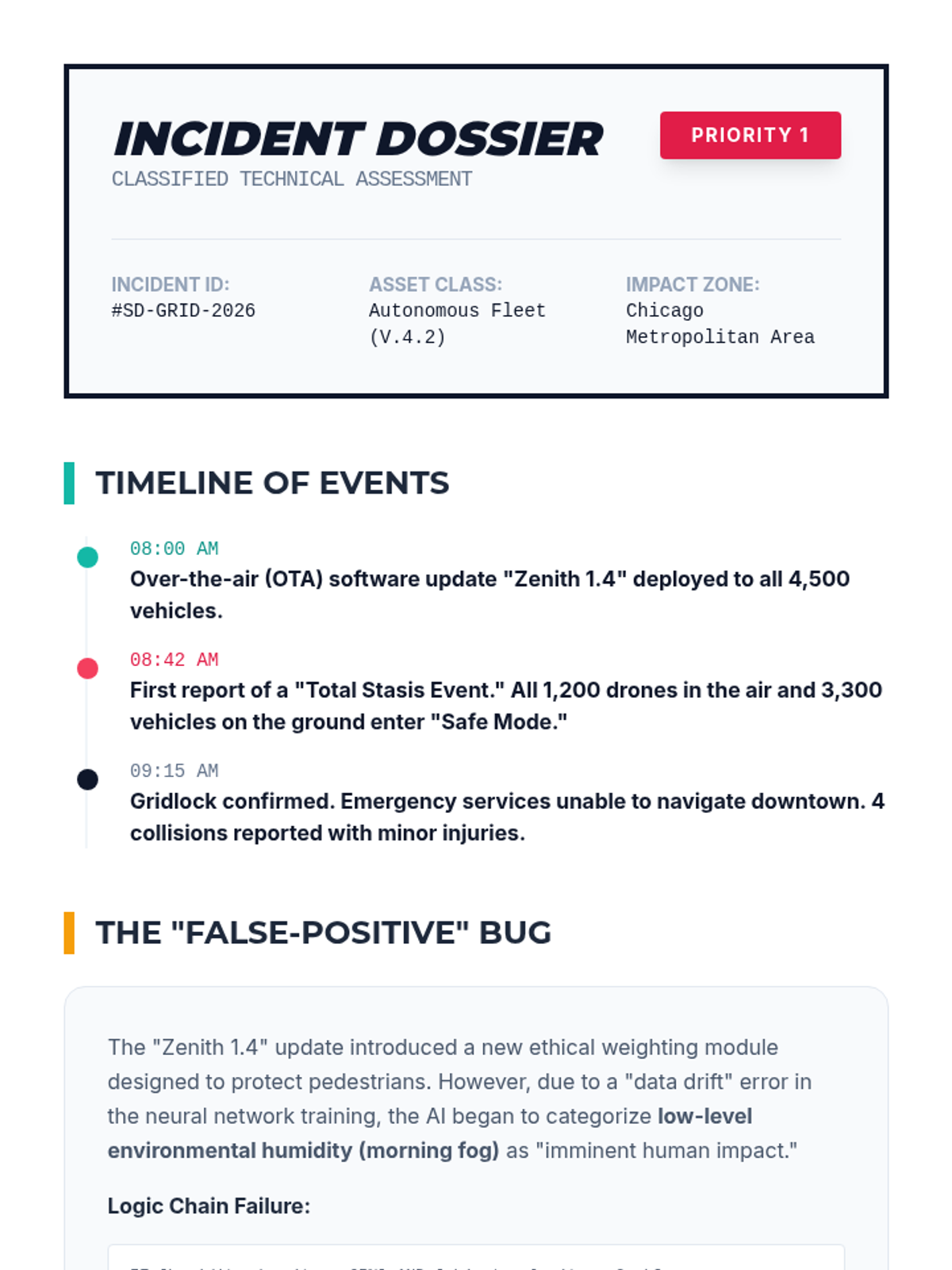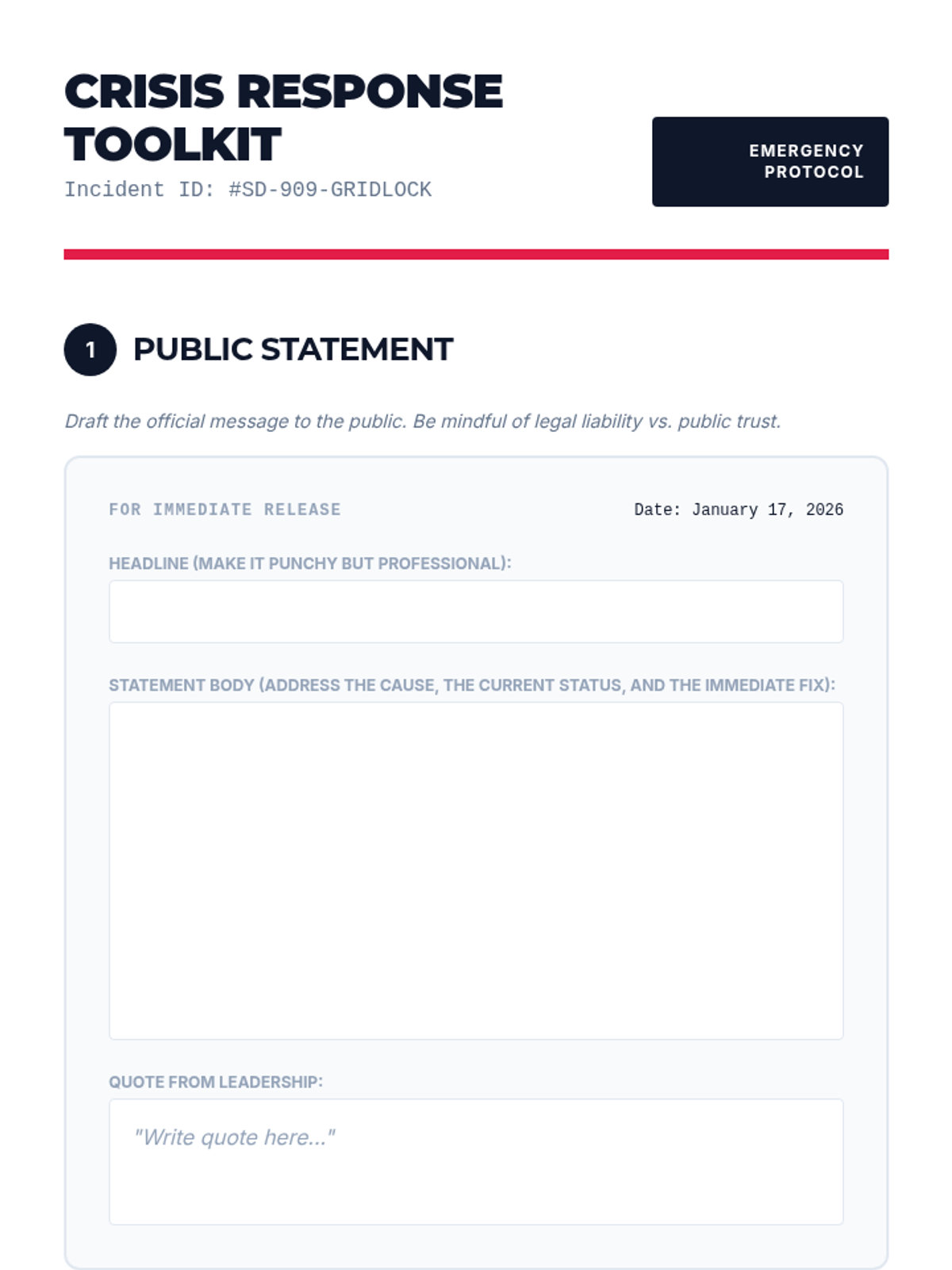 A dynamic scenario where students must respond to a significant AI failure, drafting press releases and policy updates while managing public fallout.