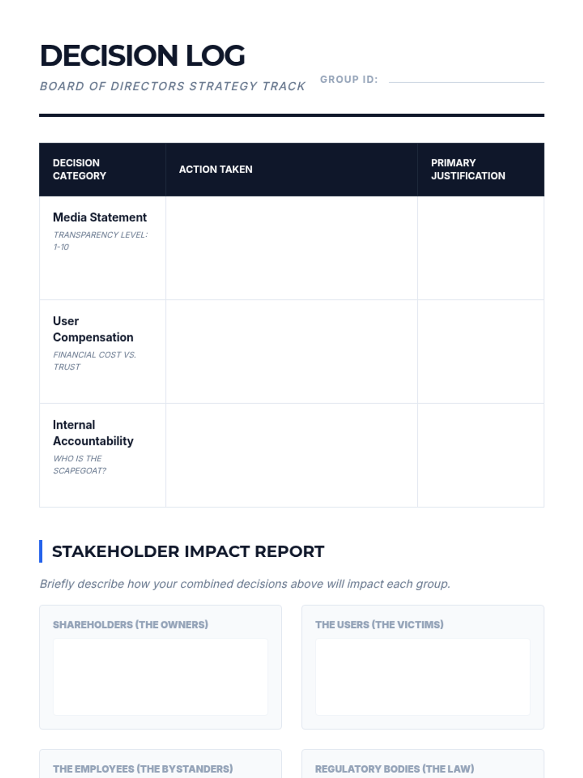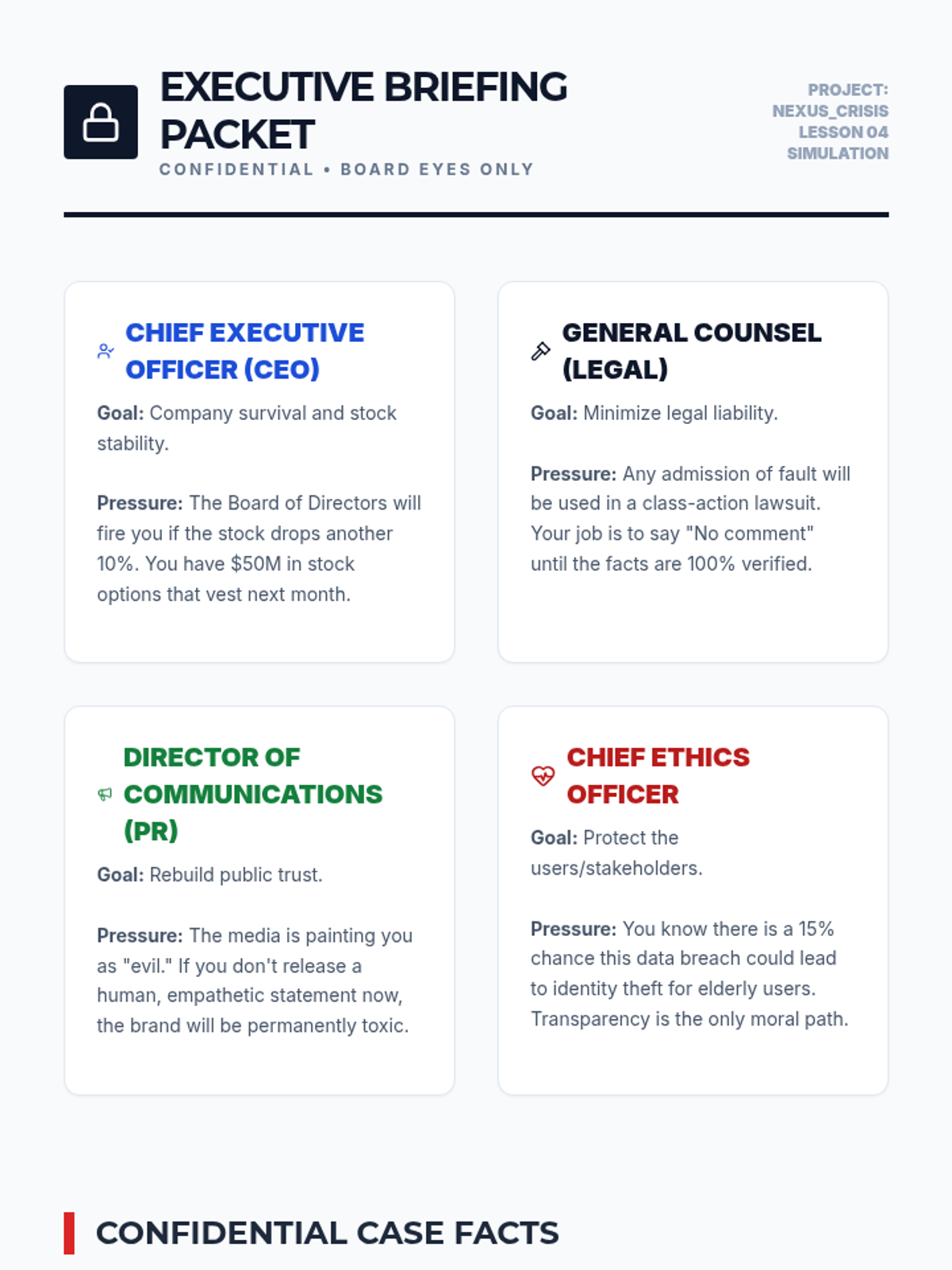 Part one of a high-stakes simulation where students take on executive roles to manage a sudden corporate crisis. They must navigate the tension between legal liability and ethical transparency under intense pressure.