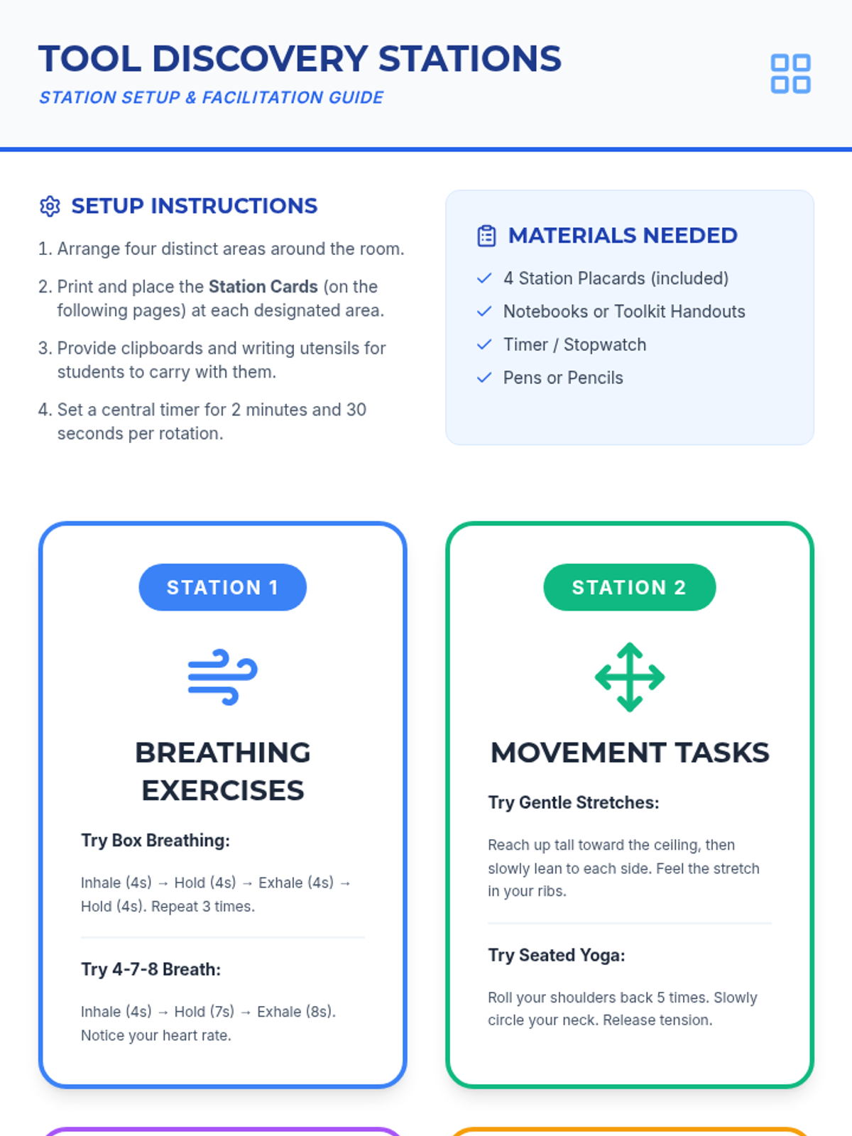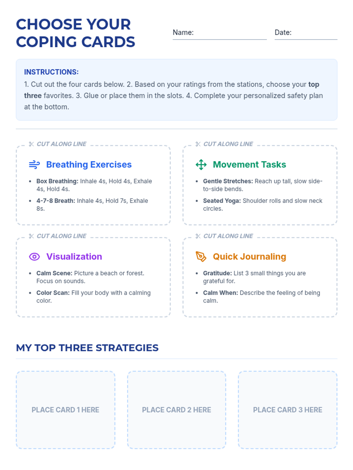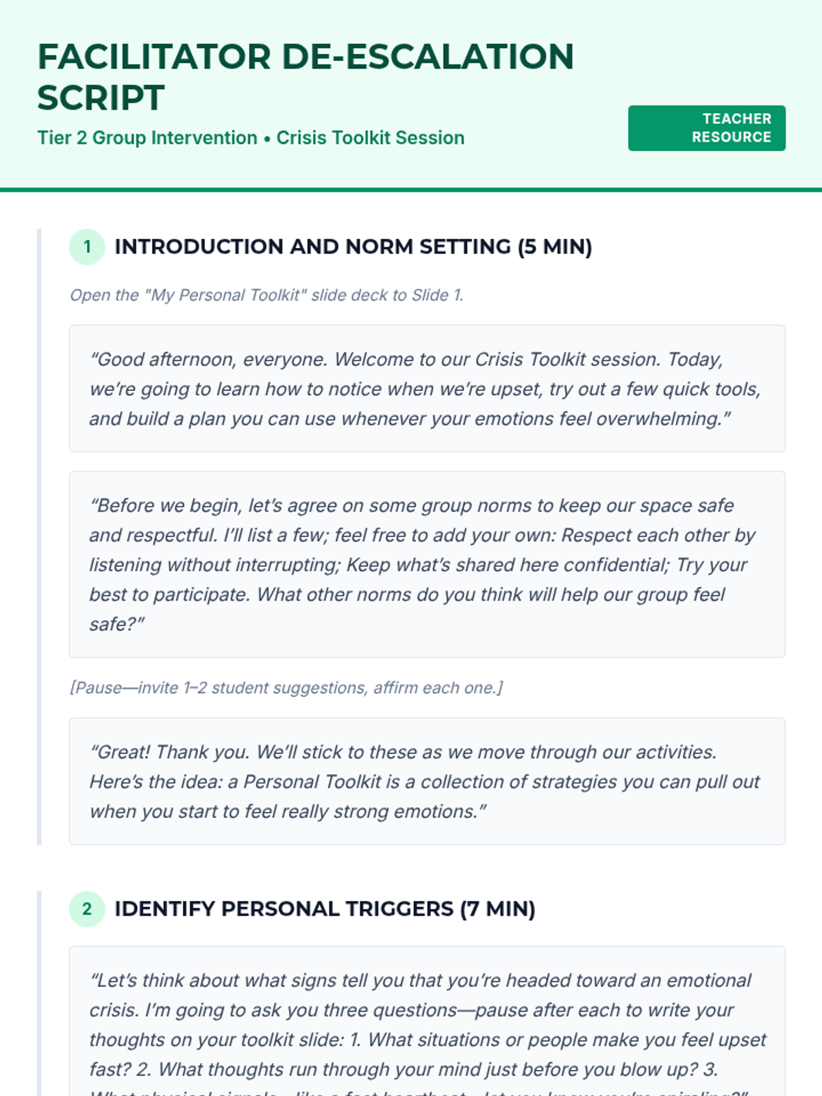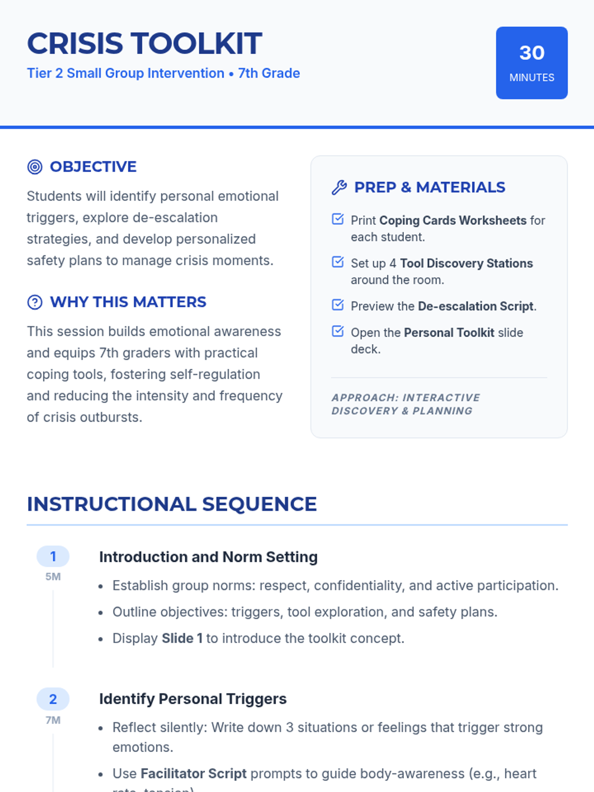 A 30-minute Tier 2 small-group session for 7th graders to identify emotional triggers, explore de-escalation tools, and create personalized safety plans for crisis moments.