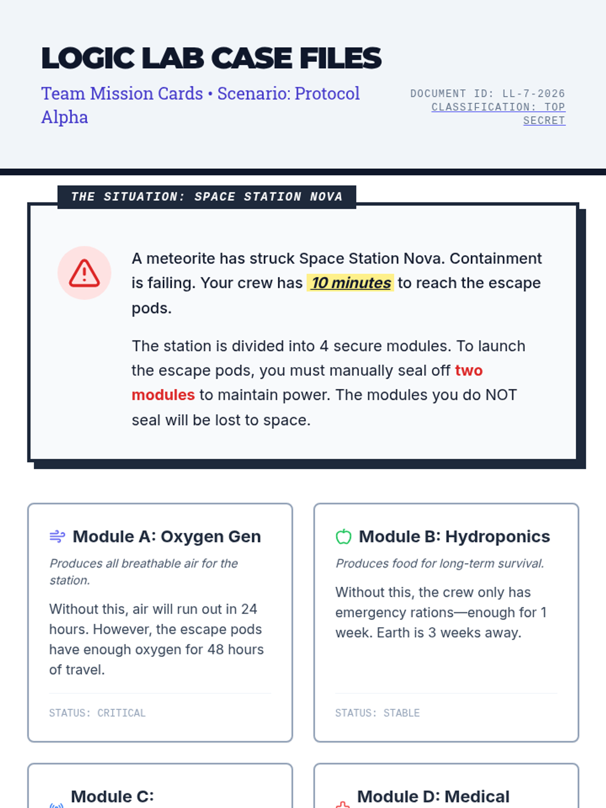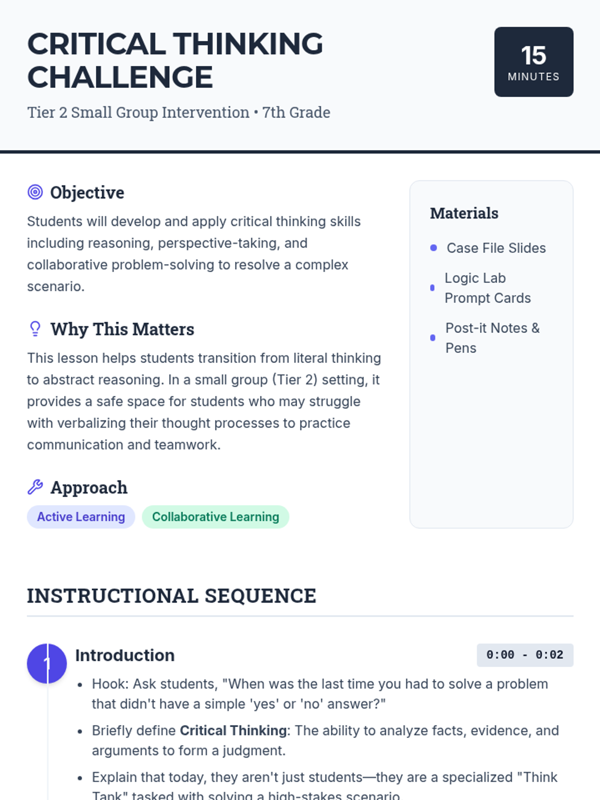 A fast-paced, 15-minute Tier 2 intervention designed to sharpen 7th-grade students' reasoning and collaborative problem-solving skills through a high-stakes scenario.