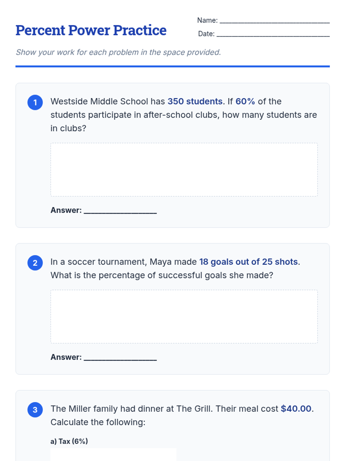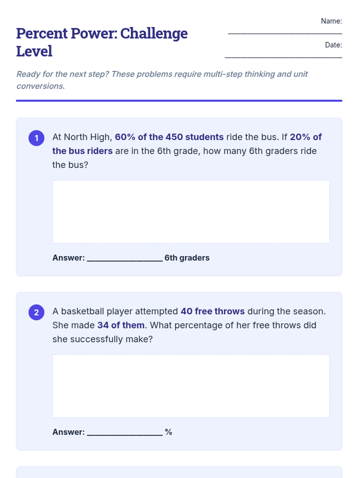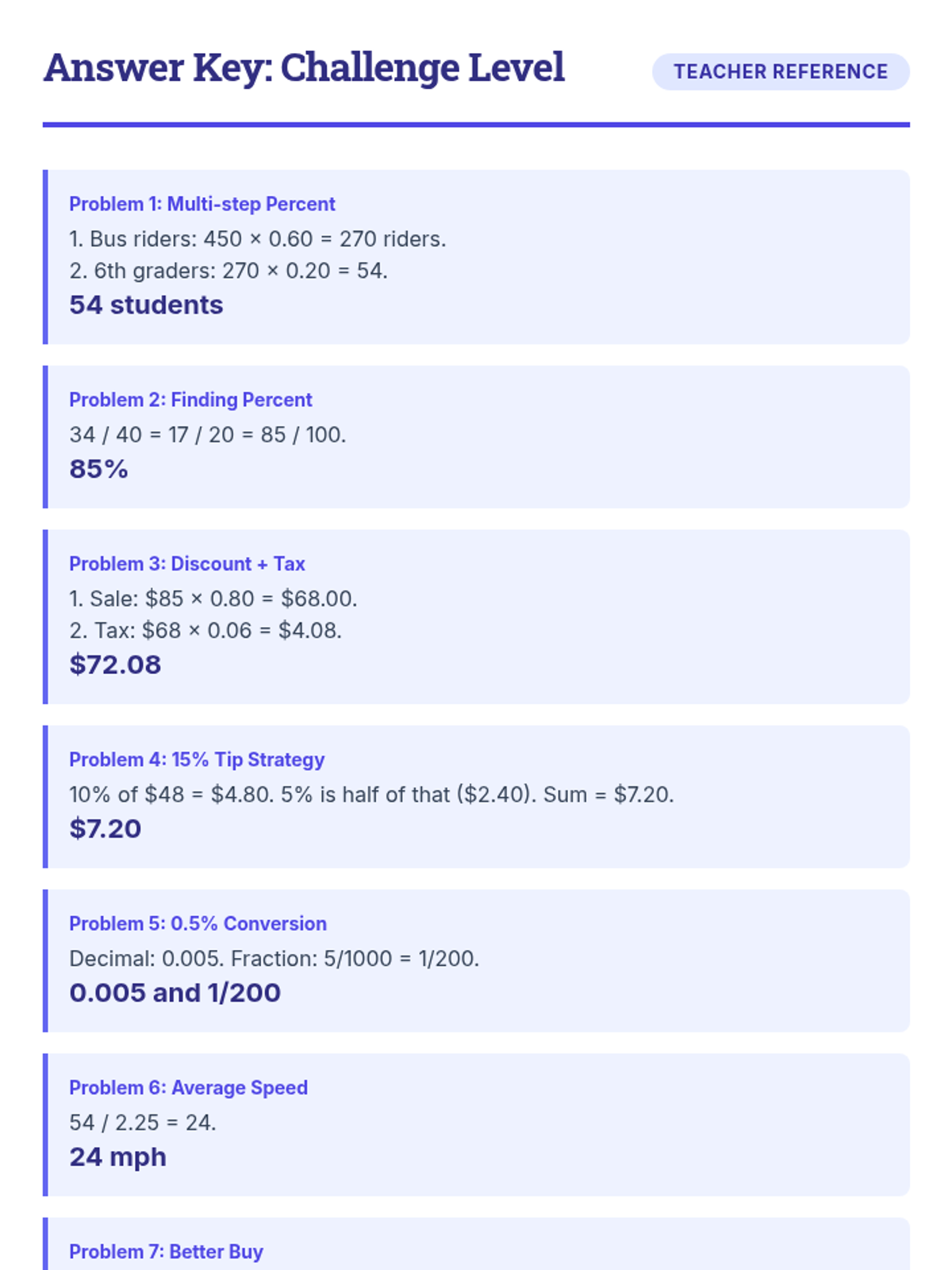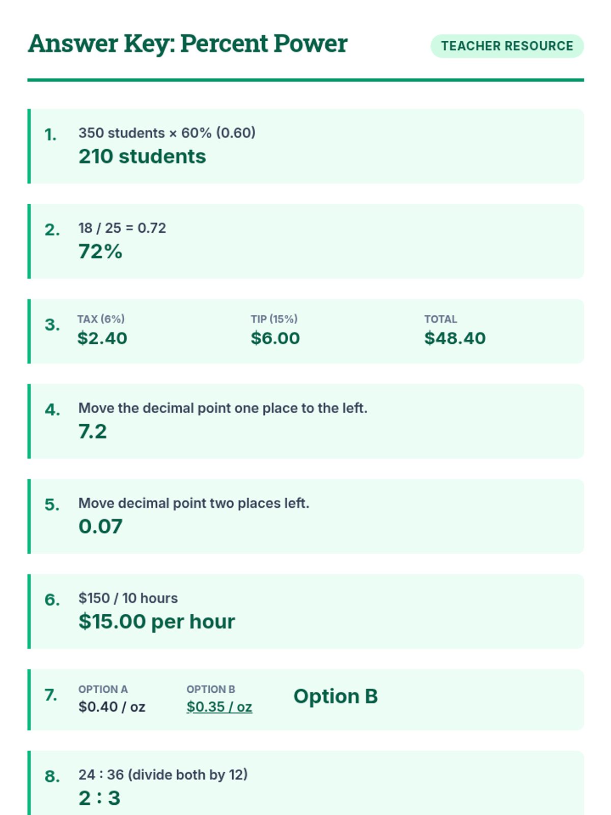 A comprehensive practice lesson on 6th grade ratio and percentage concepts including unit rates, proportions, and real-world money applications.