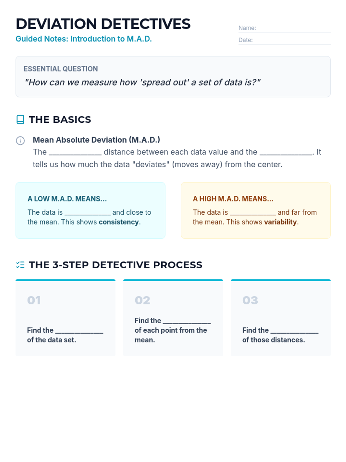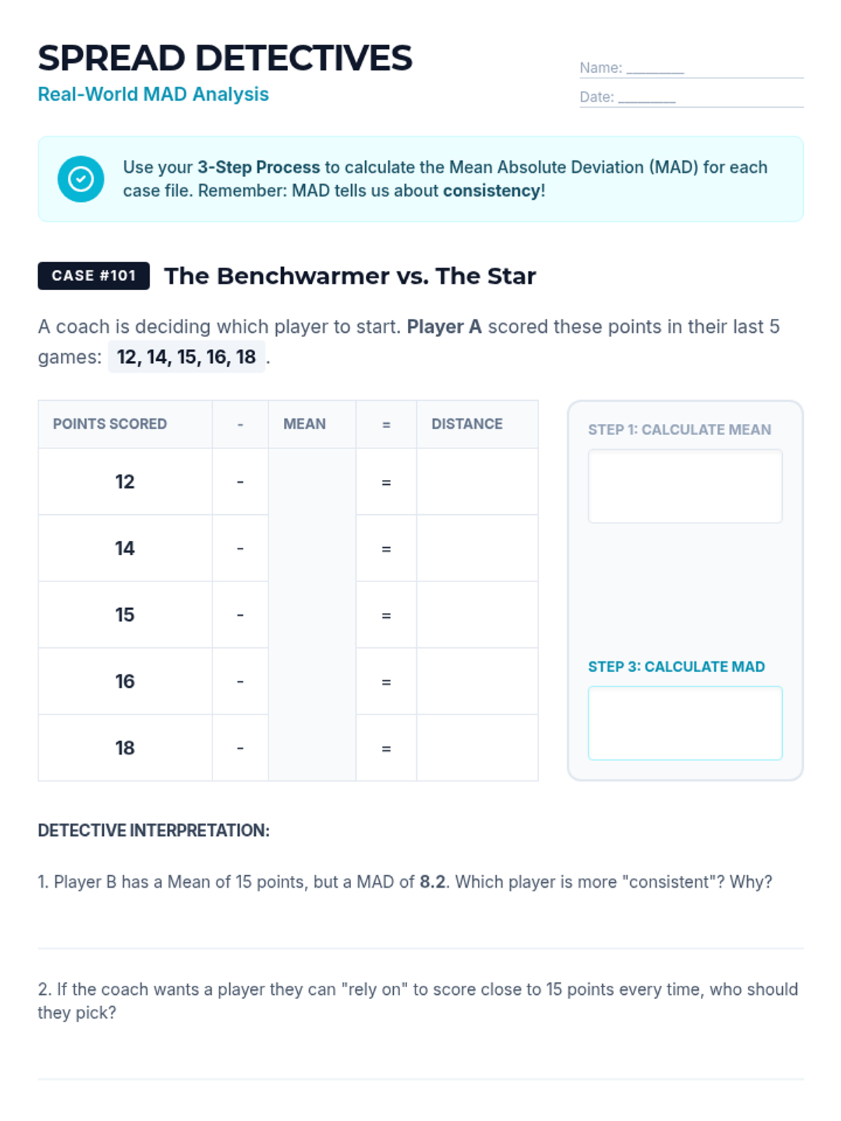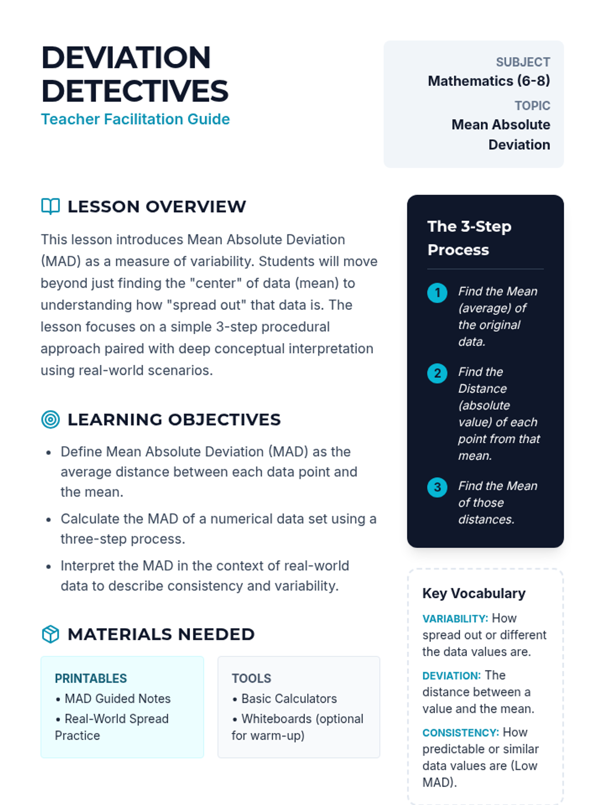 A comprehensive introduction to Mean Absolute Deviation (MAD) where students learn to calculate and interpret the average distance of data points from the mean. Through hands-on practice with real-world data, students discover how MAD measures consistency and variability in a dataset.