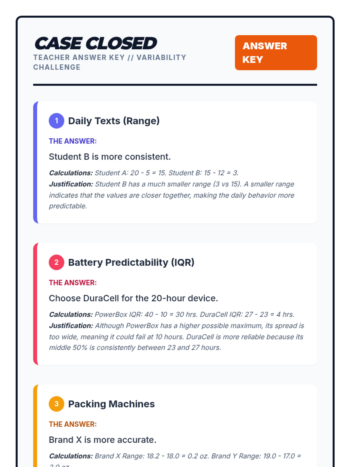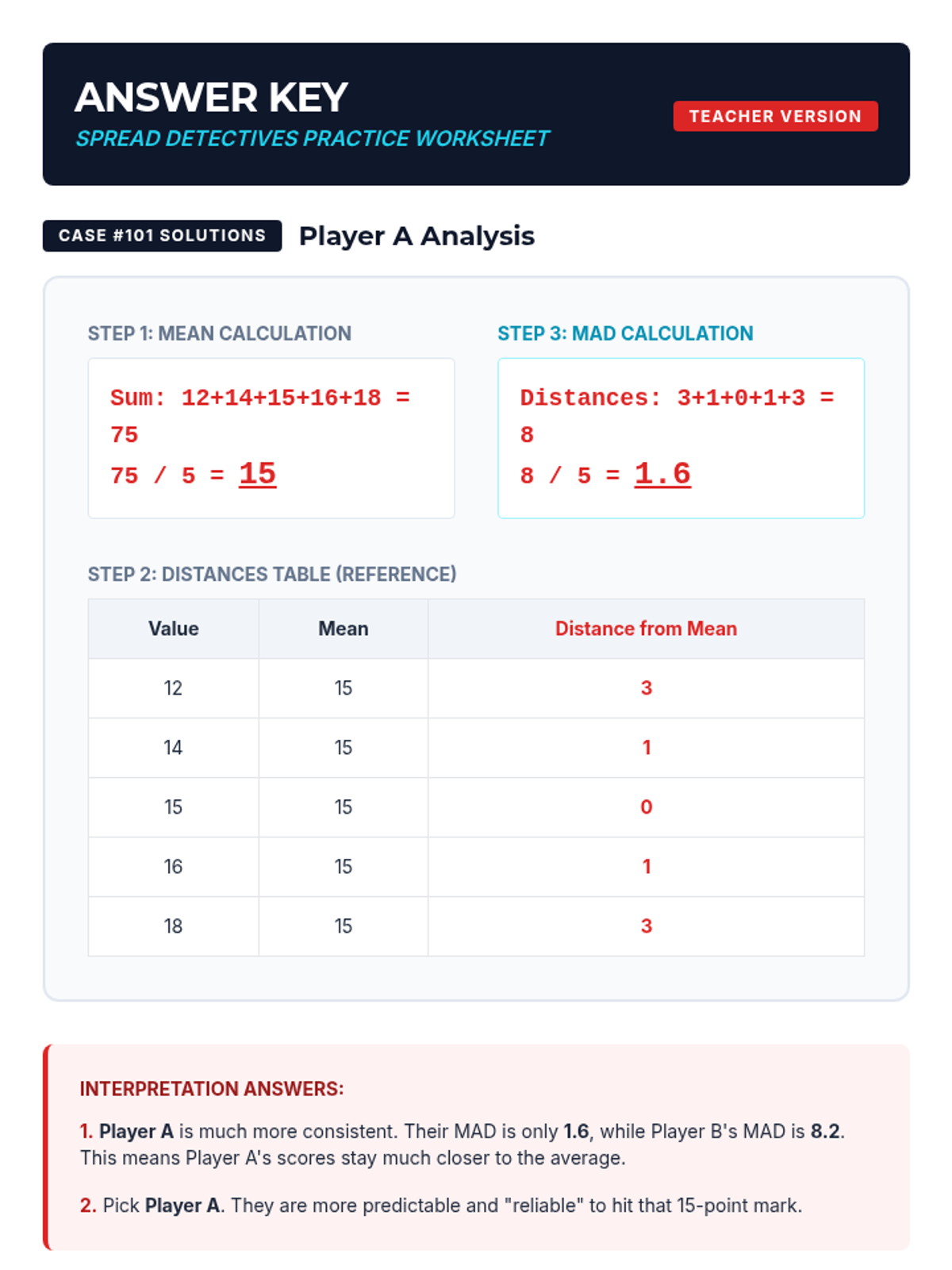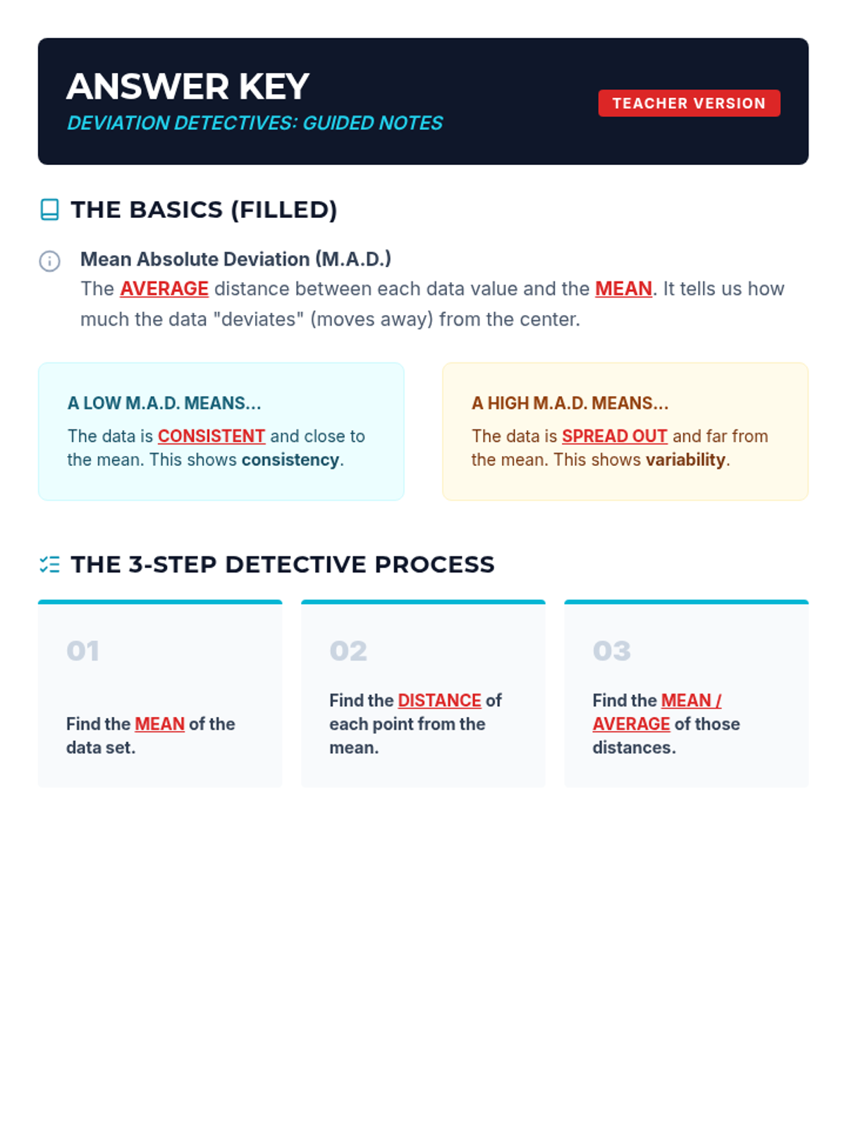 A comprehensive introduction to Mean Absolute Deviation (MAD) where students learn to calculate and interpret the average distance of data points from the mean. Through hands-on practice with real-world data, students discover how MAD measures consistency and variability in a dataset.
