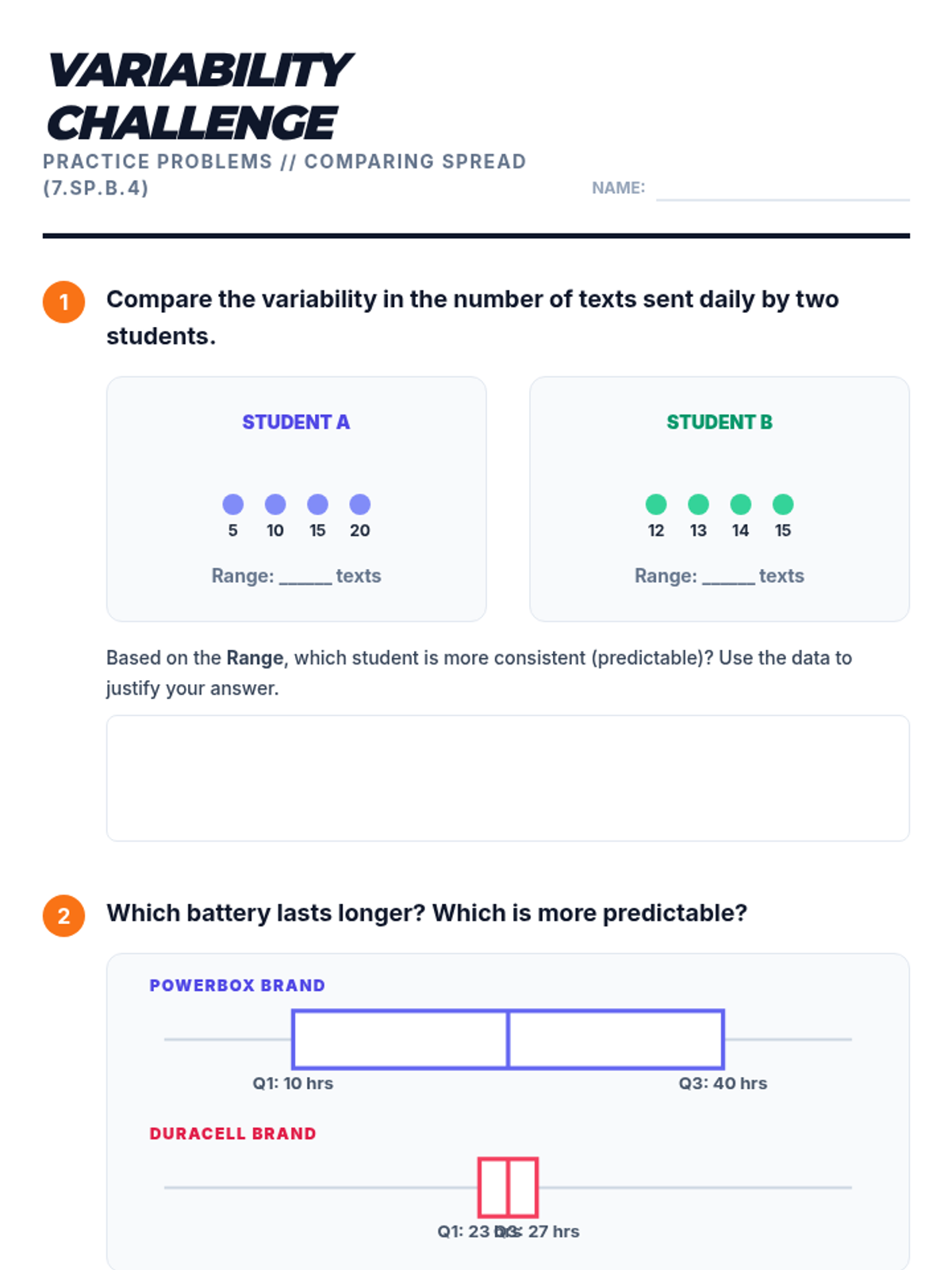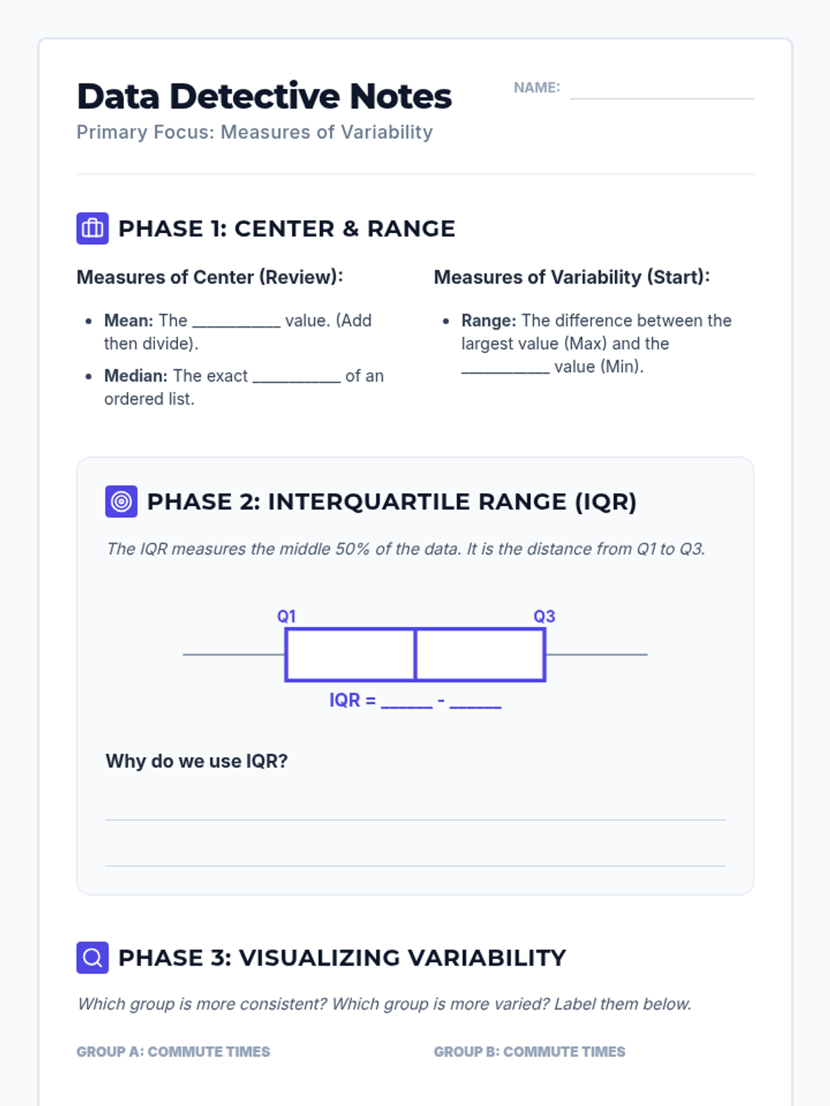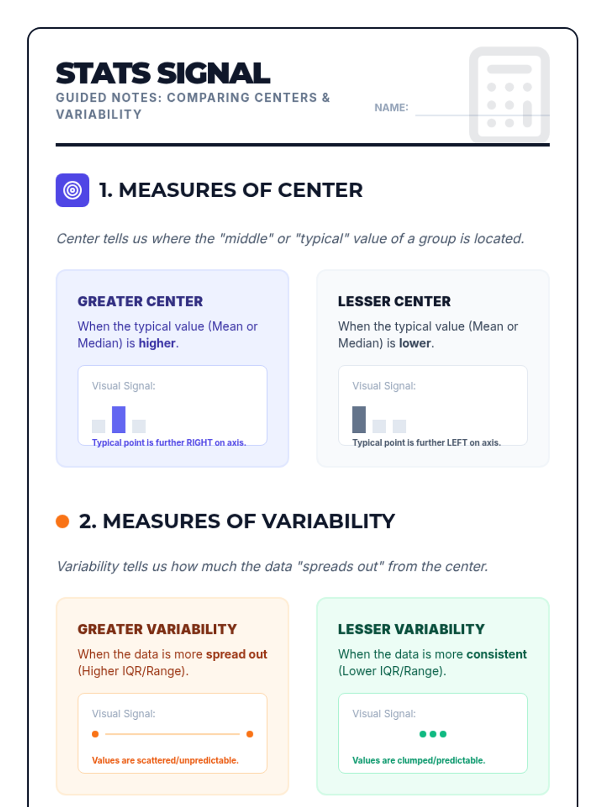 A mini-lesson on comparing two populations using measures of center (mean, median) and variability (IQR) based on CCSS 7.SP.4. Includes guided notes, practice problems, and a reference sheet.