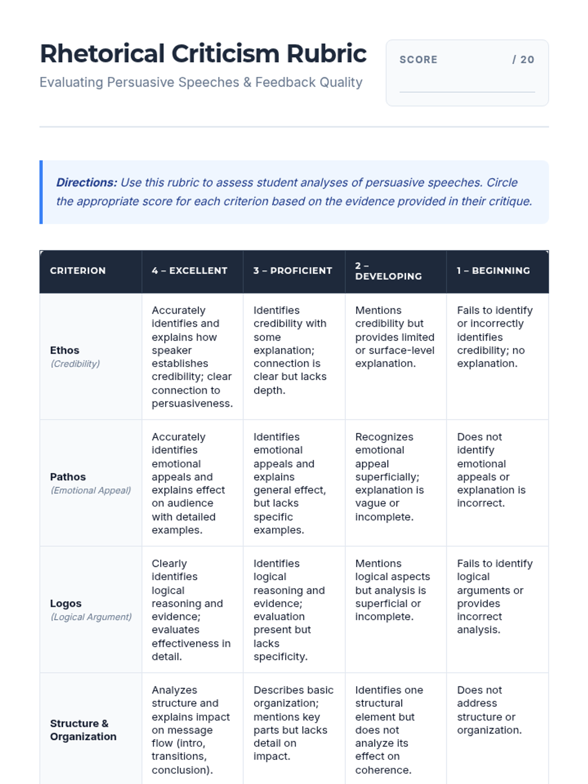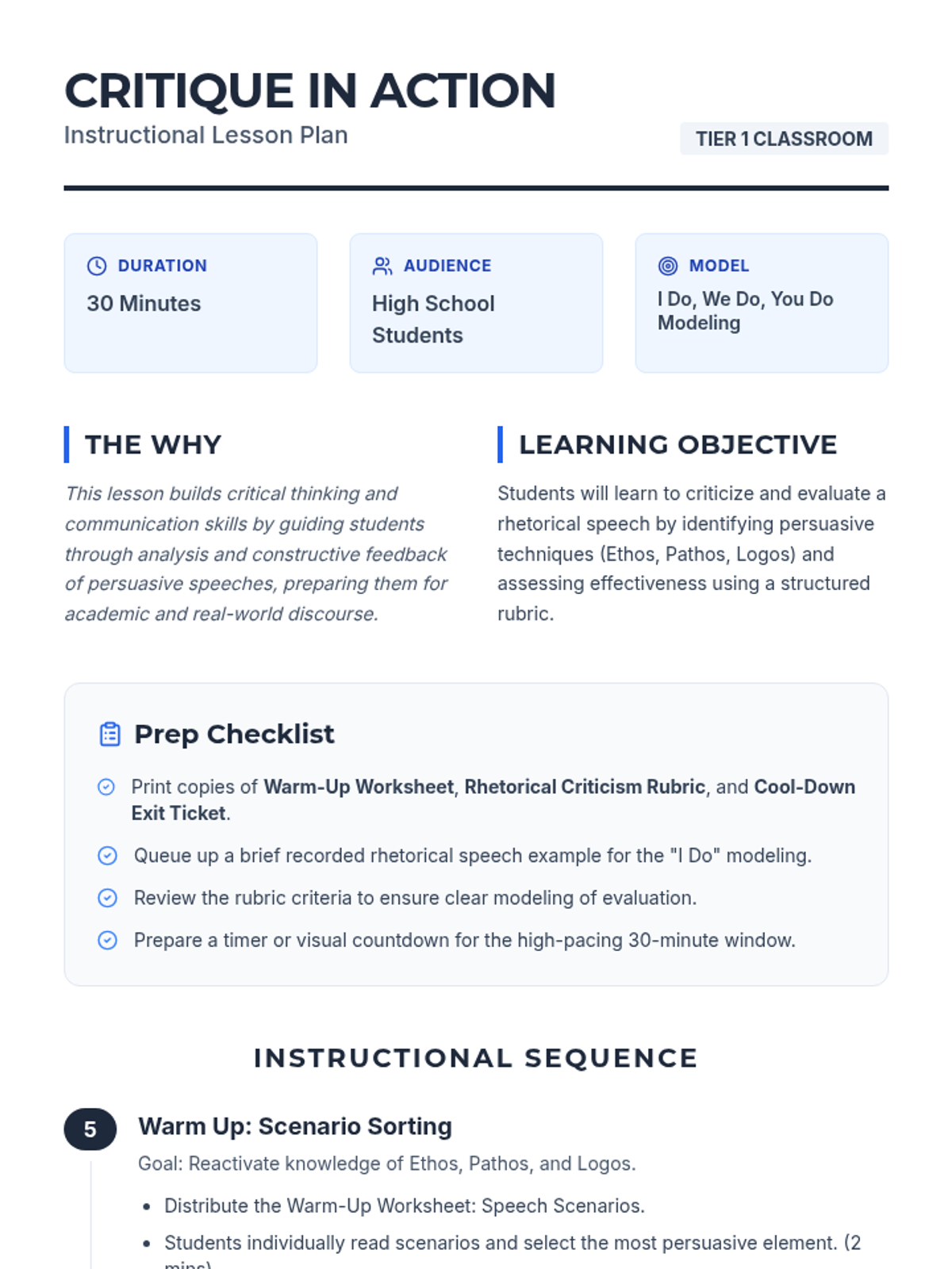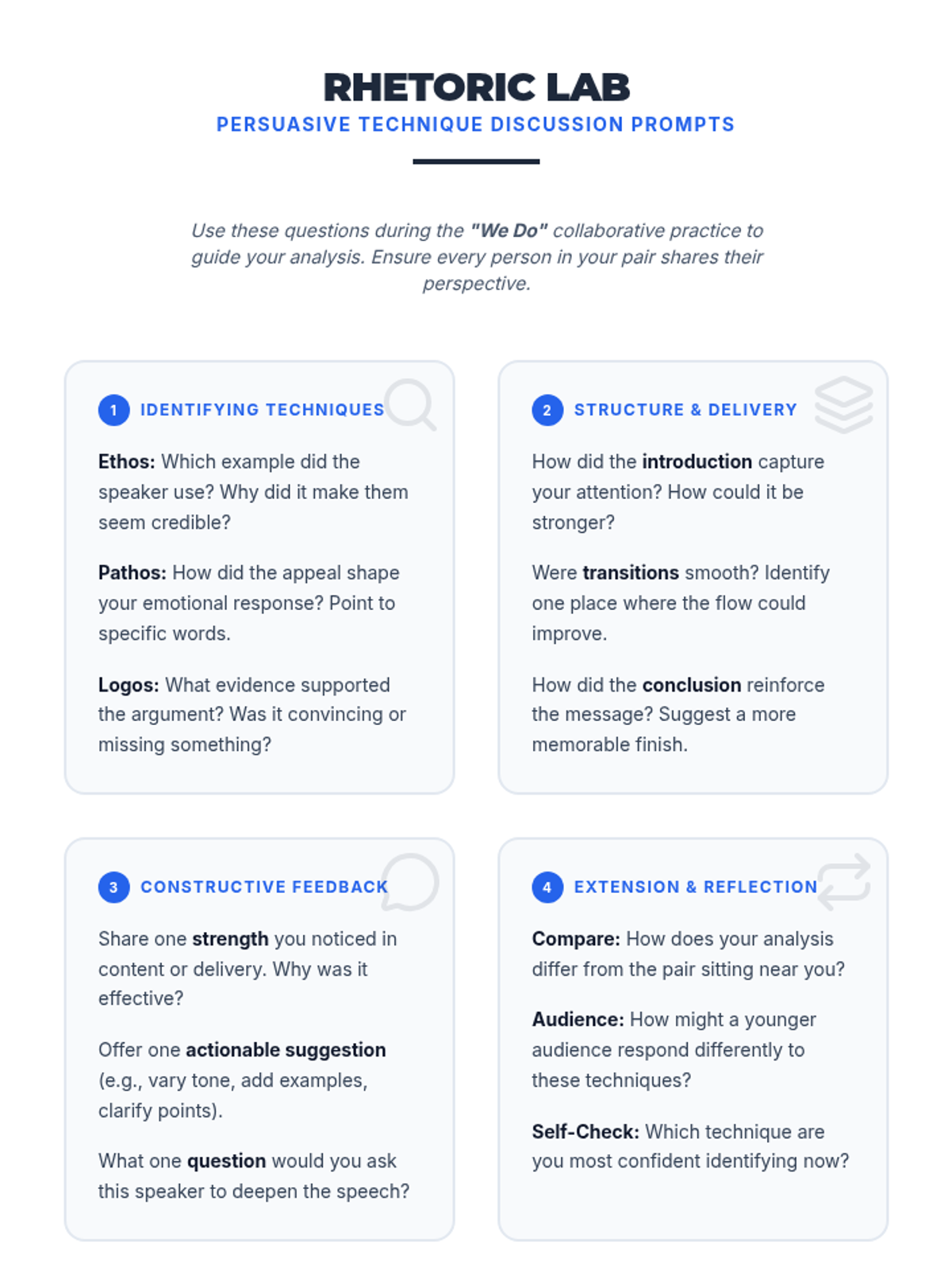 In this 30-minute, single-session lesson, high school students will learn to critically evaluate rhetorical speeches using the I Do, We Do, You Do model. Through guided demonstration, collaborative practice, and independent analysis, students develop skills to assess persuasive techniques and provide constructive feedback.
