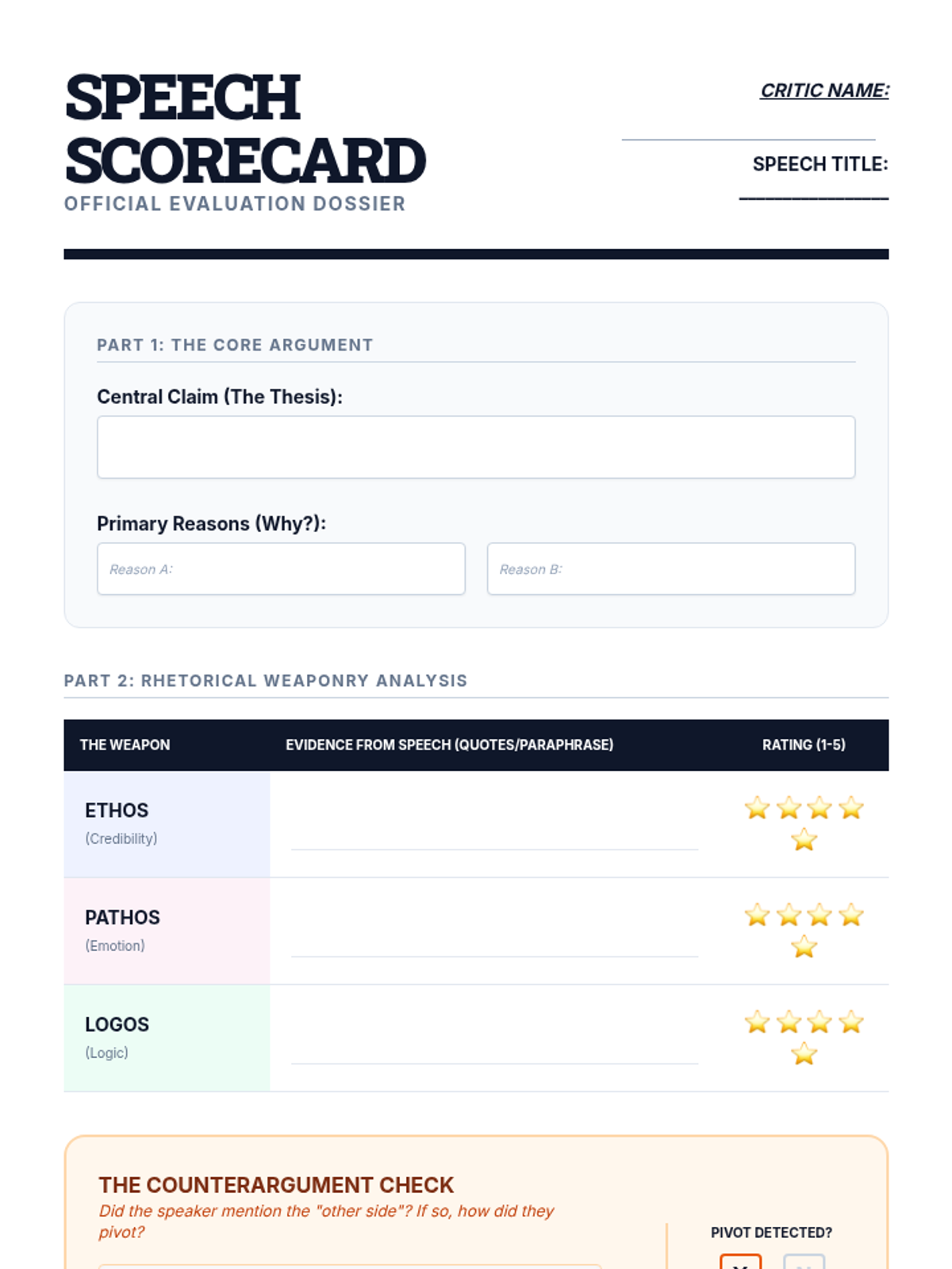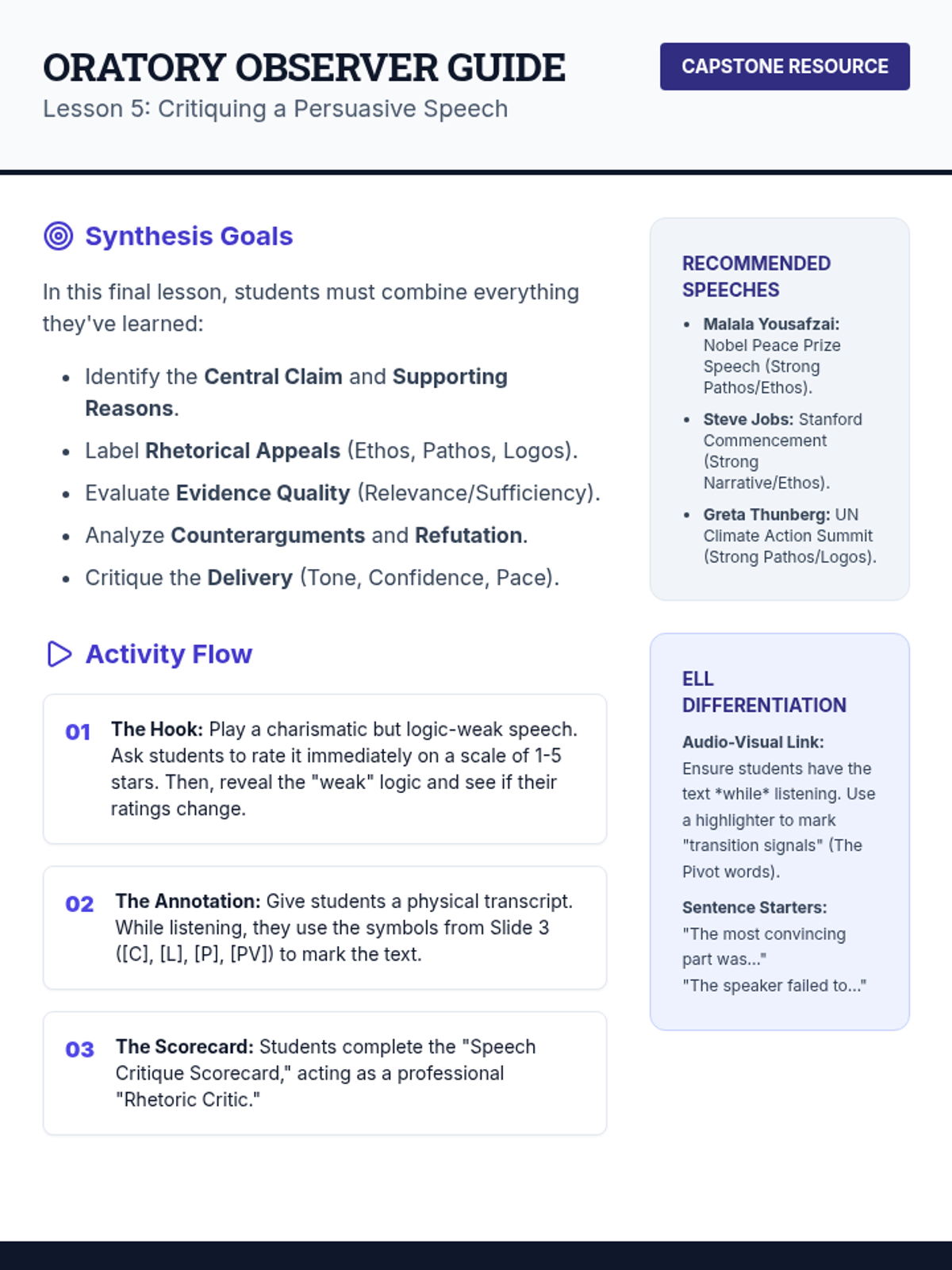 Students synthesize their learning by annotating and critiquing a persuasive speech, evaluating both the content of the argument and the effectiveness of the delivery.