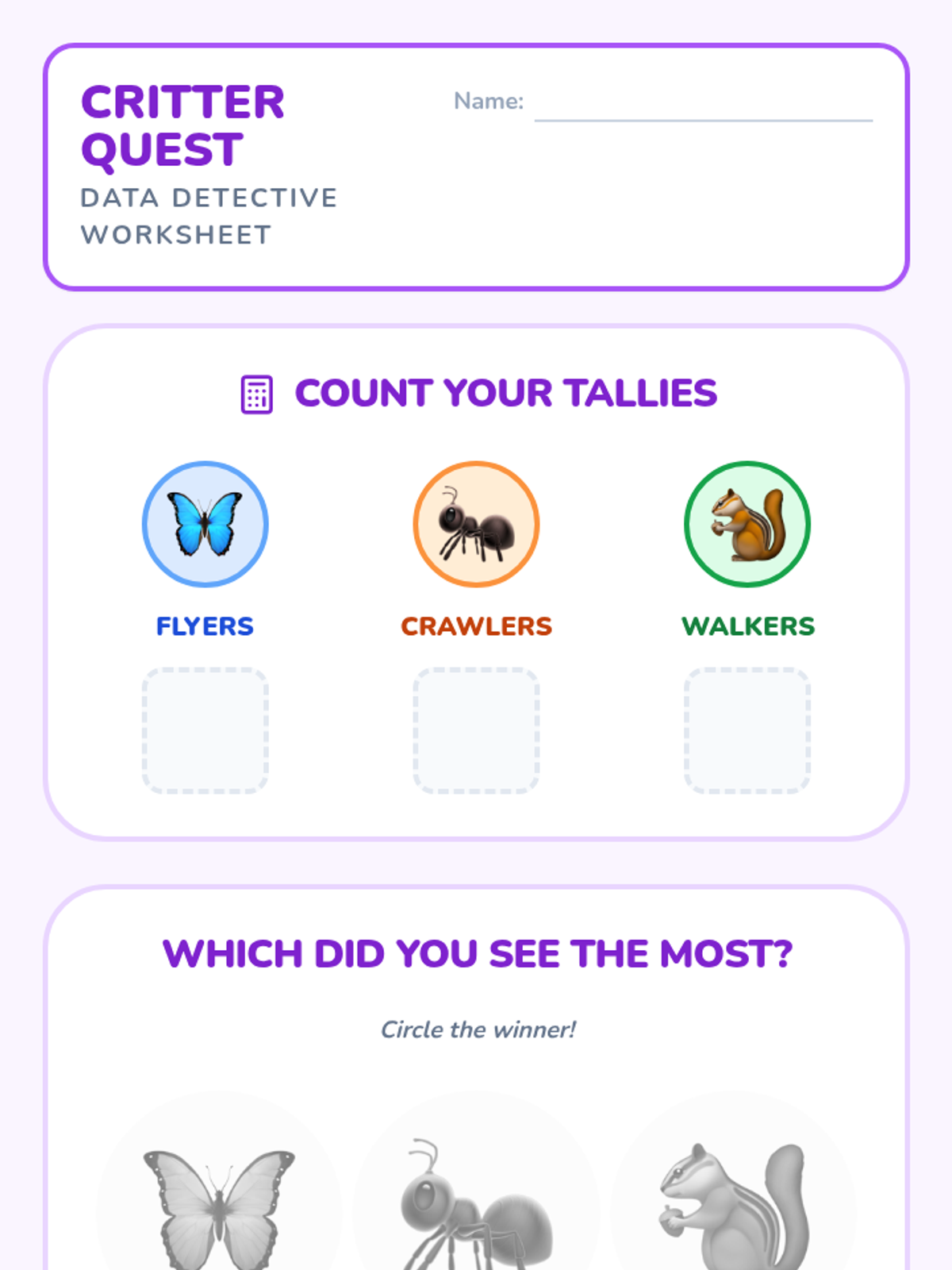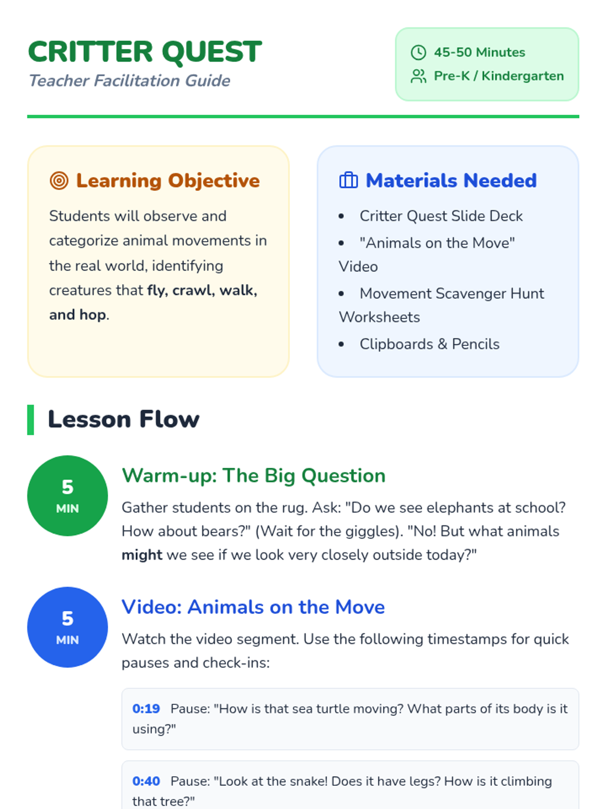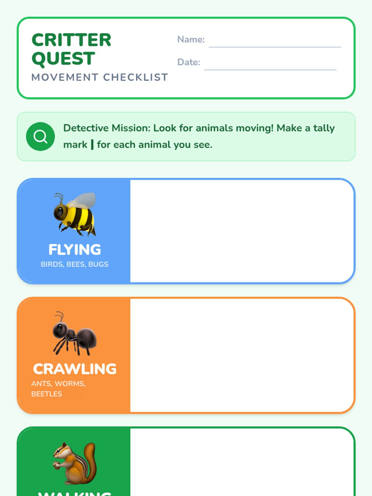 Students will learn about animal locomotion by watching a video and going on a nature walk to observe movements in their local environment. They will practice identifying and tallying different types of movement such as flying, crawling, and walking.