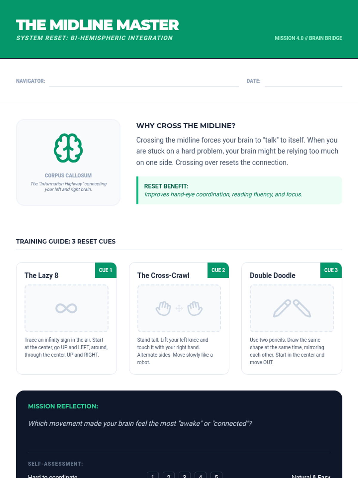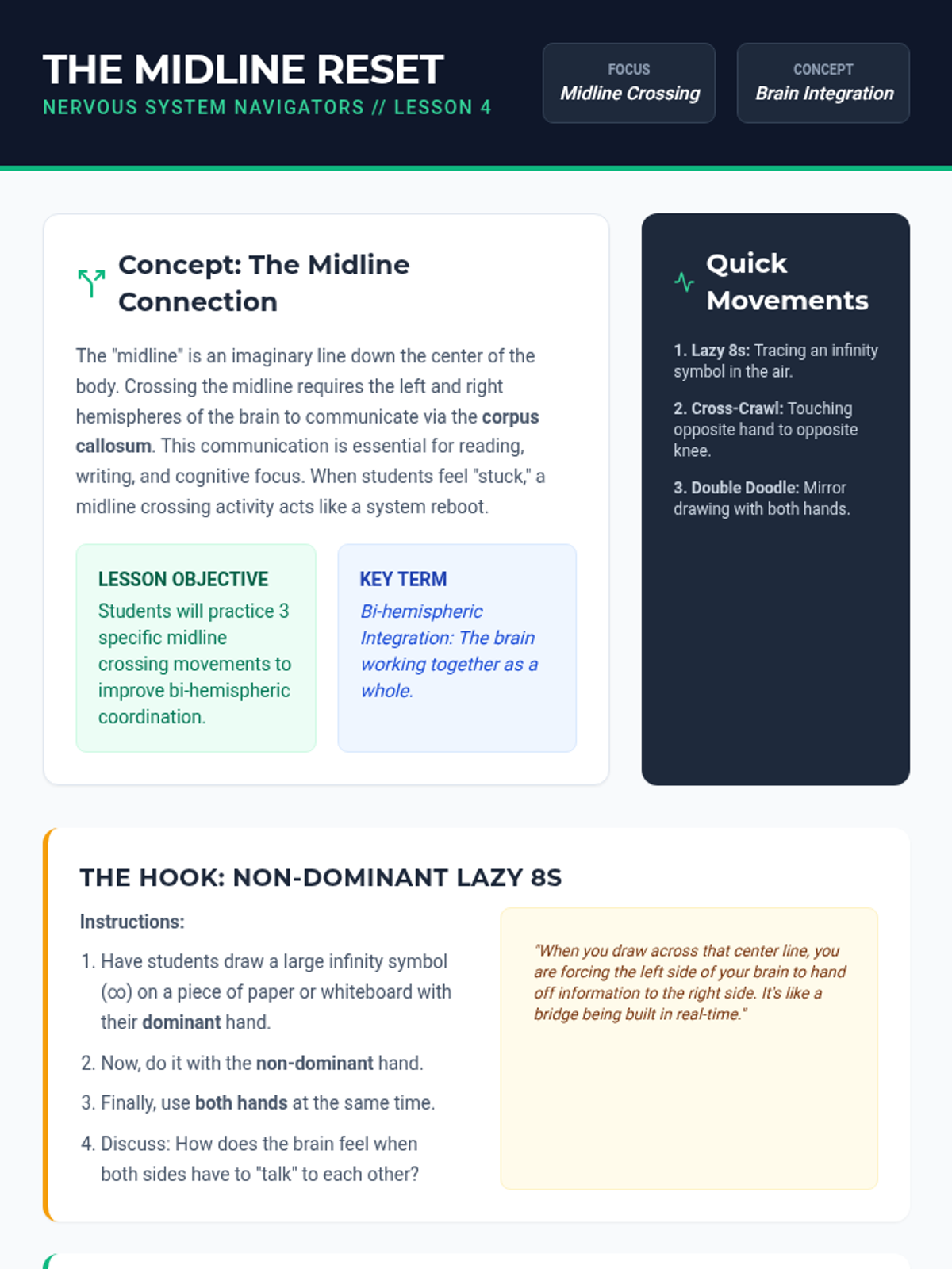 Explore the connection between crossing the body's midline and bi-hemispheric brain integration. Students learn and practice specific movements designed to 'reset' the brain during cognitive blocks.