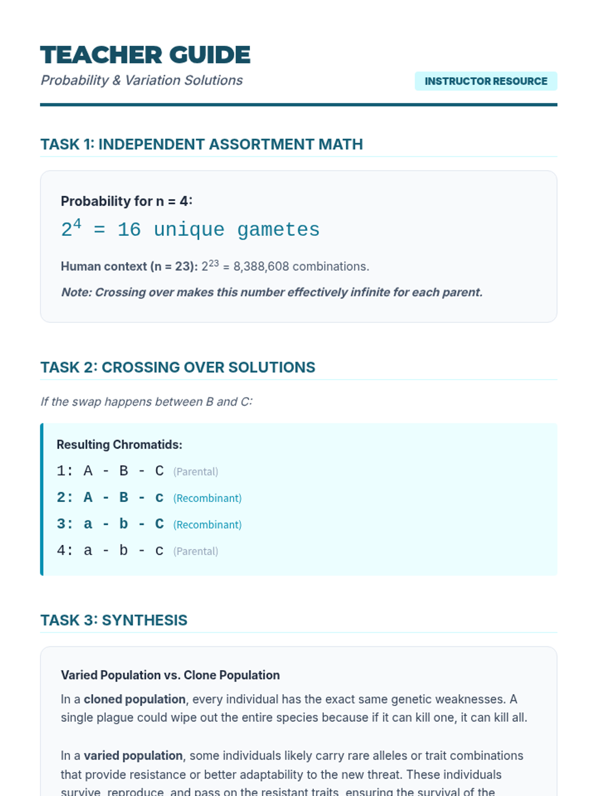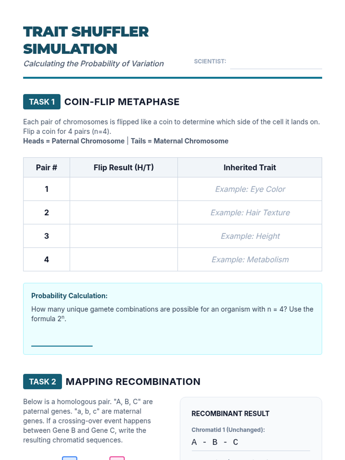 A simulation-based lesson where students explore how crossing over and independent assortment create nearly infinite genetic combinations.