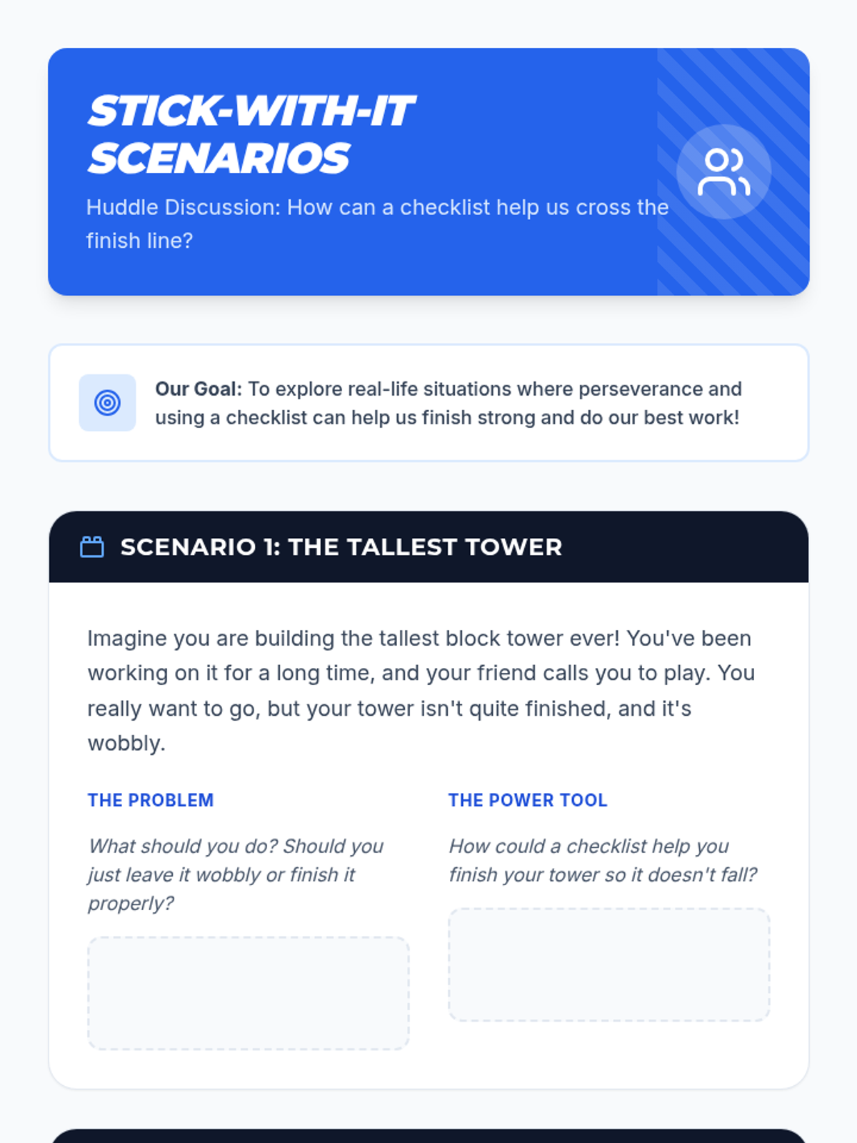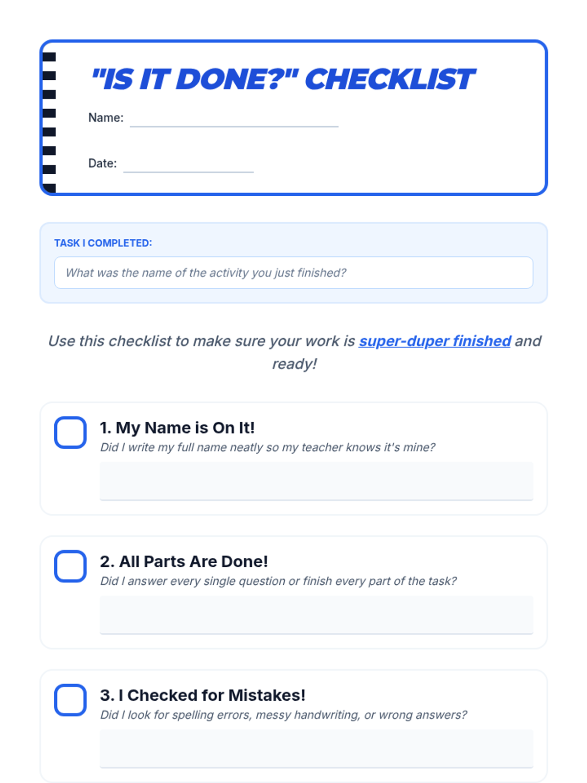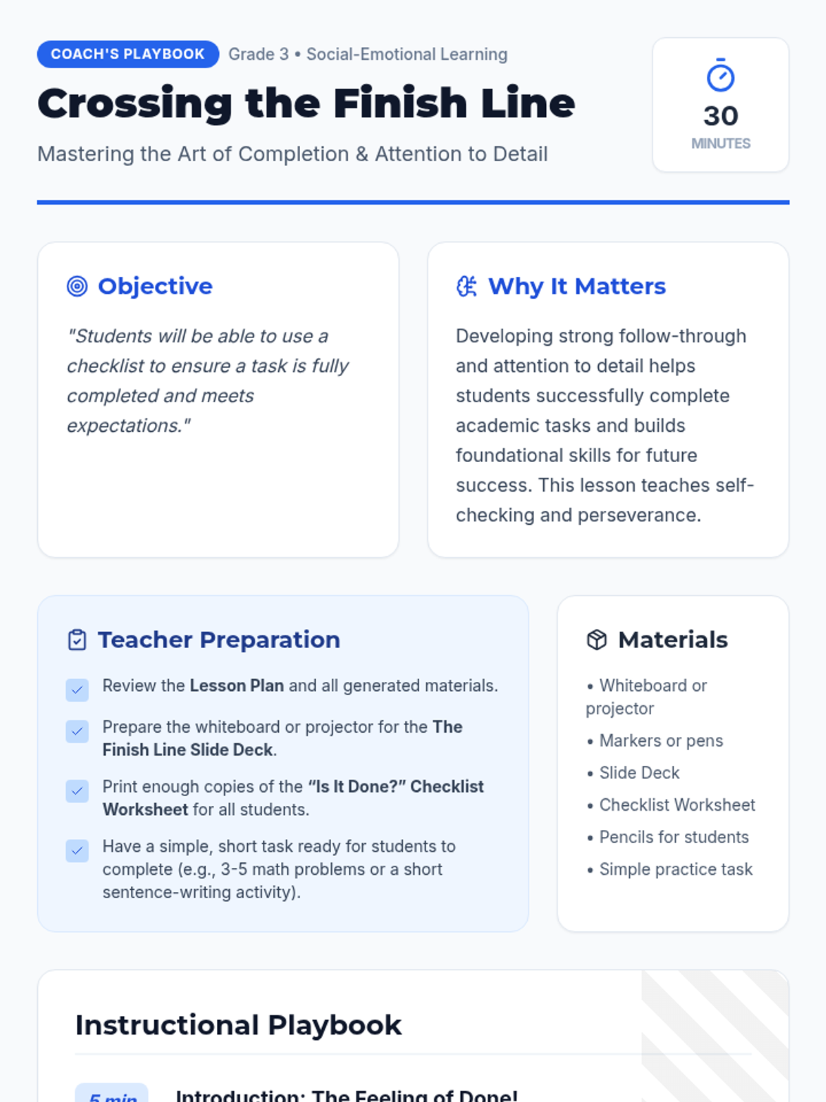 A 30-minute lesson for 3rd-grade students on using checklists to ensure task completion and attention to detail. Students learn that 'done' means meeting expectations, not just stopping work.