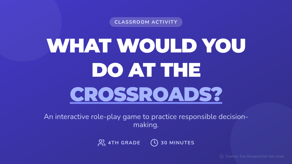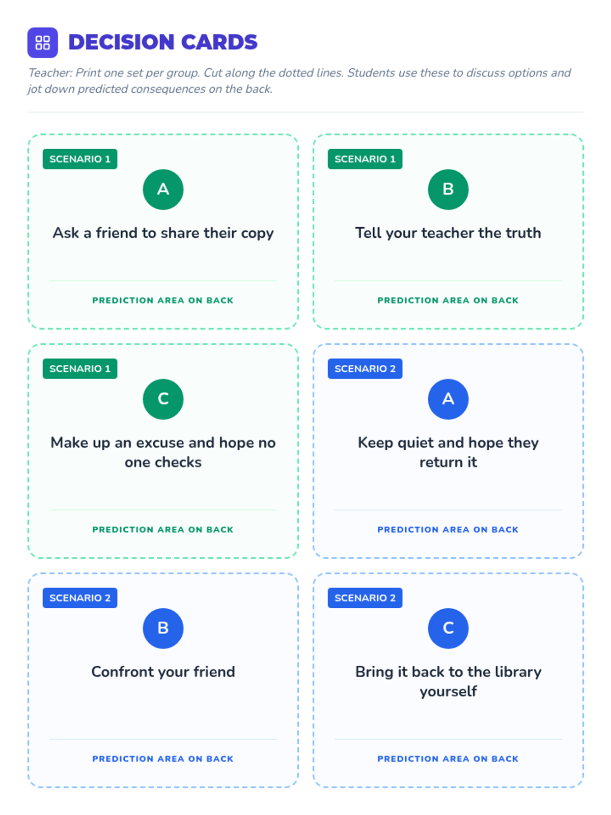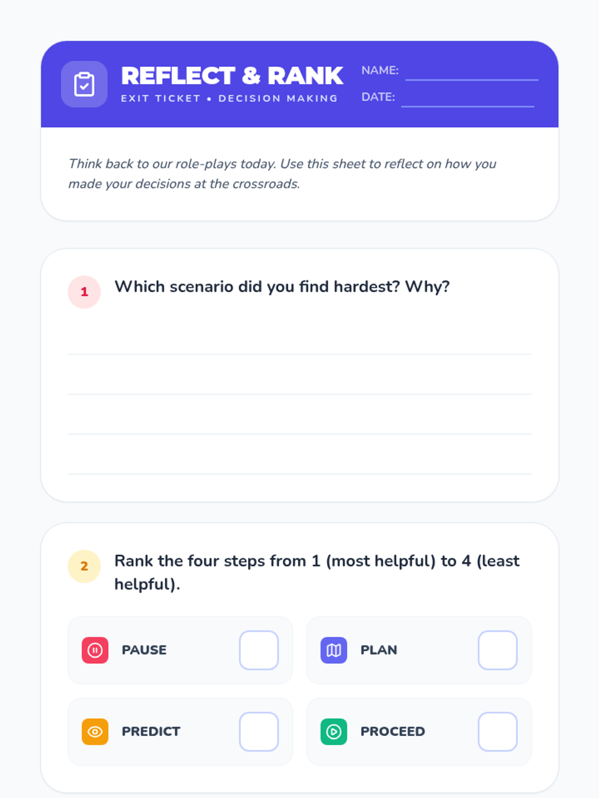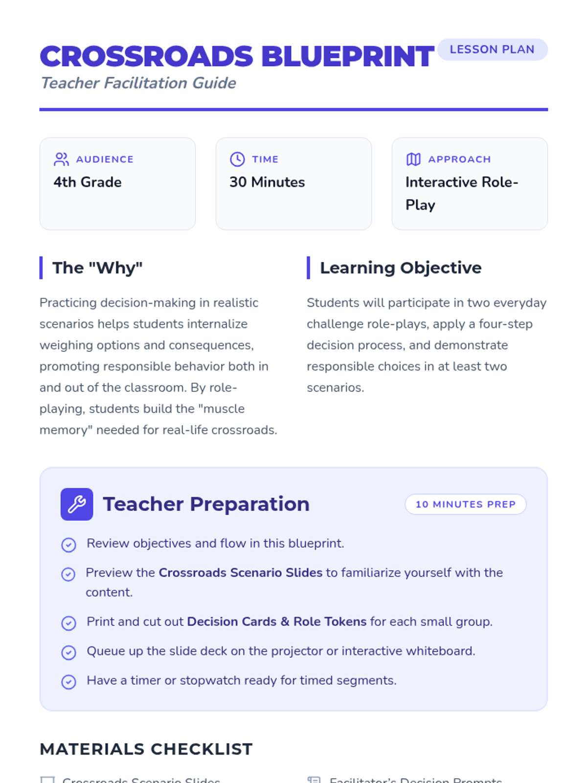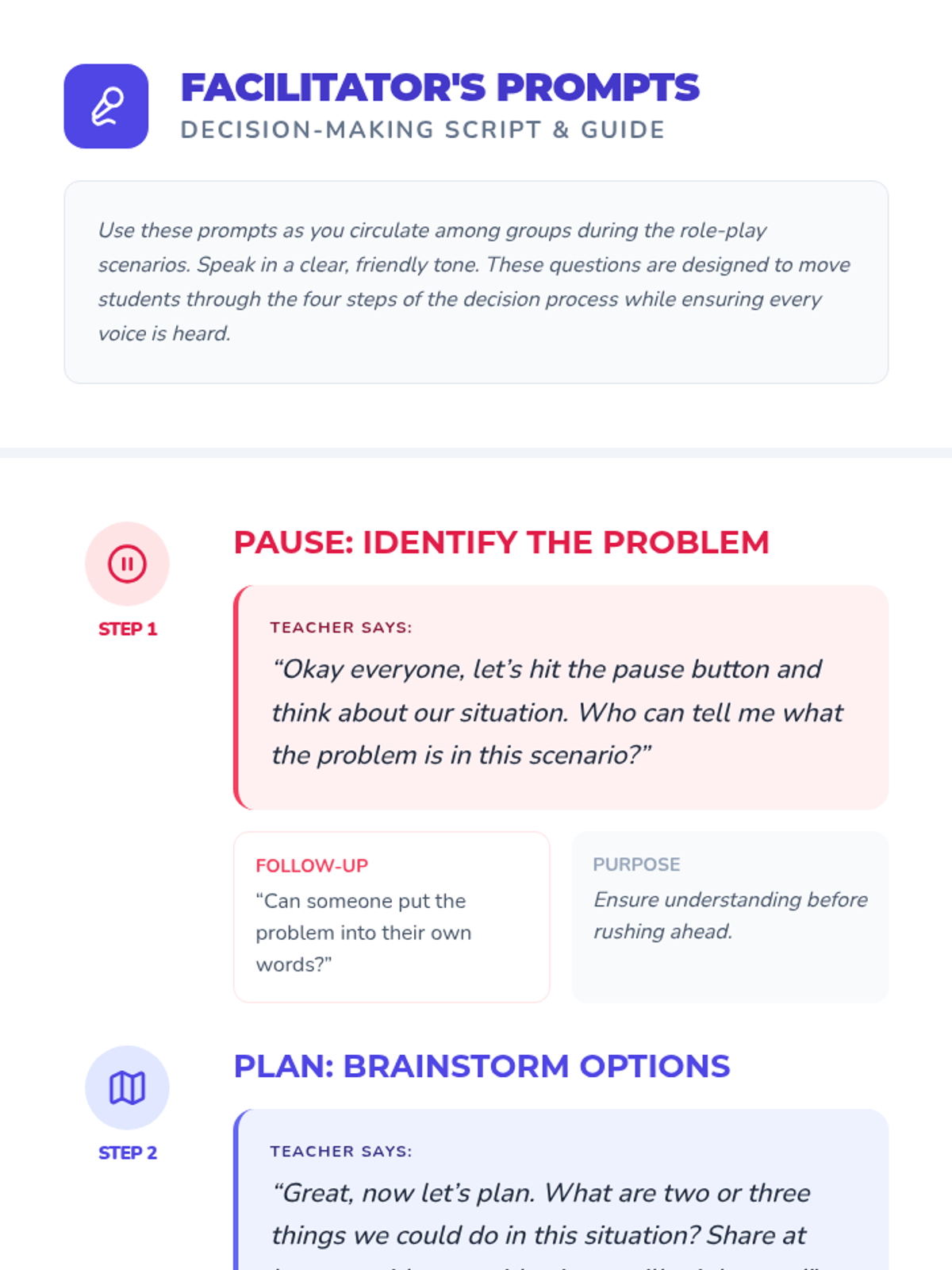 An interactive role-play game for 4th graders to navigate everyday challenges and strengthen their responsible decision-making skills using a four-step process. Students practice 'Pause, Plan, Predict, Proceed' through realistic scenarios.