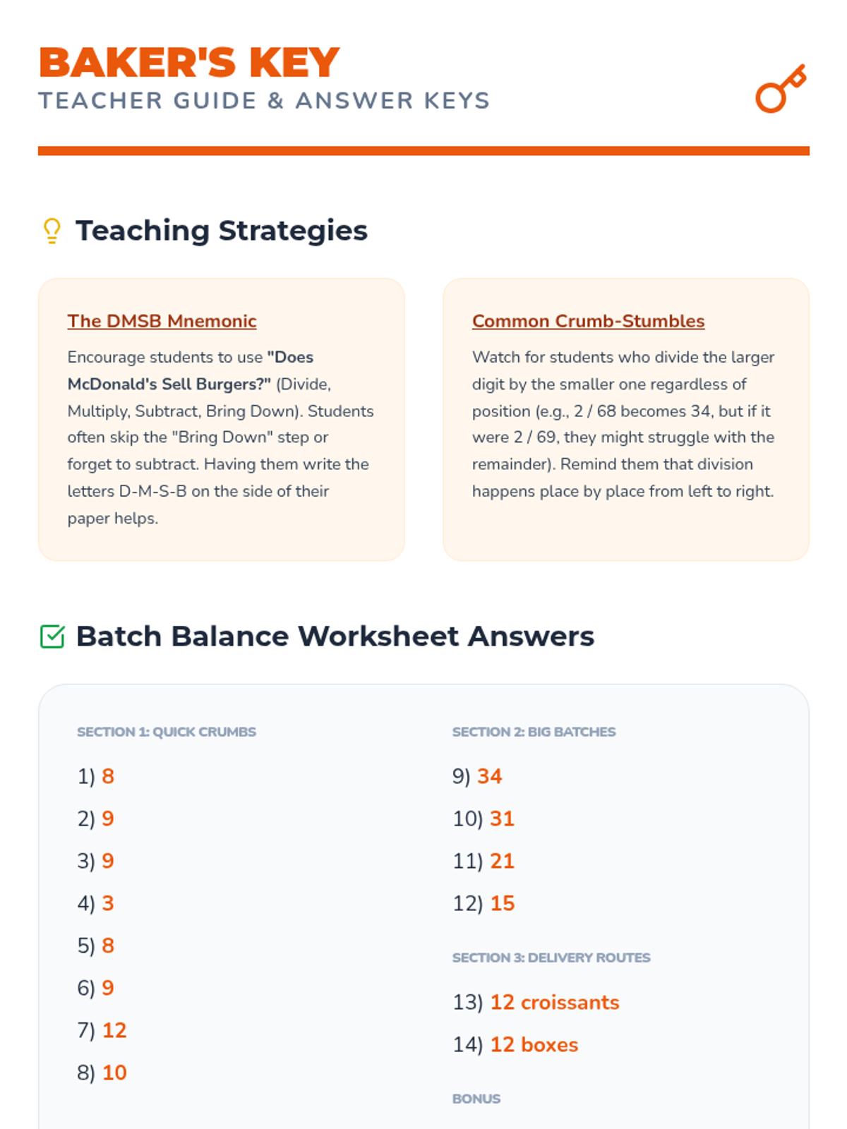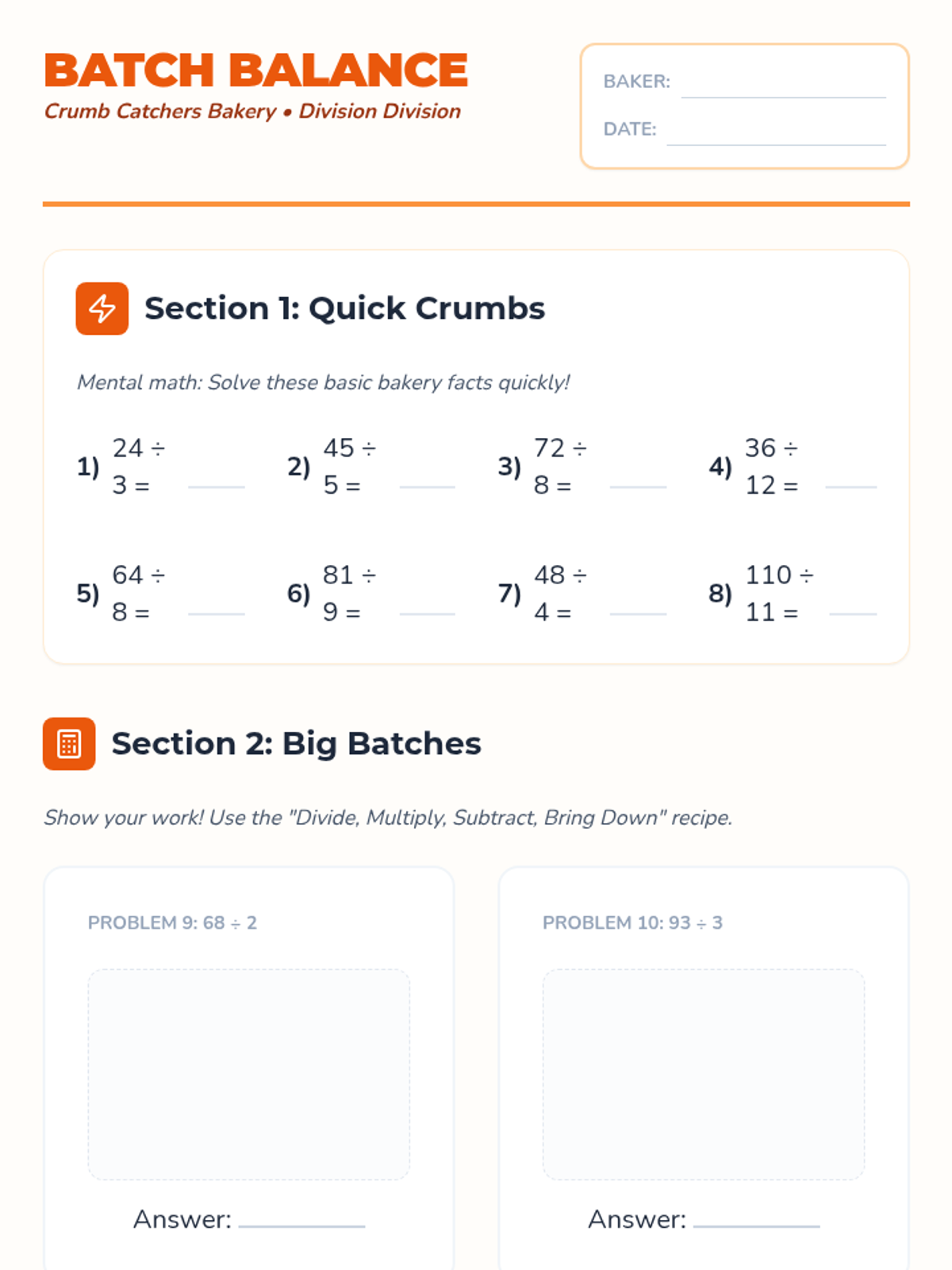 A sweet introduction to division, focusing on basic facts and one-digit divisors without remainders through a bakery-themed lens. Students will master sharing 'crumbs' and 'treats' equally while learning the long division algorithm.