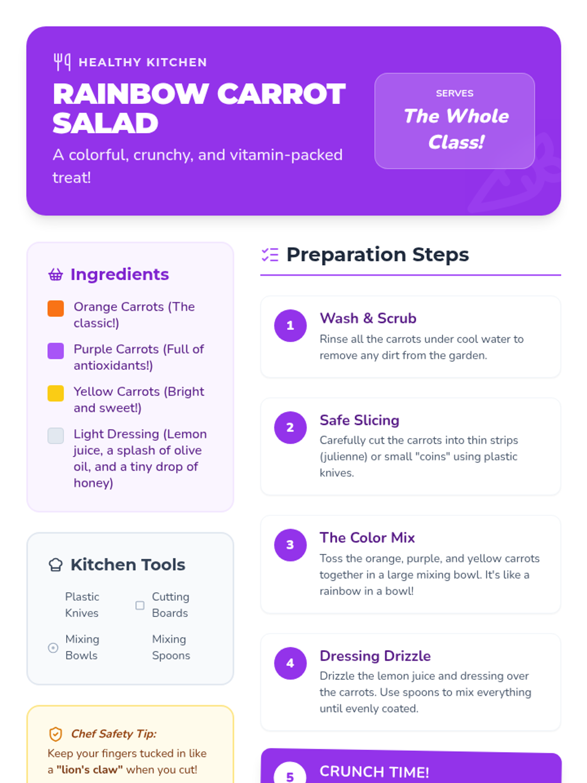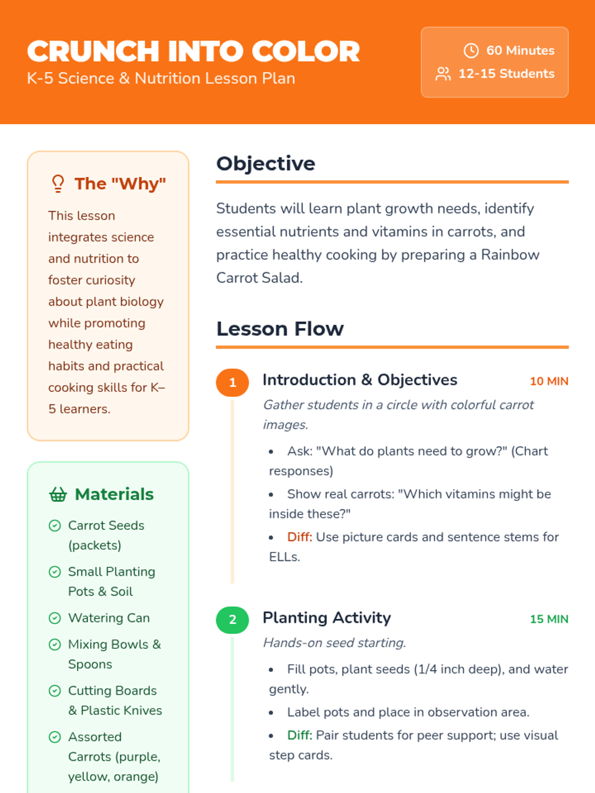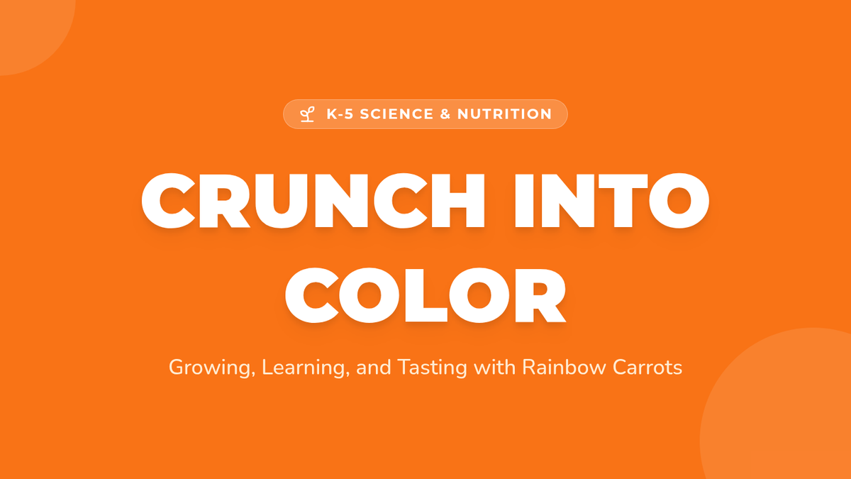 A hands-on K-5 lesson exploring plant biology and nutrition through carrot planting, vitamin matching games, and preparing a vibrant Rainbow Carrot Salad.