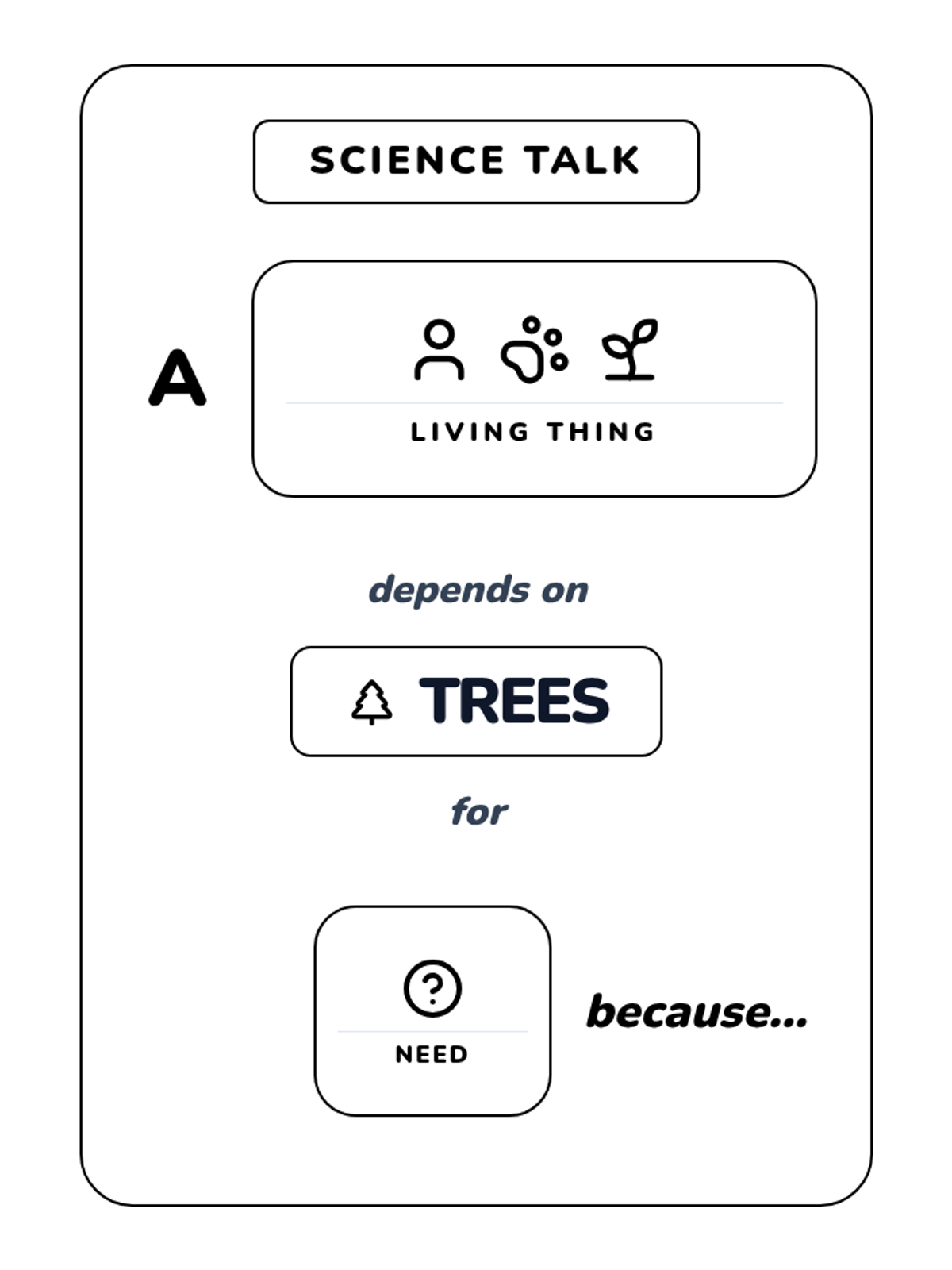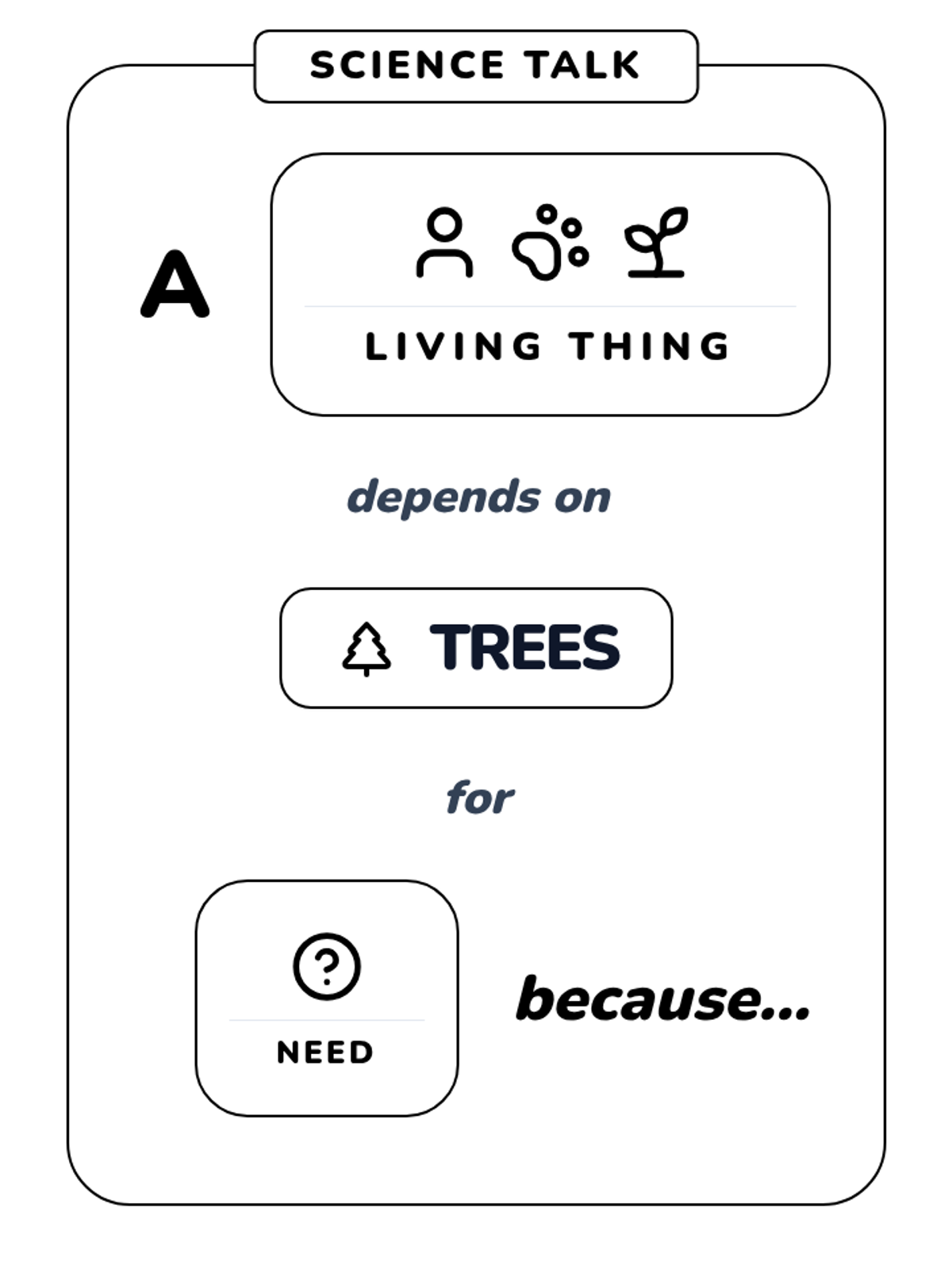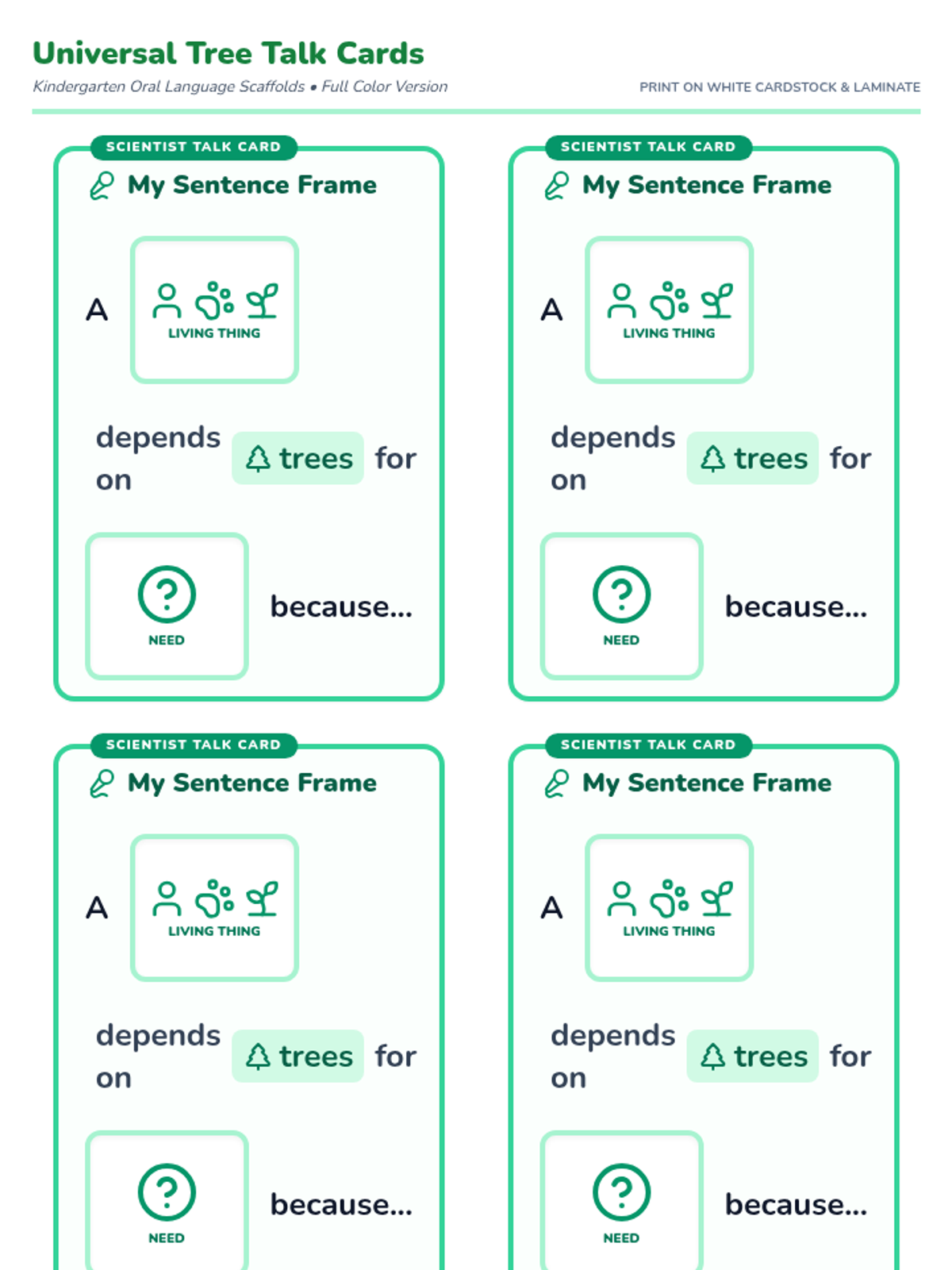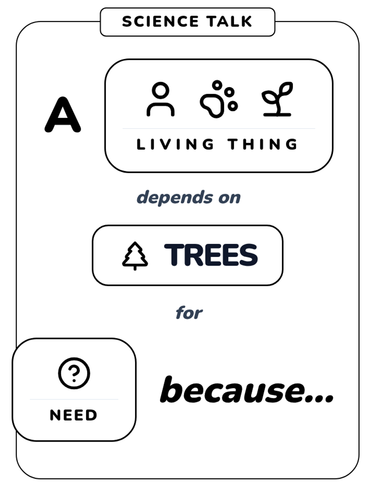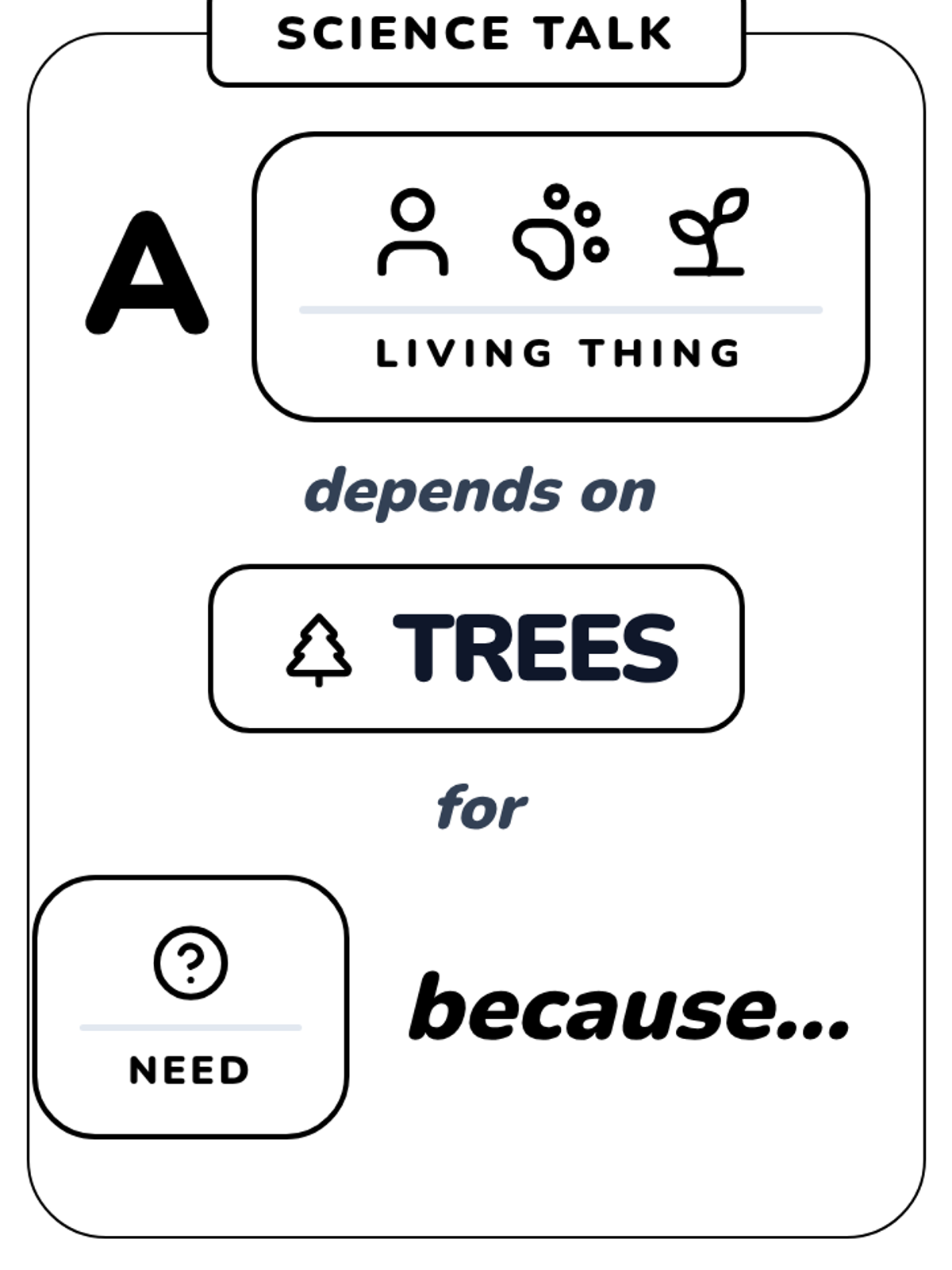 A lesson focused on how living things depend on trees for survival, utilizing visual sentence frames to support Kindergarten oral language development.