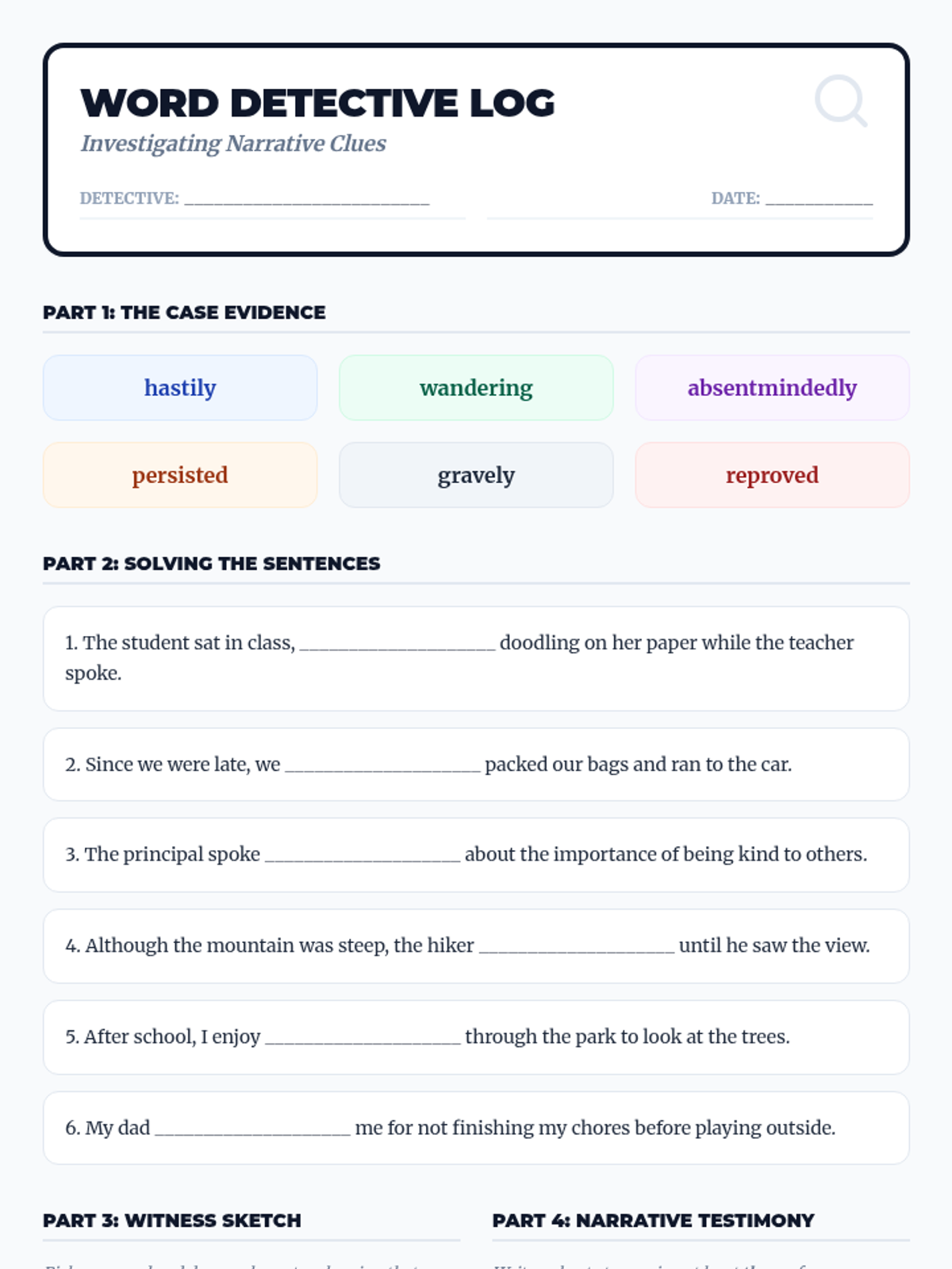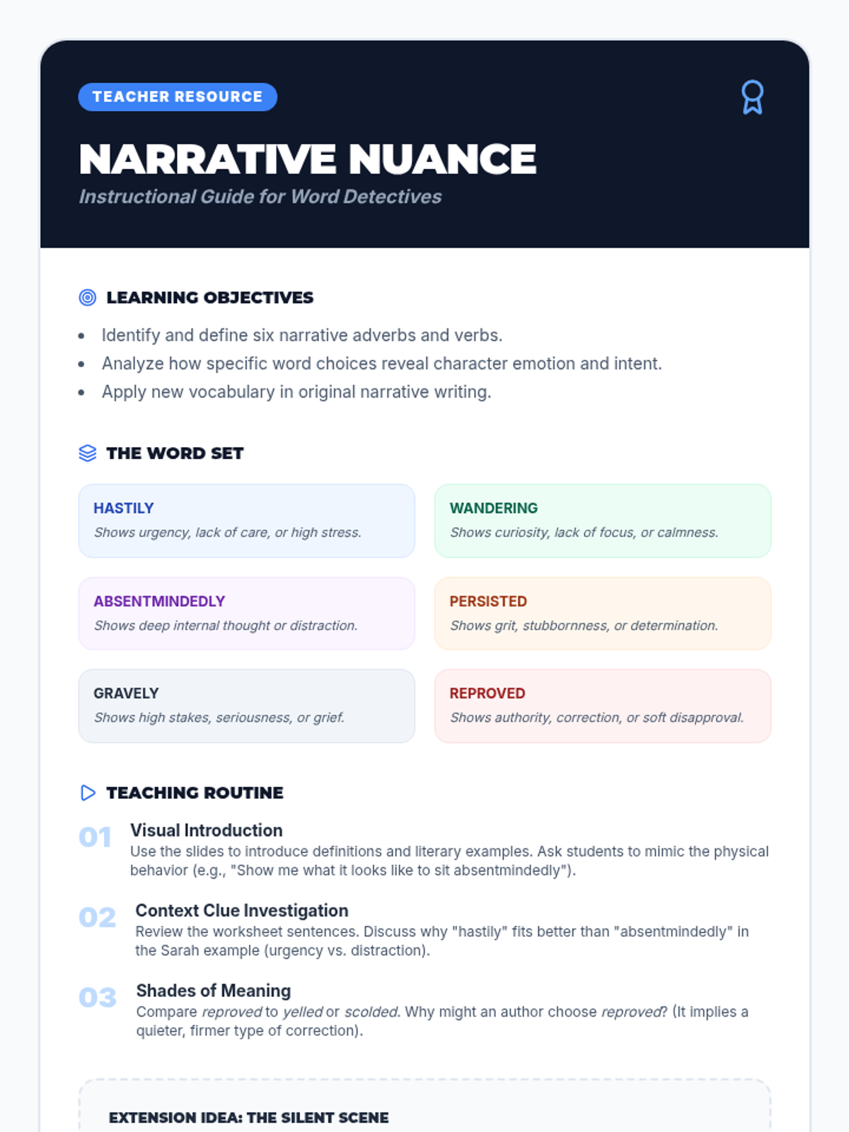 A vocabulary-focused lesson exploring 6 narrative words (hastily, wandering, absentmindedly, persisted, gravely, reproved) to understand character behavior and emotion for 4th graders.