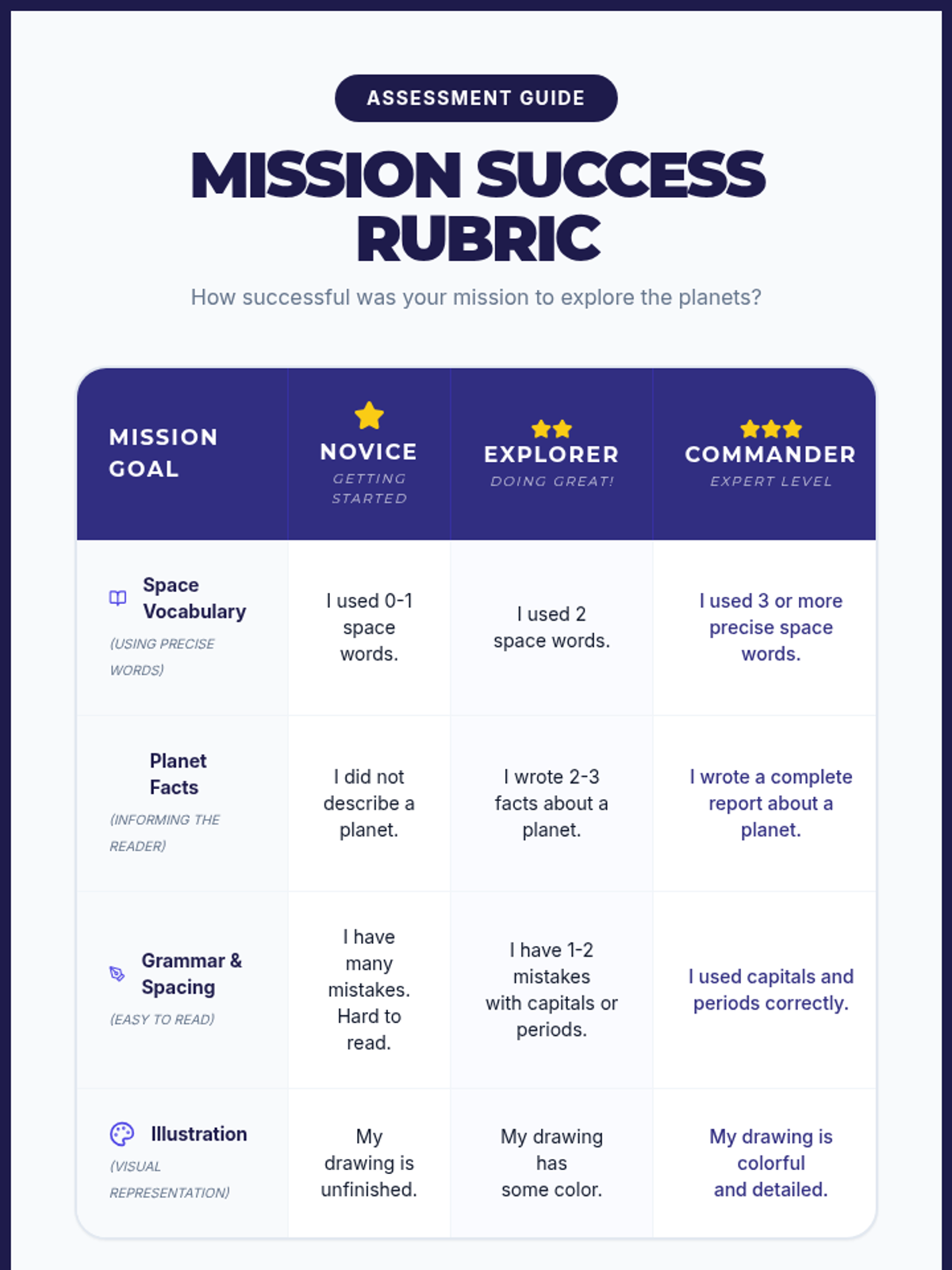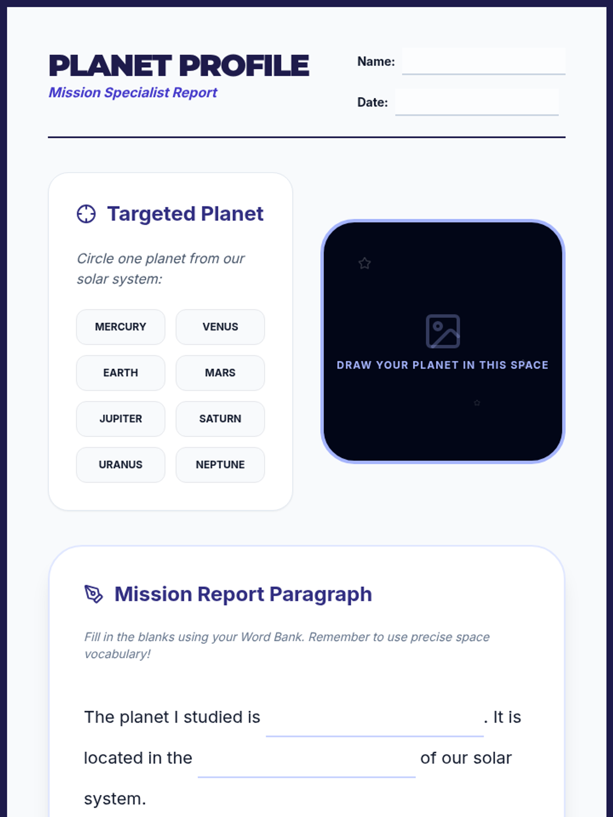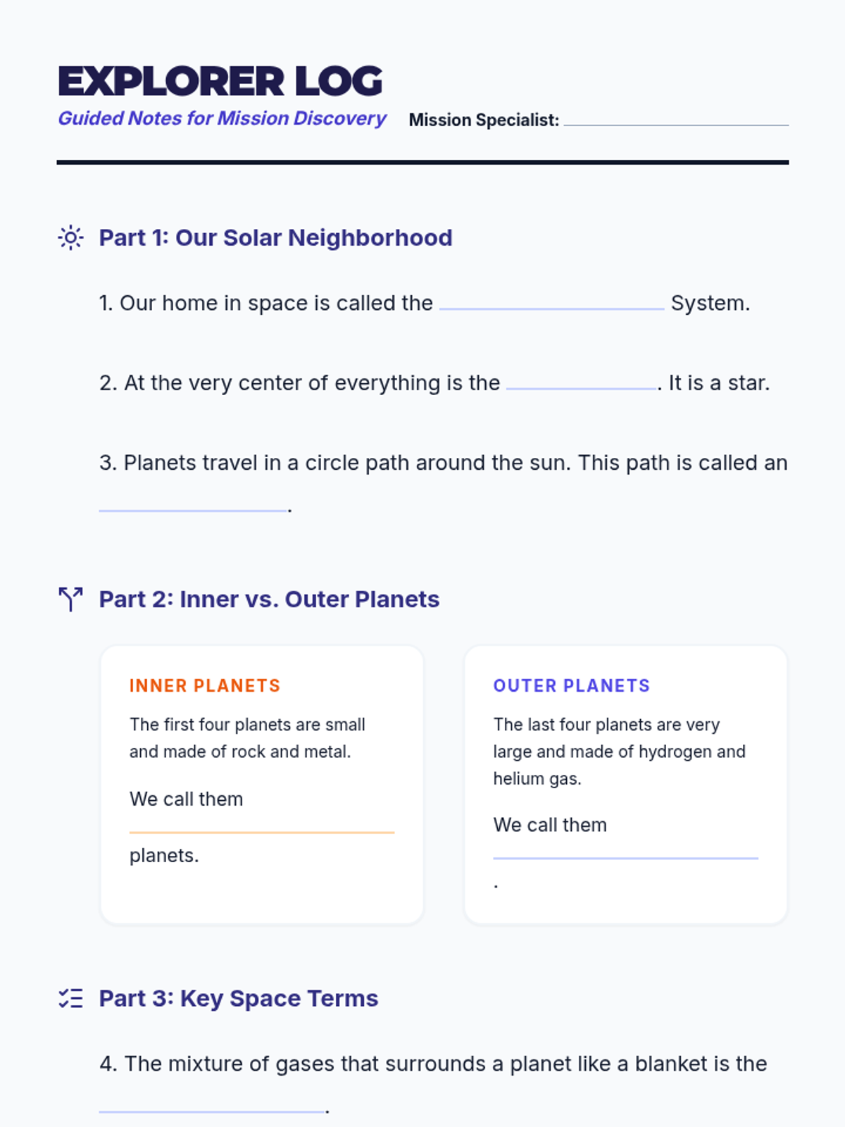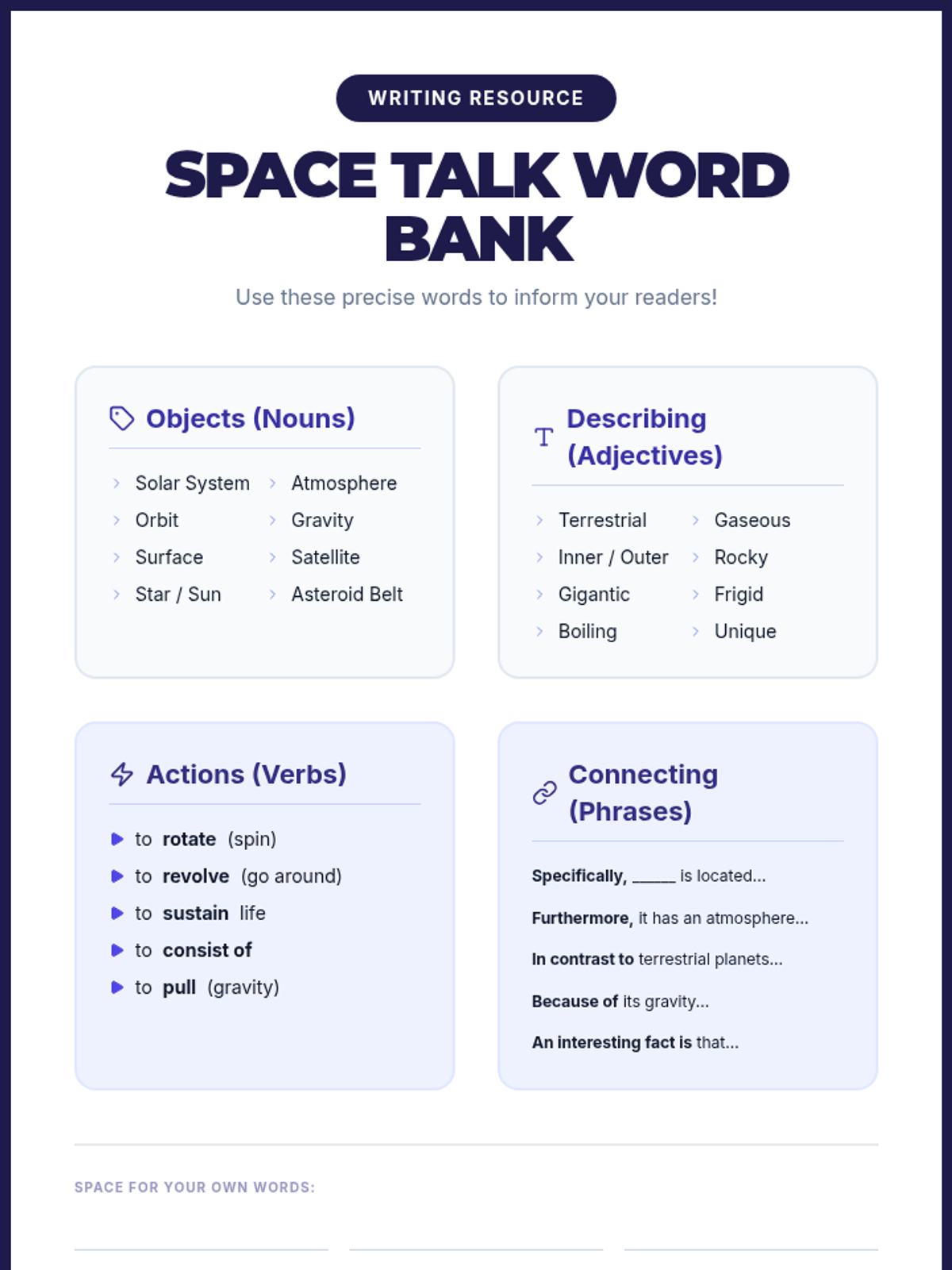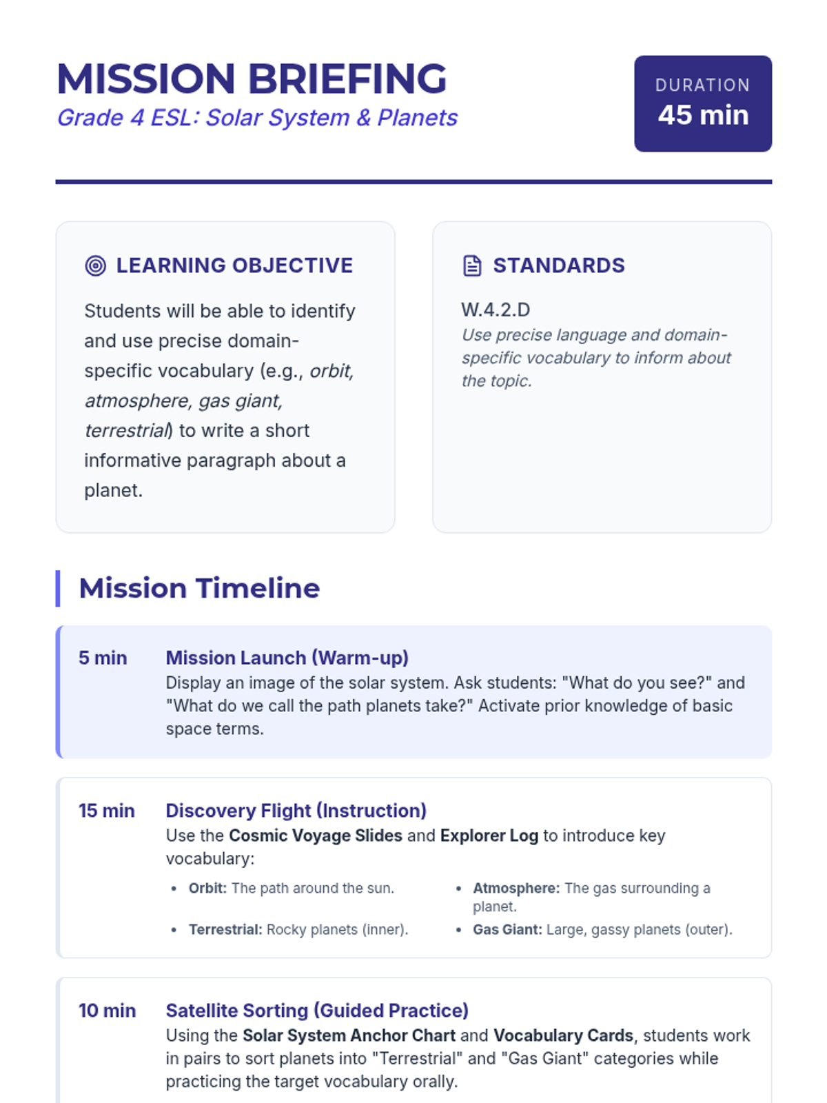 A 45-minute ESL lesson focused on identifying and using precise domain-specific vocabulary to describe the solar system and its planets, culminating in a scaffolded writing task.