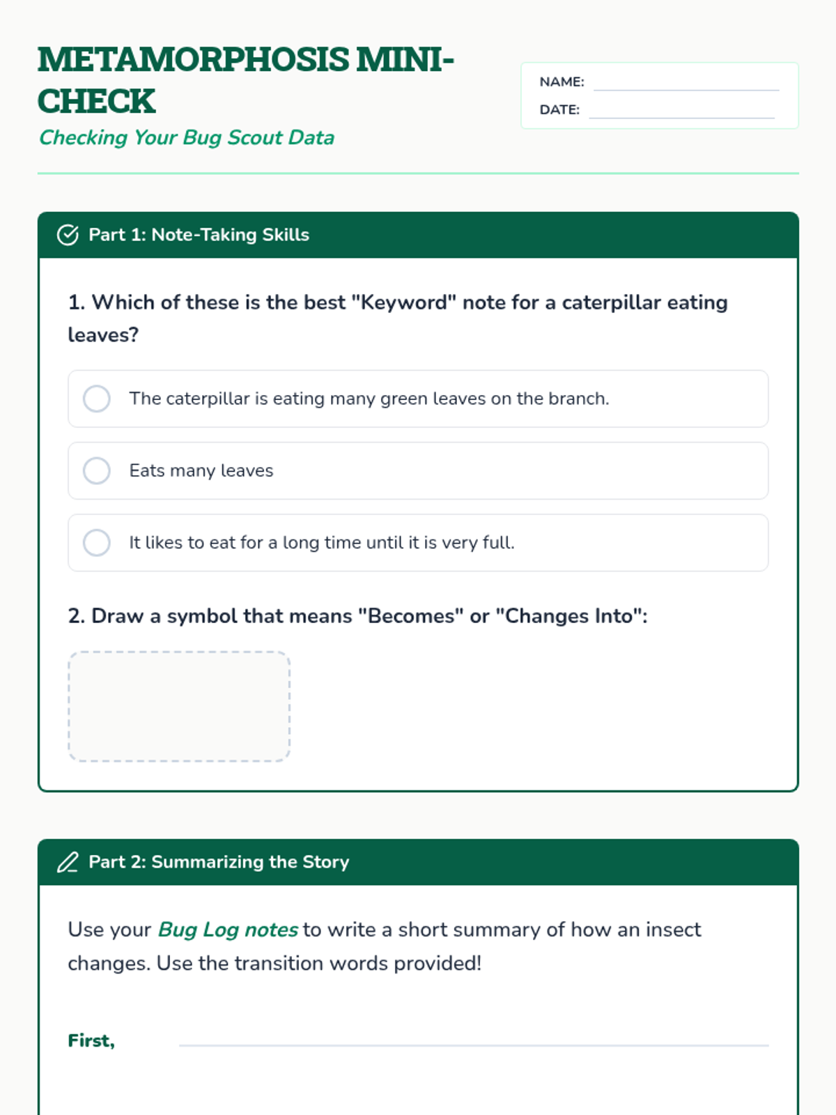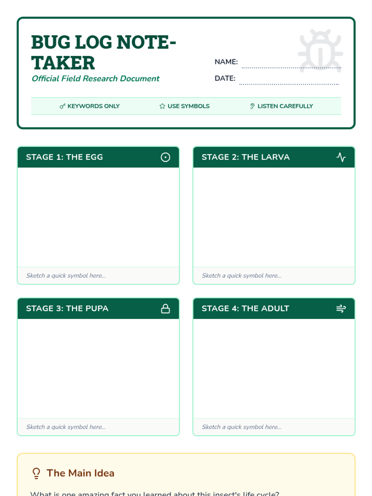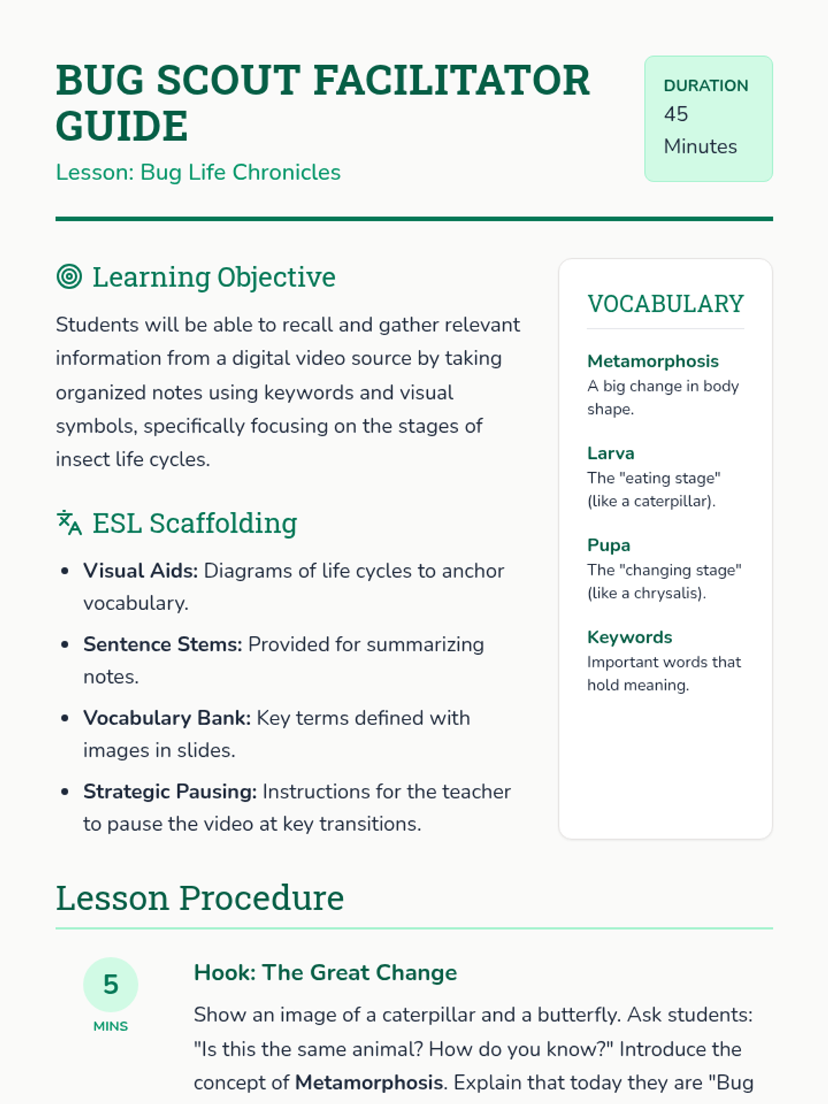 In this 45-minute lesson, Grade 5 ESL students learn to gather information from a digital source by taking organized notes on insect life cycles. Students practice identifying keywords, using visual symbols, and summarizing stages of metamorphosis.