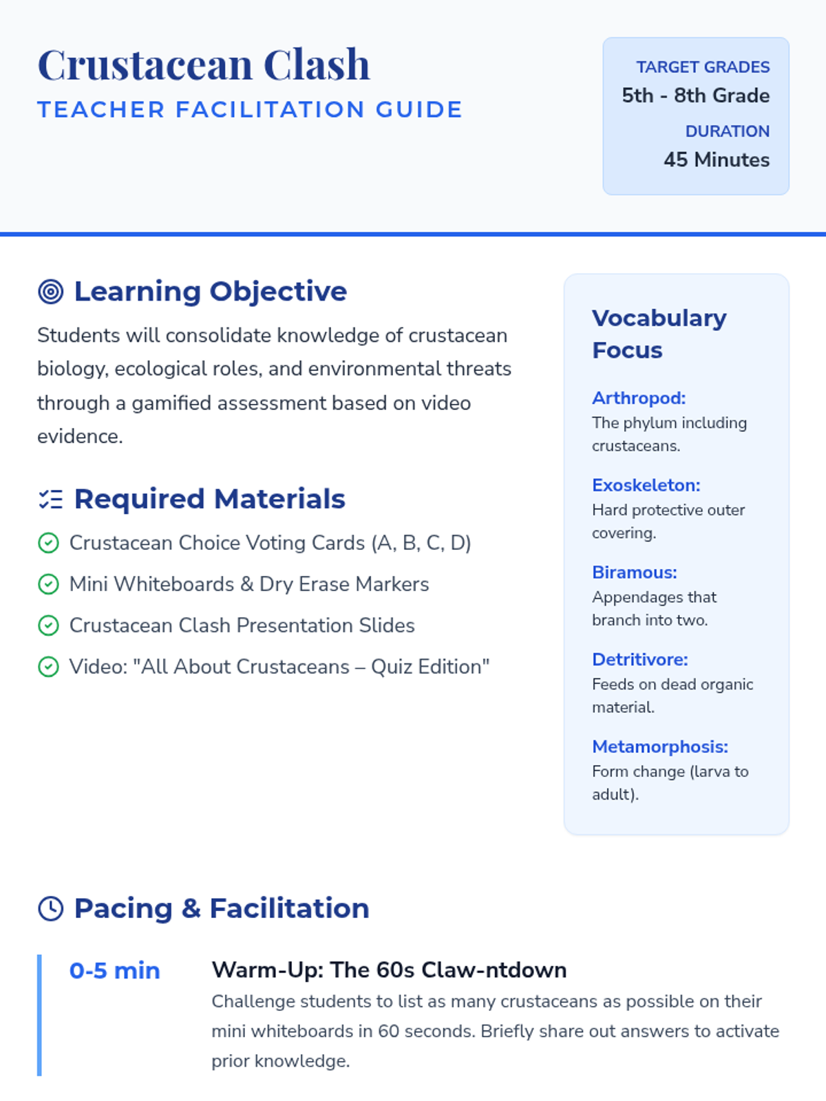 A fast-paced review lesson where students consolidate their knowledge of crustacean biology, ecology, and human impact through a gamified video quiz challenge.