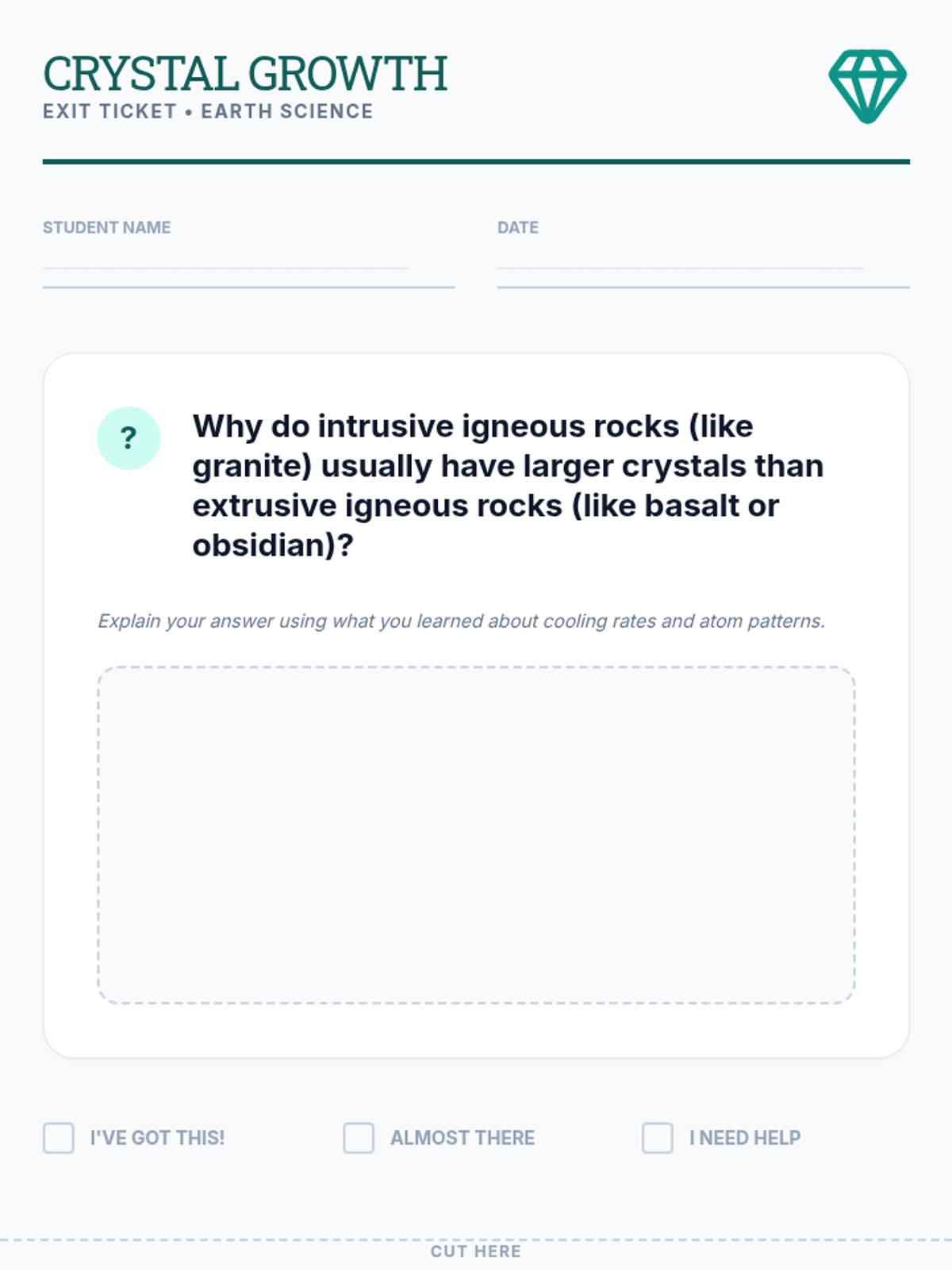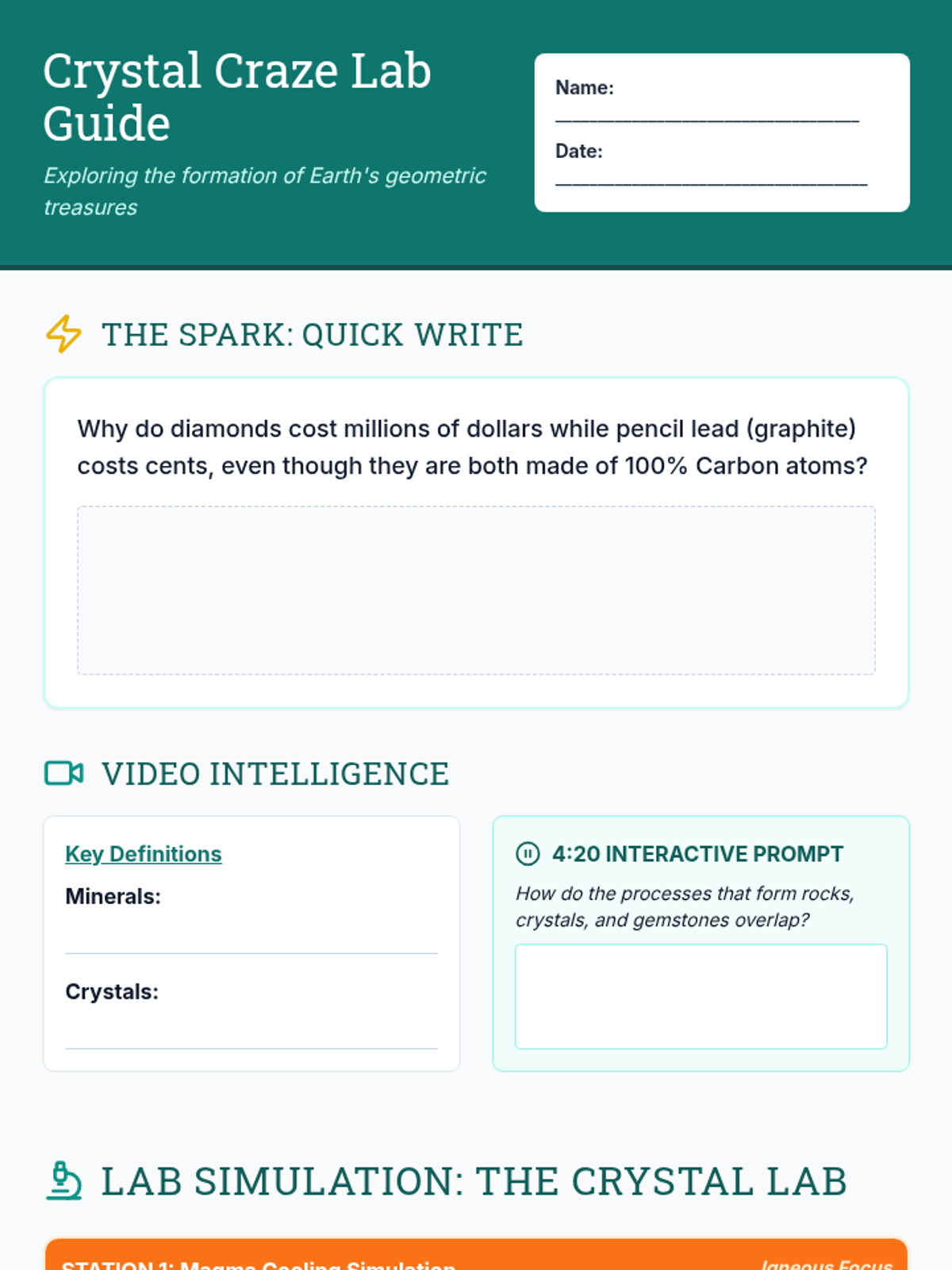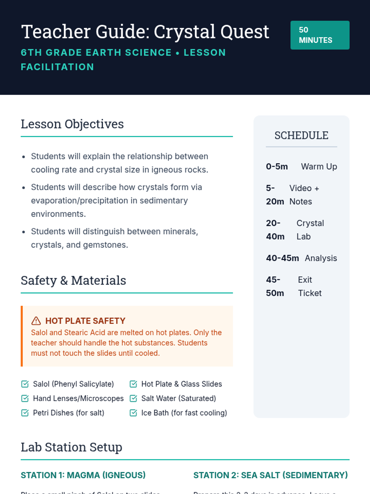 A 6th-grade Earth Science lesson exploring how crystals form in different rock types. Students compare cooling rates in 'magma' to evaporation in 'sedimentary' processes using a hands-on lab and a detailed video study.