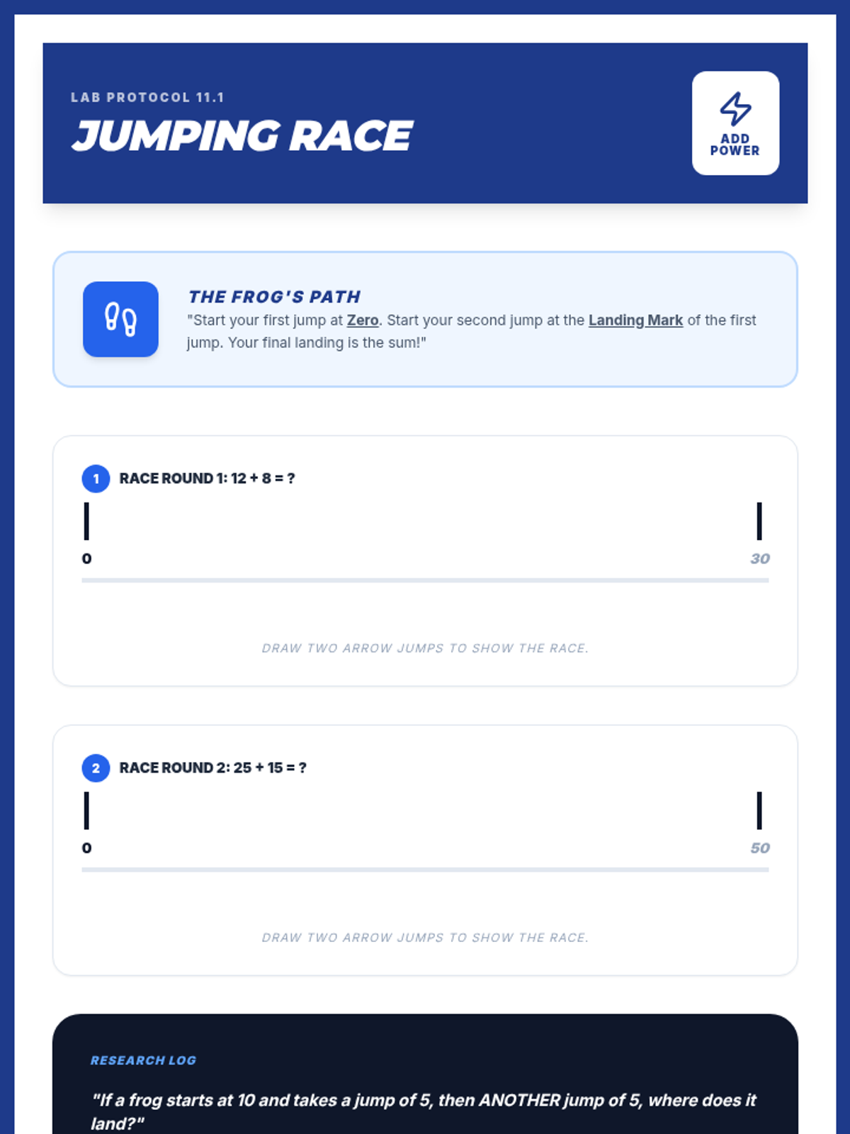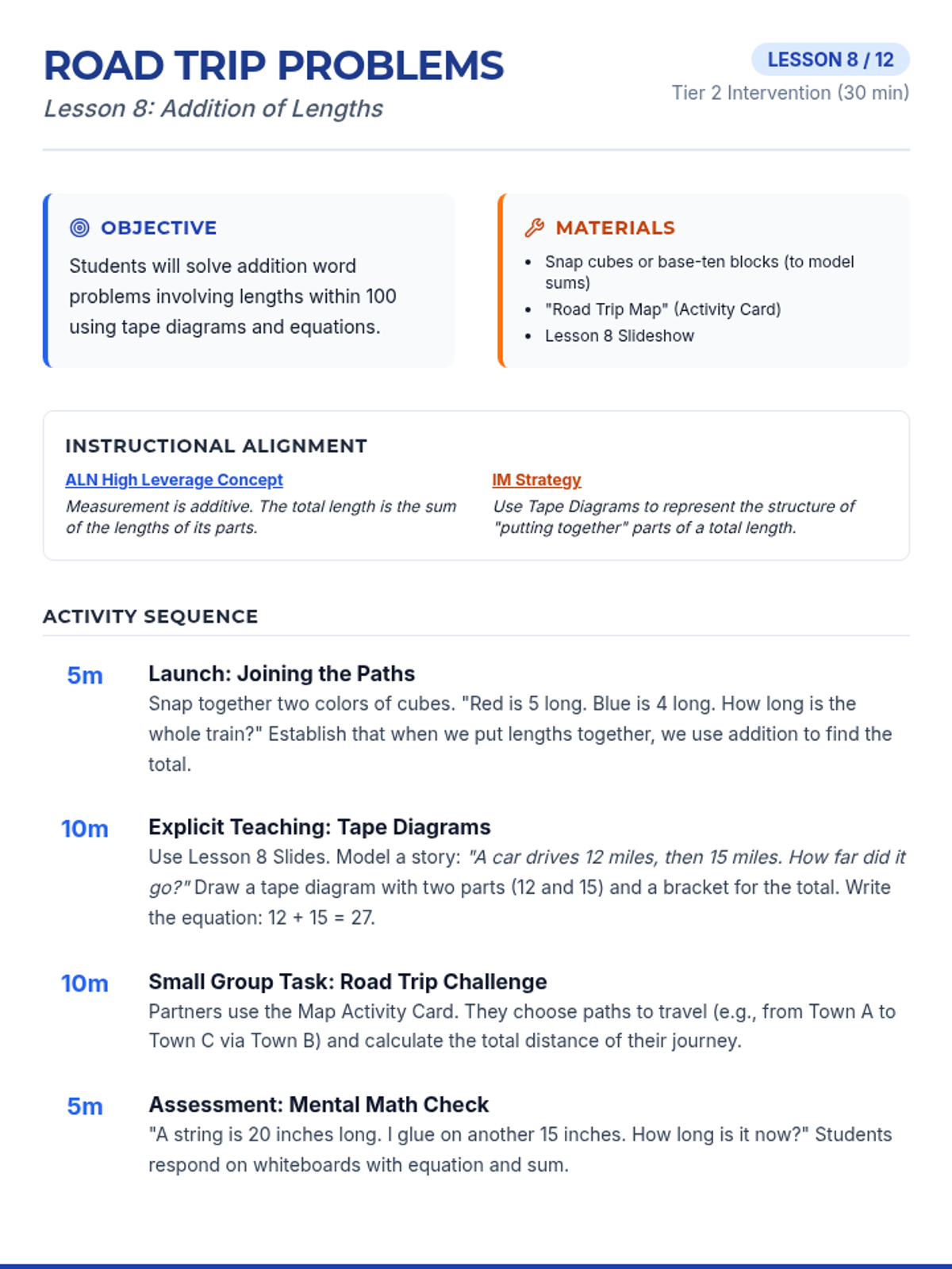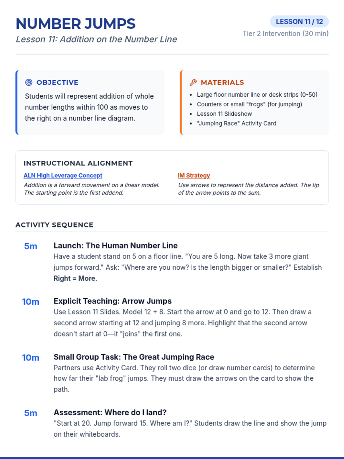 A lesson on addition within 100 using the incrementing algorithm. Students learn to break down the smaller part into its place values and add them step-by-step to the larger part using a "mountain jumping" visual theme.