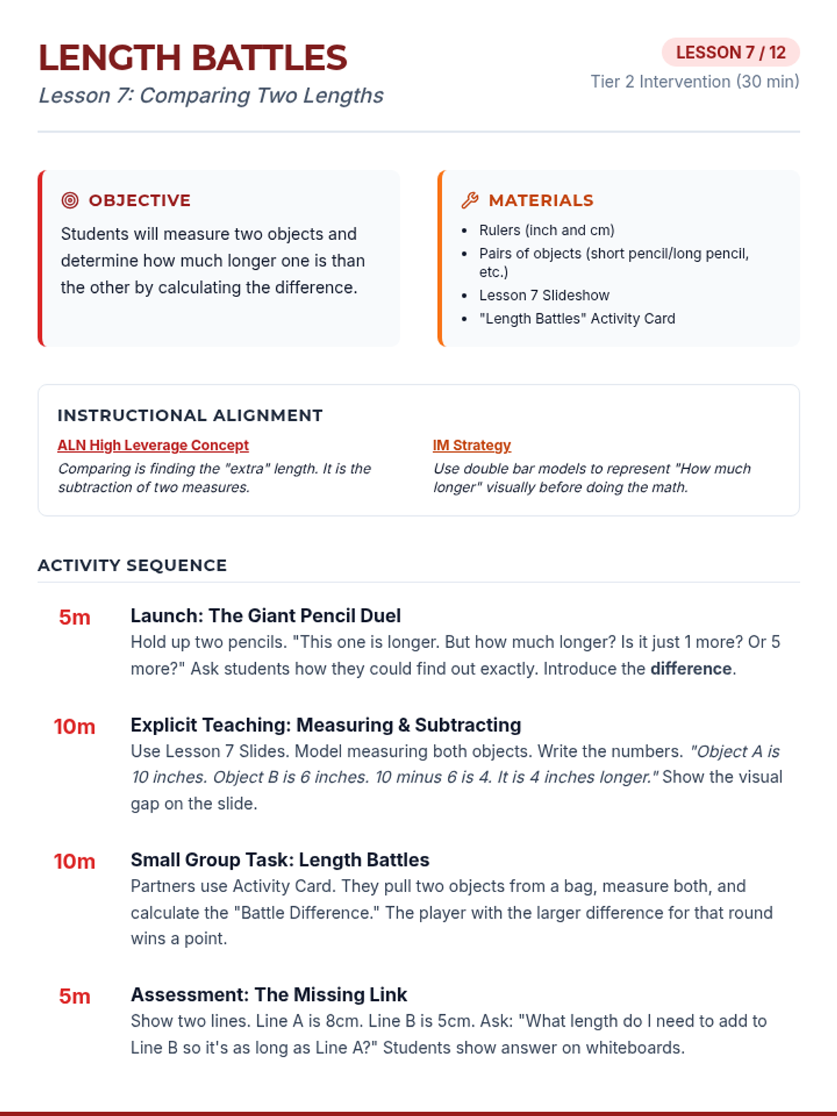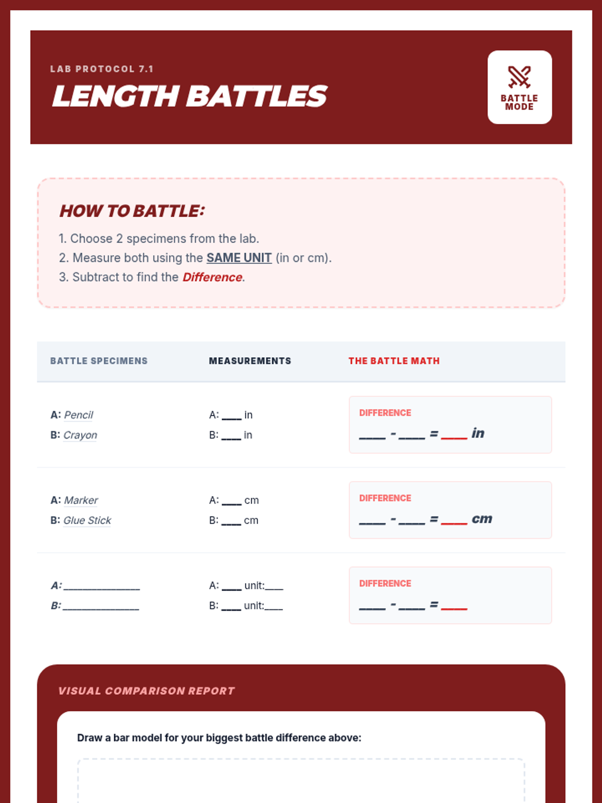 Focuses on comparing two lengths and calculating the difference to determine how much longer one object is than another.
