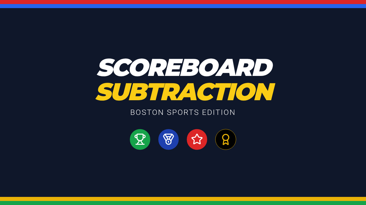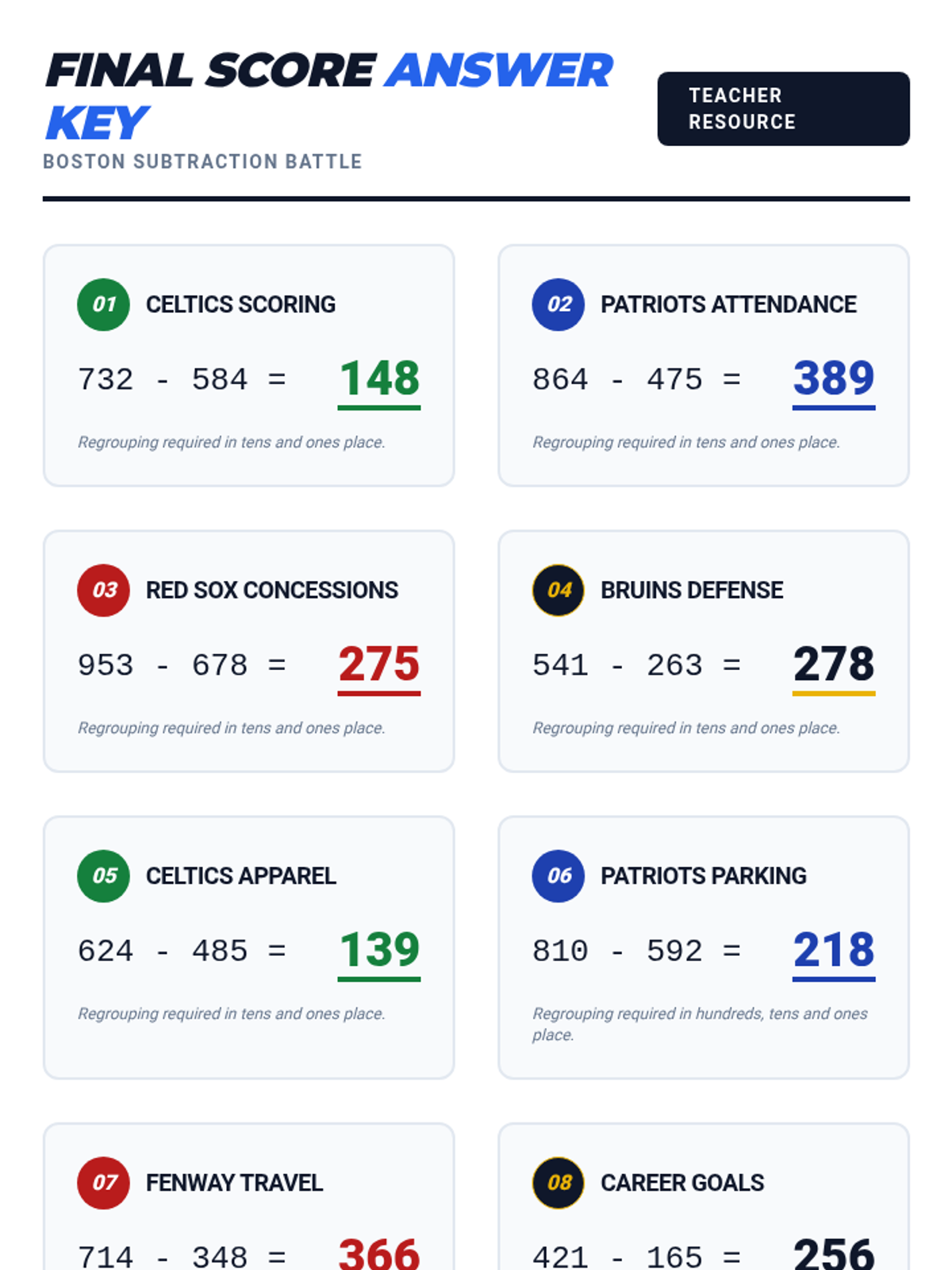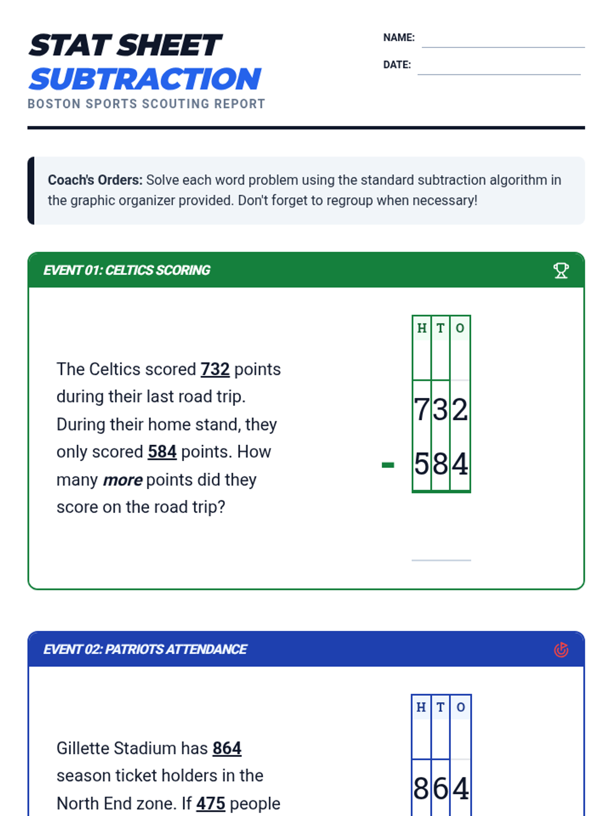 A subtraction-focused lesson themed around Boston's major sports teams, covering 3-digit subtraction with regrouping through word problems and the standard algorithm.