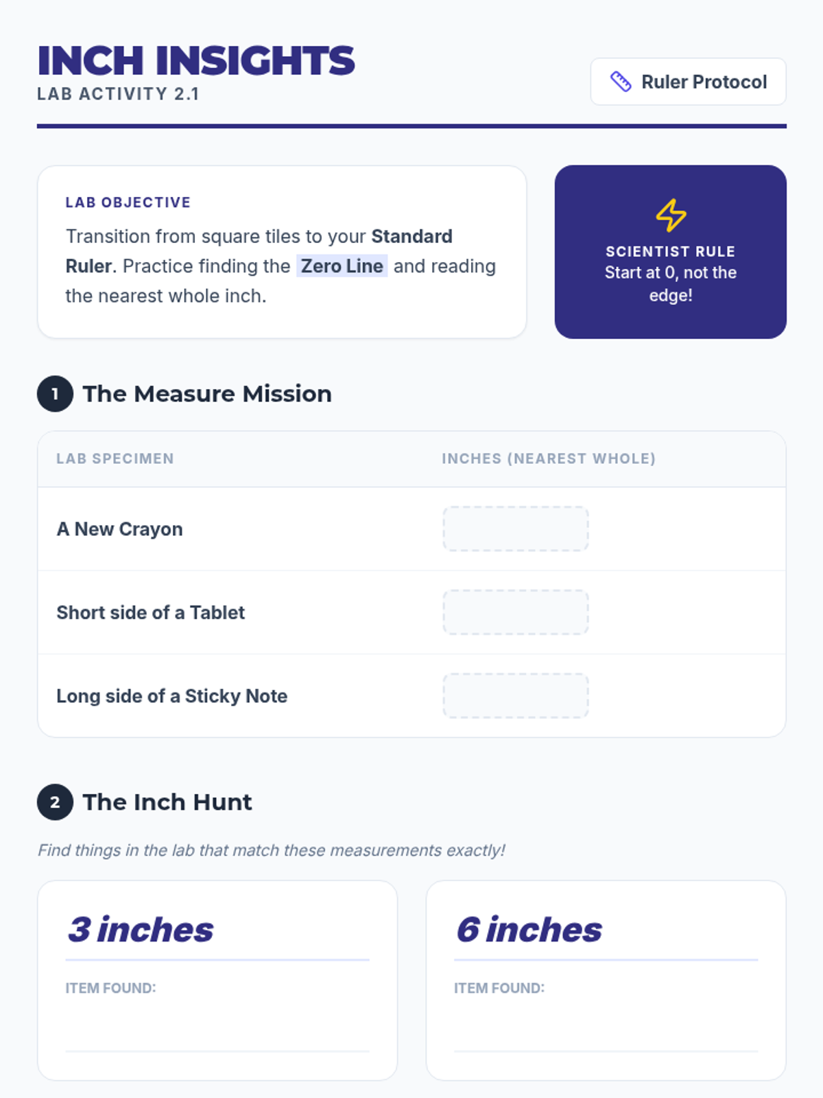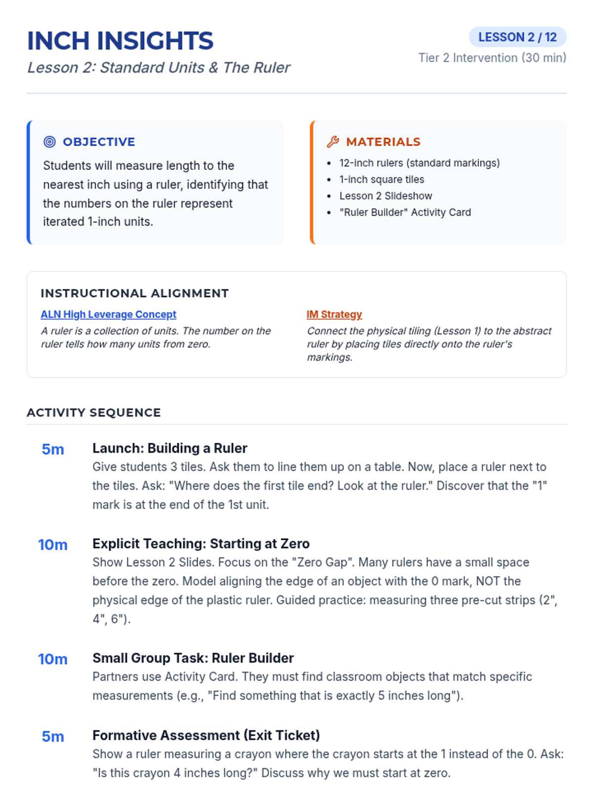 Introduces the standard inch unit and transitions from iterating individual tiles to using a ruler as a tool that represents iterated units.