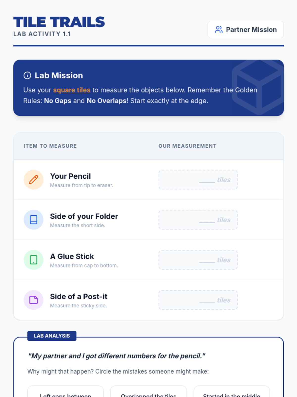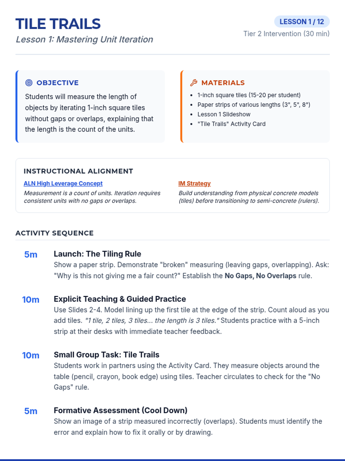 Focuses on the concept of unit iteration using non-standard units (square tiles) to understand that measurement is a count of equal-sized units without gaps or overlaps.