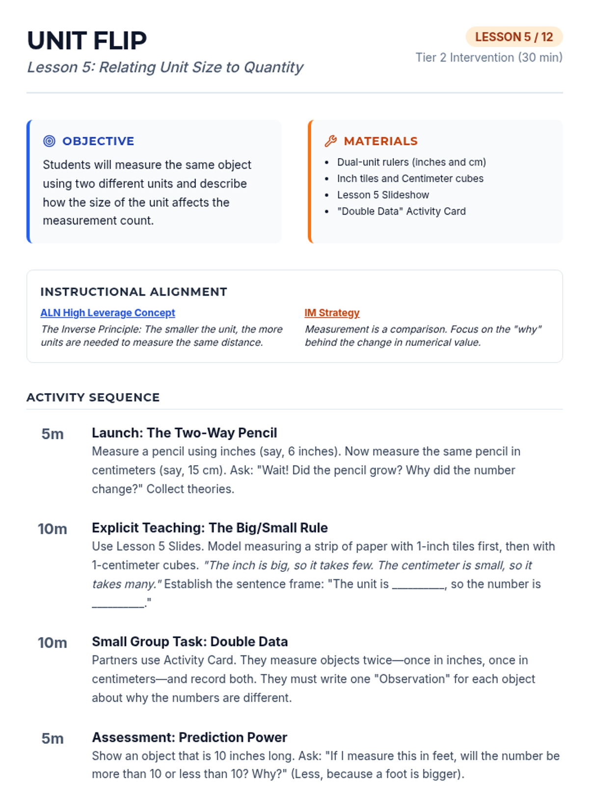 Investigates the relationship between unit size and the number of units needed to measure an object by measuring the same item twice with different units.